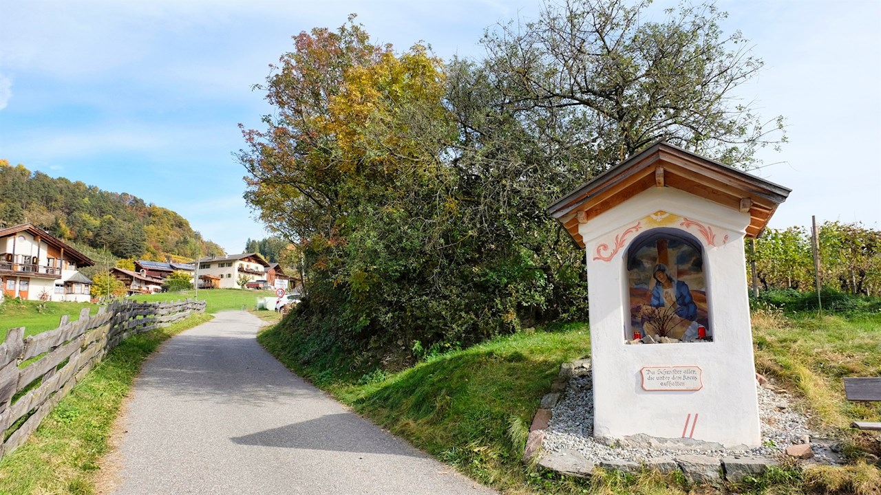 Hinter dem geschichtsträchtigen Buschenschank führt der Keschtnweg nahezu eben in das idyllische Dorf Feldthurns weiter, das einst Sommerresidenz der Brixner Bischöfe war und heute mit diversen Einkehrmöglichkeiten aufwartet.