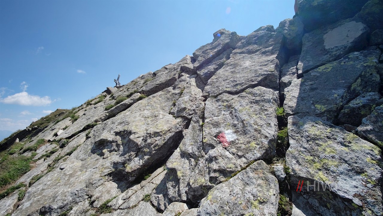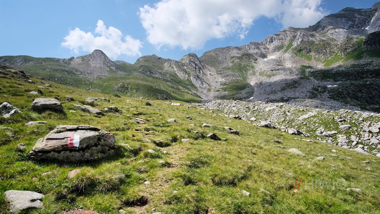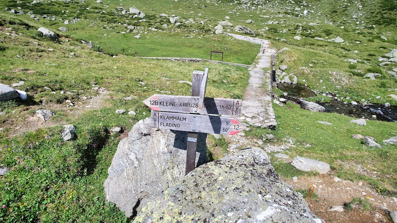 Bei einer steinernen Staumauer zweigt links der Wandersteig Nr. 12B zur Kleinen Kreuzspitze ab. Er führt im teils sanften, teils recht steilen Anstieg durch die weiten, mitunter steinbeschlagenen Bergwiesen, in denen sich bereits schöne Ausblicke auftun. Zuletzt führt er über die steile Felsflanke der Kleinen Kreuzspitze, die den Wanderern eine gewisse Trittsicherheit abverlangt. Insbesondere bei Nässe ist hier Vorsicht geboten.