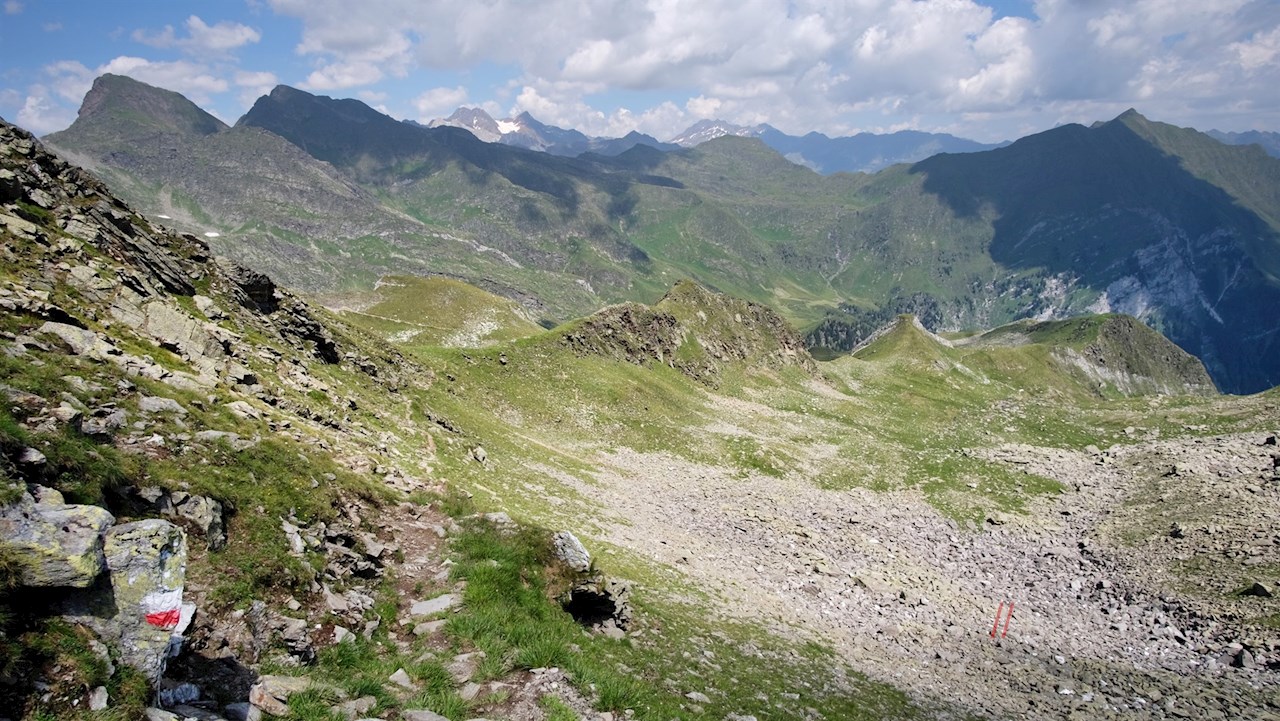 Neben dem eleganten Gipfelkreuz der Kleinen Kreuzspitze entfaltet sich schließlich ein ungemein weitreichender Ausblick auf die zahlreichen ringsum aufragenden Bergspitzen: Der Blick schweift von der Jaufenspitze über die Passeirer Bergwelt mit der nahen Hohen Kreuzspitze zu markanten Hochgipfeln wie dem Becher, dem Tribulaun oder dem Hochfeiler. Zu unseren Füßen schimmert indes der Übelsee, während sich weiter unten das Passeiertal und das Ratschingstal ausdehnen.