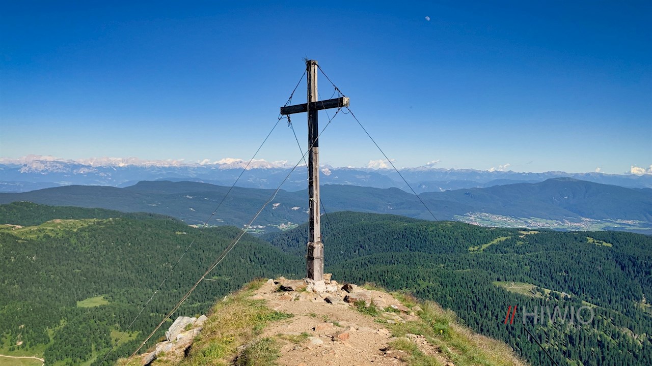 Neben seinem schlichten Gipfelkreuz entfaltet sich wenig später ein Panorama, das seinesgleichen sucht: Der Blick schweift vom nahen Laugen über die in der Ferne aufragenden Dolomiten zur Brenta- und Texelgruppe. Zu unseren Füßen erstrecken sich indes das Ultental auf der einen und das Nonstal auf der anderen Seite.