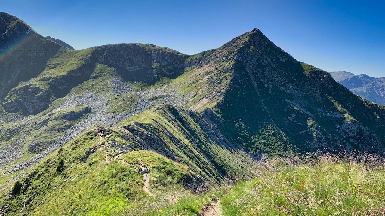 Allmählich steiler und steiniger werdend, steigt er schließlich auf die zwischen dem Großen und dem Kleinen Kornigl eingeschnittene Scharte an. Hier führt er nach rechts und zieht sich über den sanften Grat zum etwa zehn Minuten entfernten Gipfel des Kleinen Kornigl.