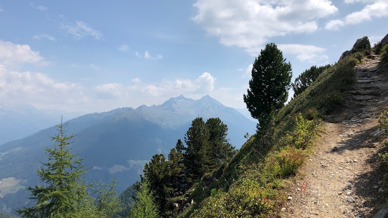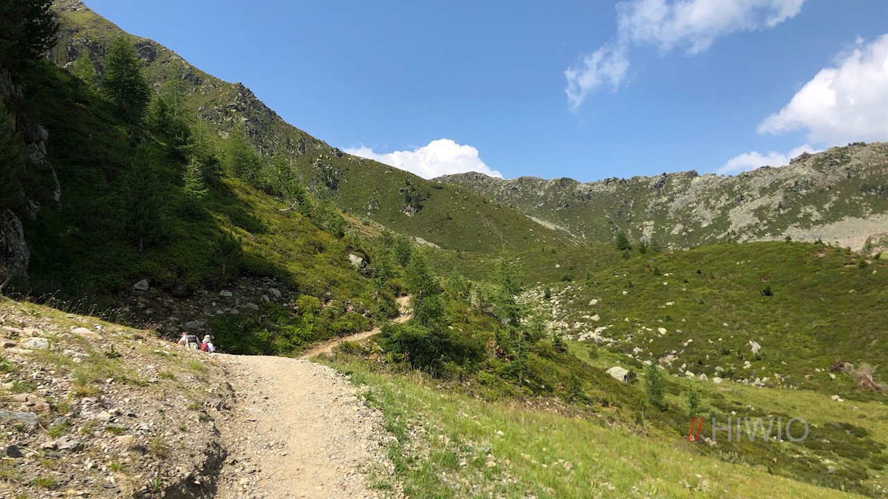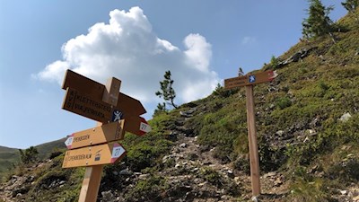 Der Rückweg erfolgt zunächst auf dem Aufstiegsweg in Richtung Klettersteig. Dann aber folgt man den Beschilderungen 27 Speikboden-Alm | Sand in Taufers.