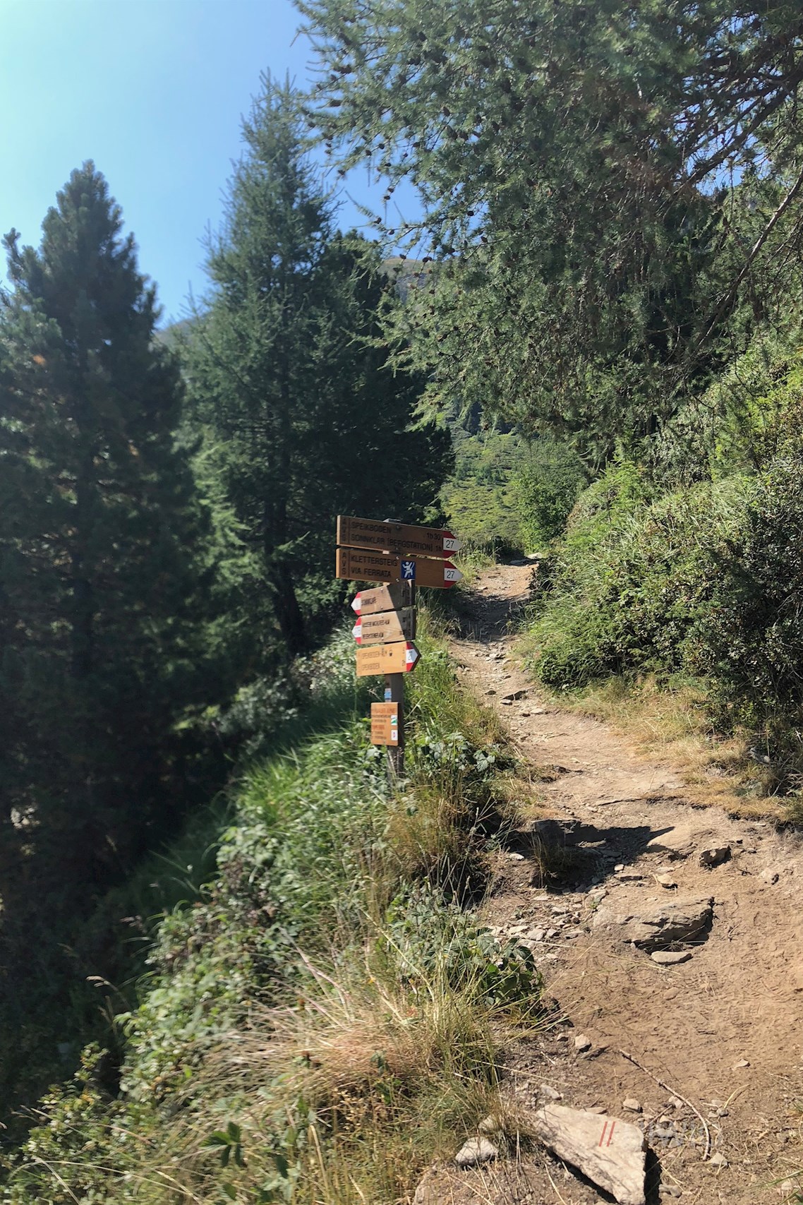 Der Klettersteig Speikboden ist in 8 Abschnitte gegliedert, welche durch kleine Nummerierungschilder gekennzeichnet sind. Der erste Abschnitt, der mit Stifttreppen beginnt und recht steil ist, ist ein wenig kraftaufwändig.