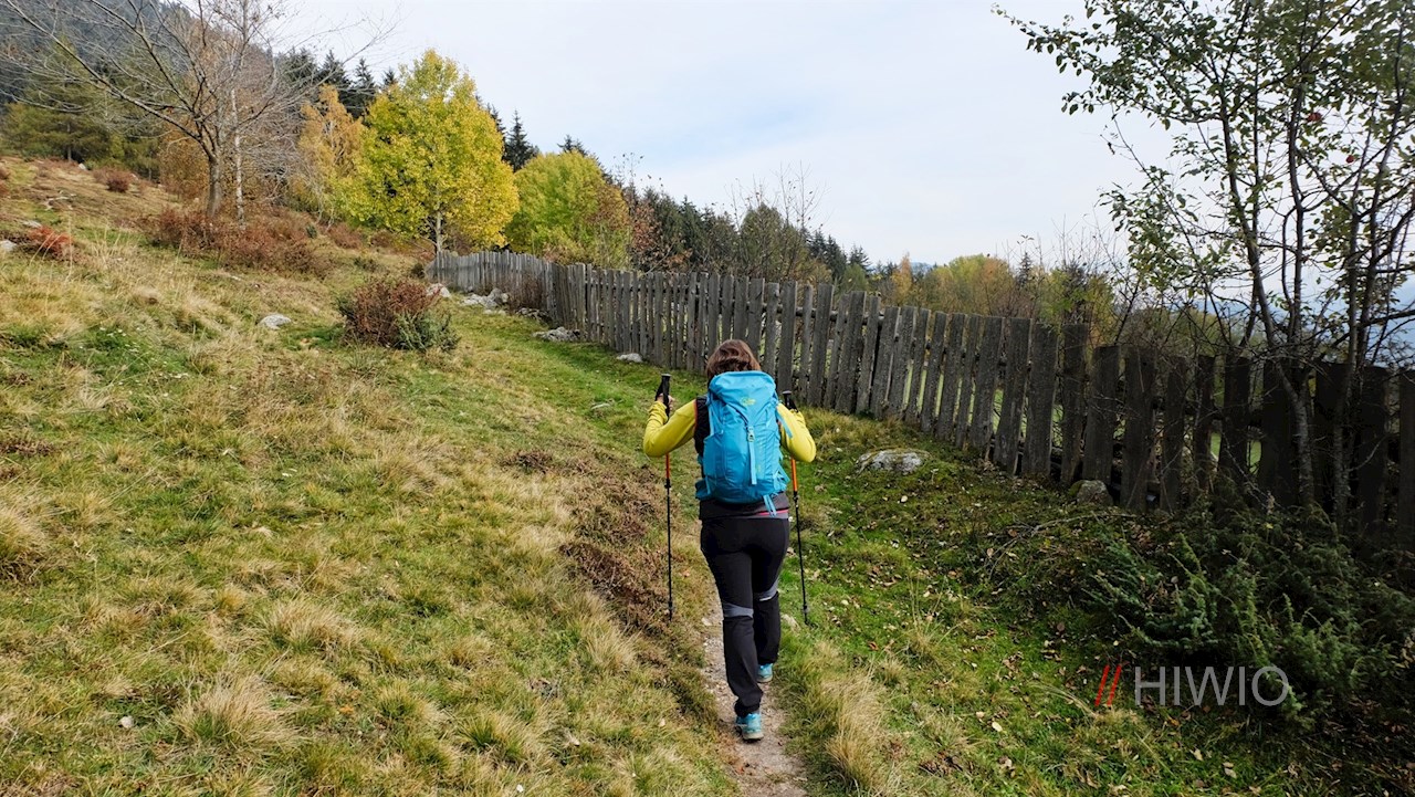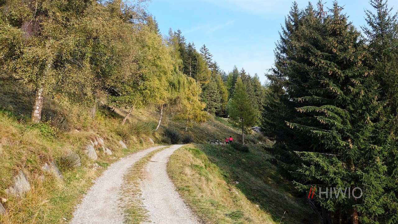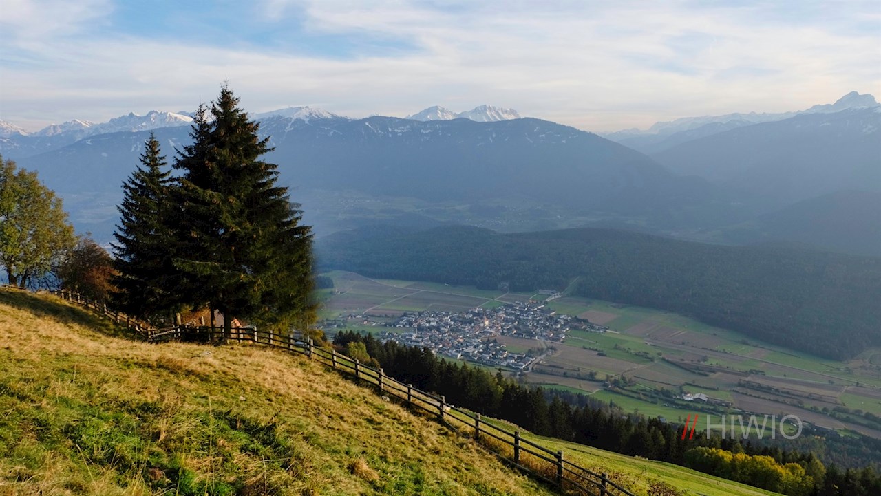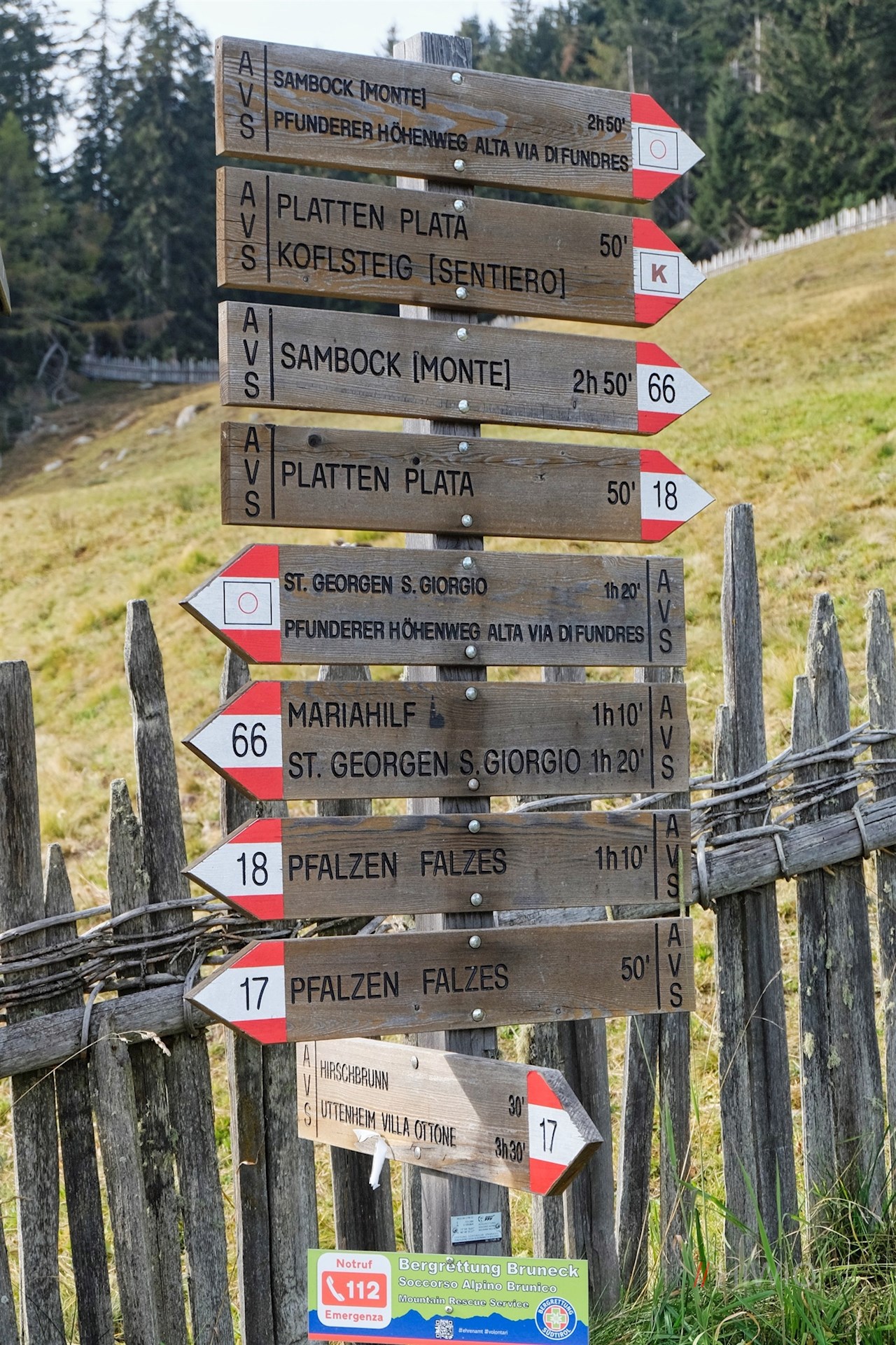 Nach etwa 50 Minuten sanften Wanderns erreicht man den Bergweiler Platten, in dem das Wanderschild Nr. 19 den Weg nach Pfalzen weist. Er führt im teils recht steilen Abstieg durch aussichtsreiche Wiesen und später durch den harzduftenden Wald zum Ausgangspunkt in Pfalzen zurück.