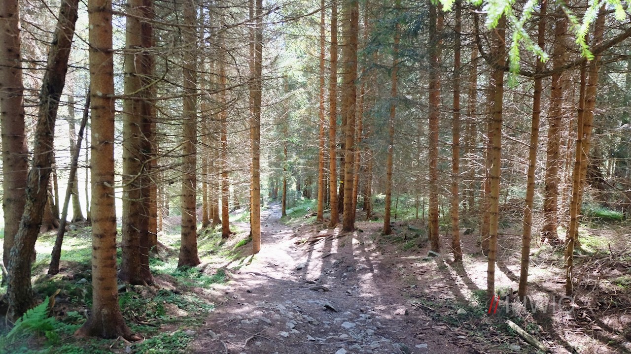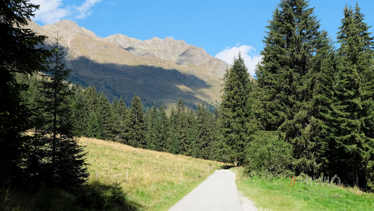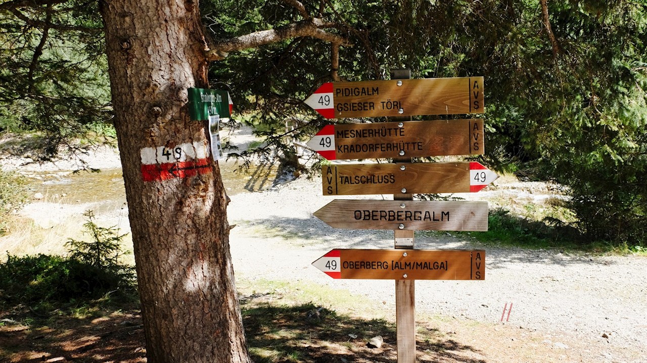 Hier schlägt man den breiten, asphaltierten Weg Nr. 49 in Richtung Kradorfer Alm und Messnerhütte ein. Leicht ansteigend, taucht er alsbald in einen schattenverheißenden Wald ein.