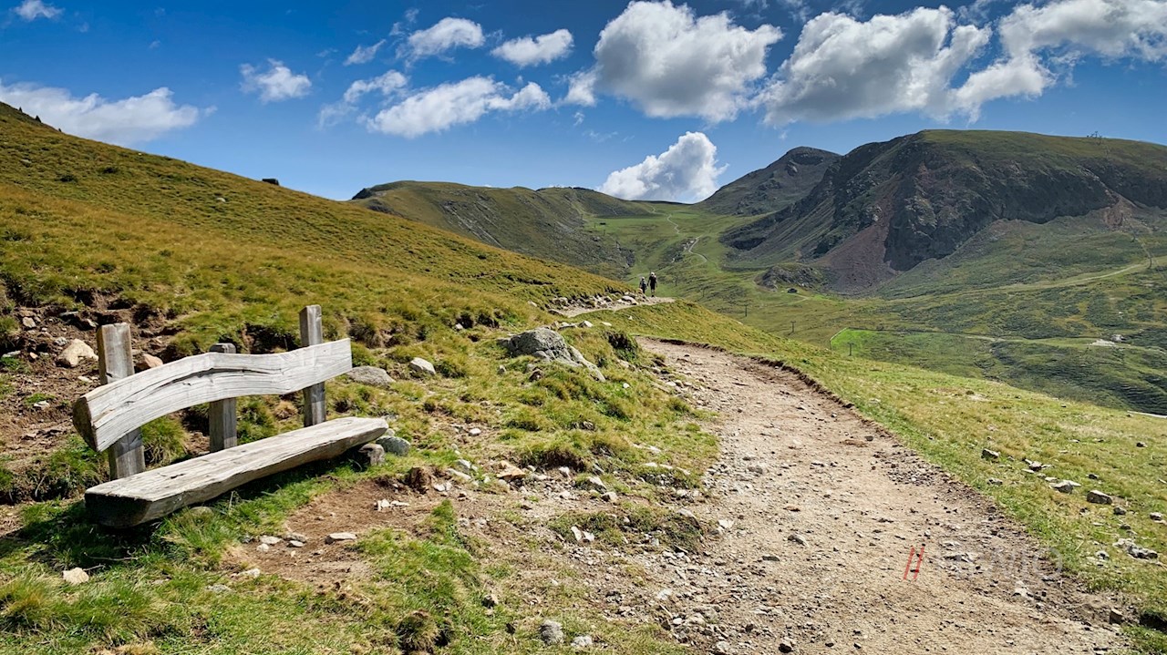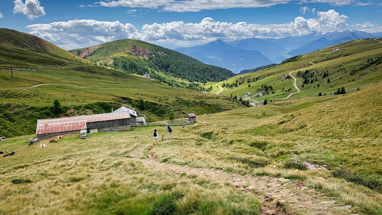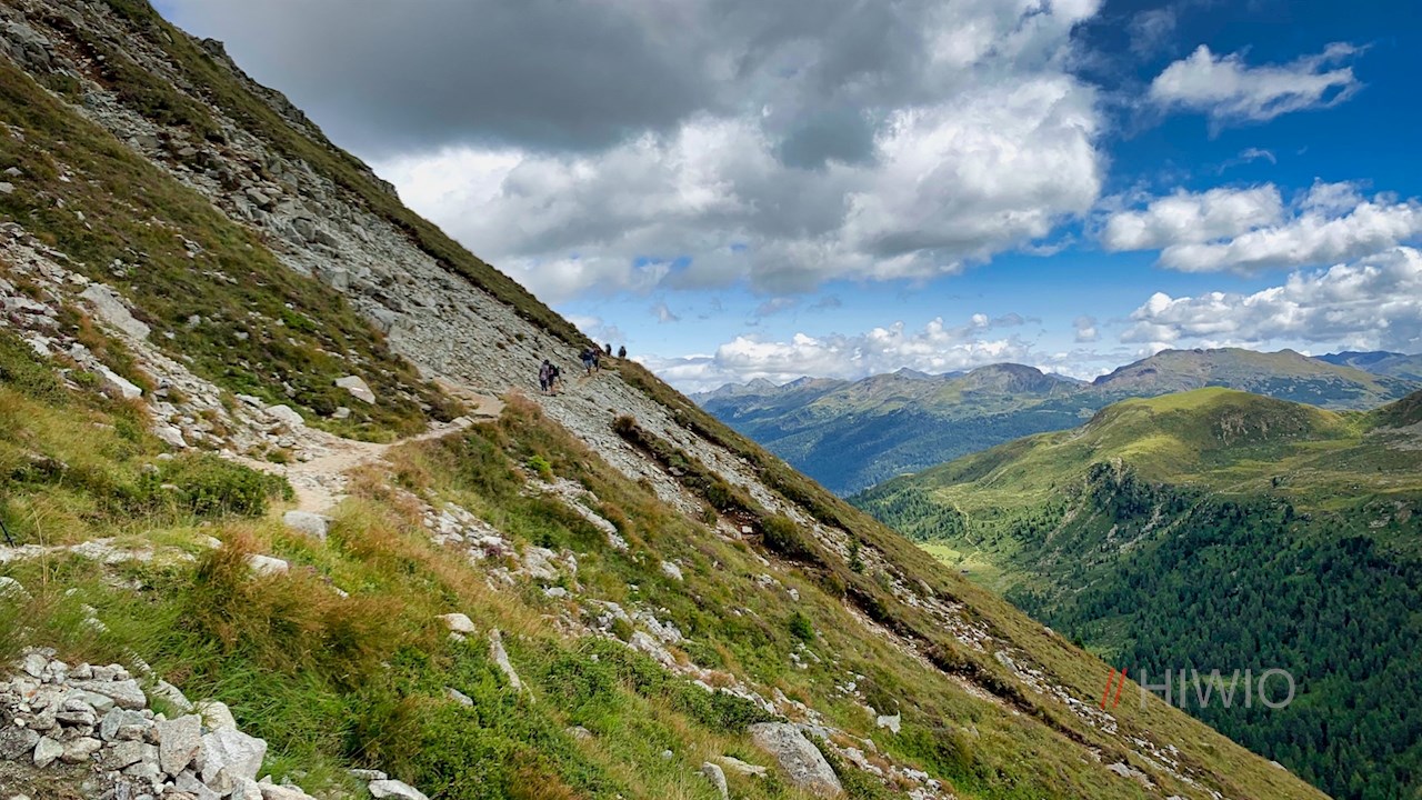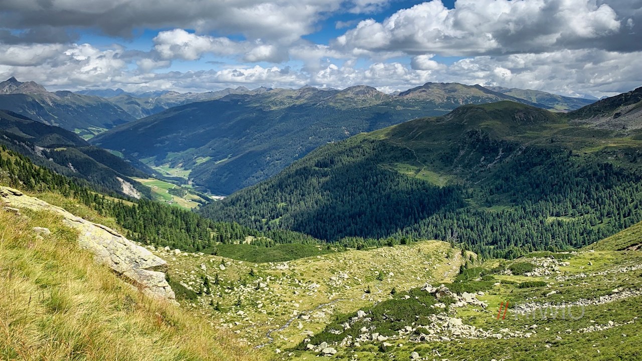 Er quert im sanften Auf und Ab die steil abfallenden, von Geröll und Granitblöcken durchsetzten Grashänge und öffnet dabei malerische Ausblicke ins Sarntal.