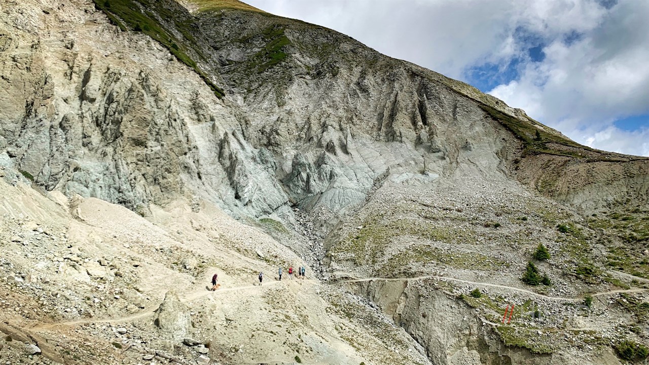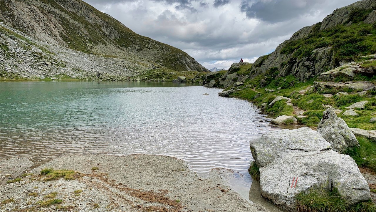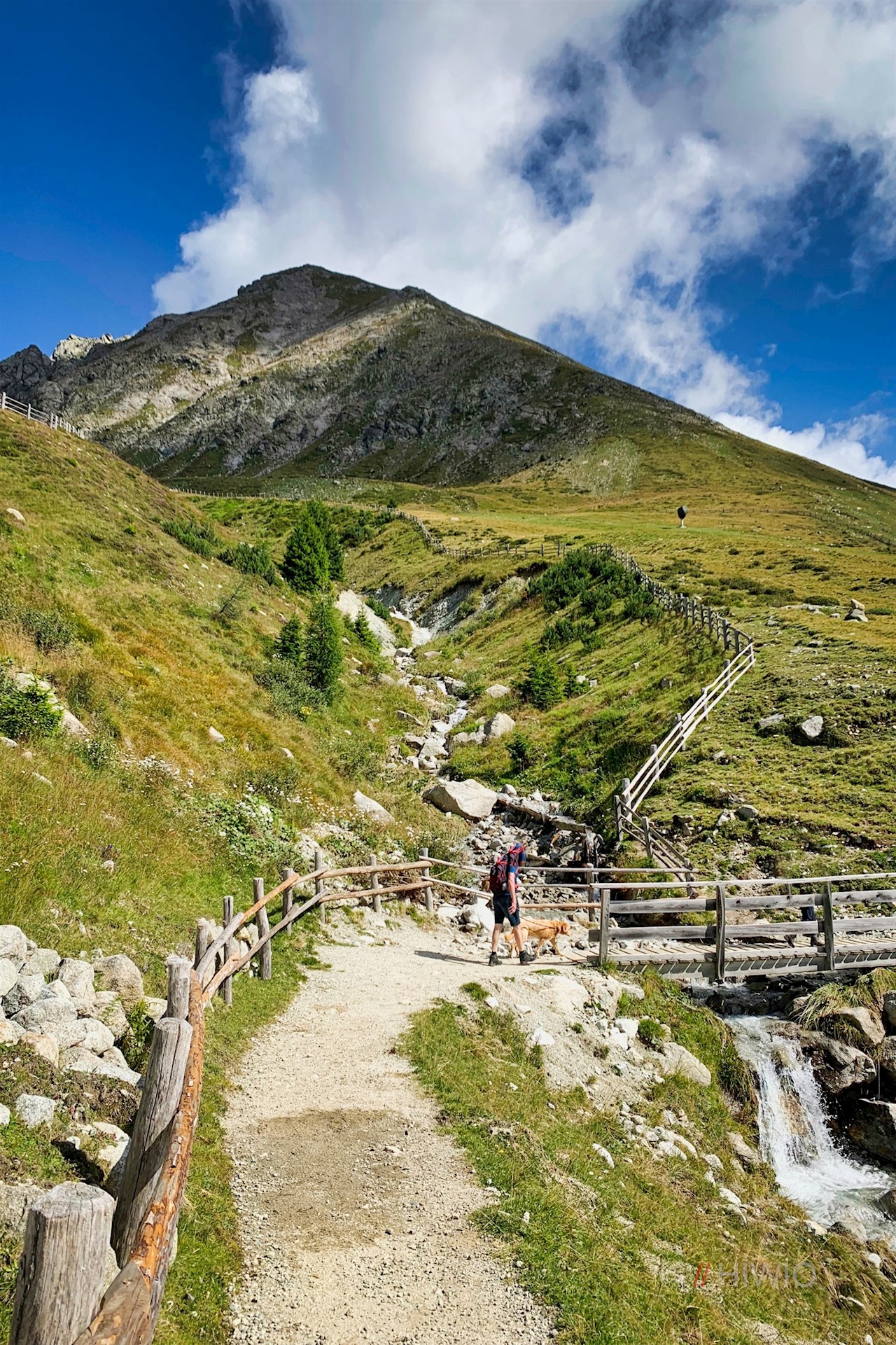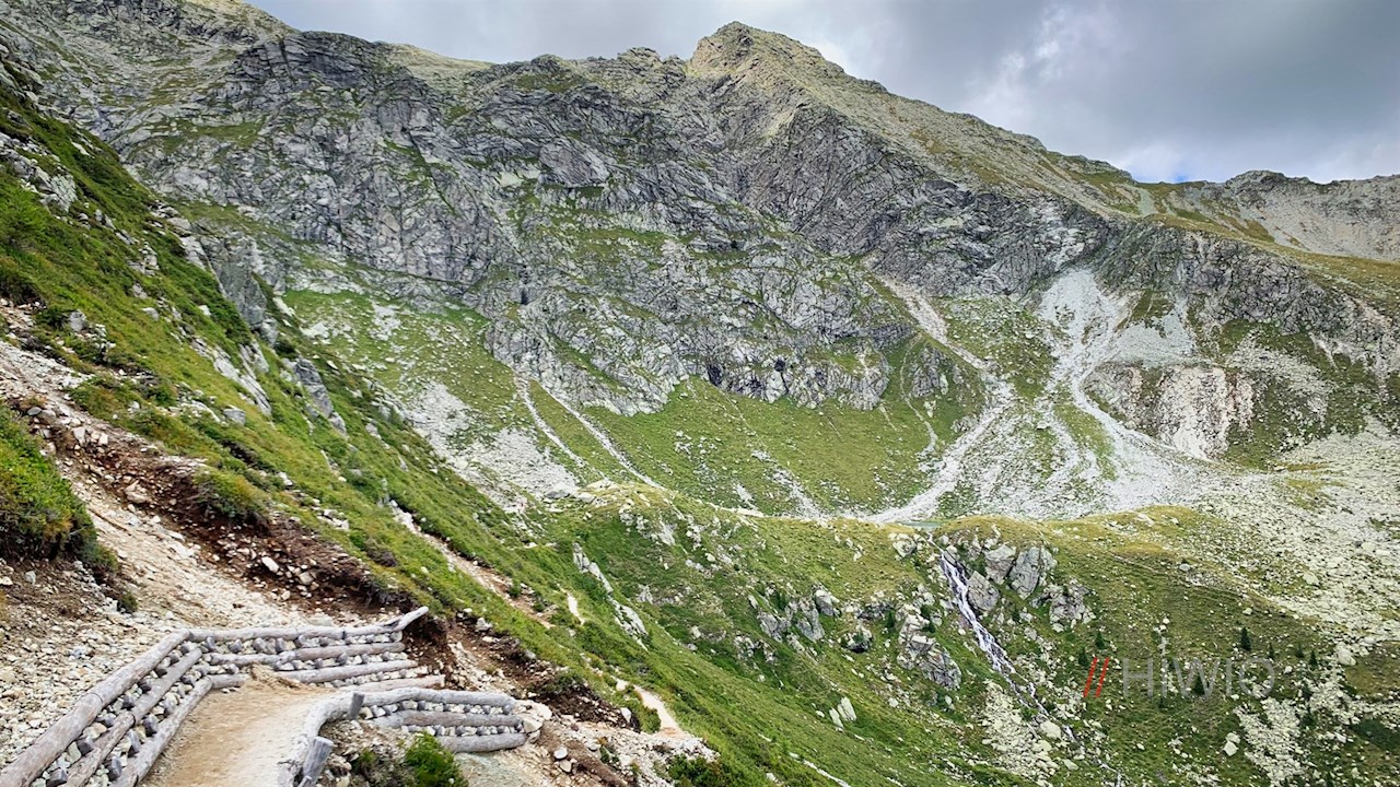 Er quert im sanften Auf und Ab die steil abfallenden, von Geröll und Granitblöcken durchsetzten Grashänge und öffnet dabei malerische Ausblicke ins Sarntal.