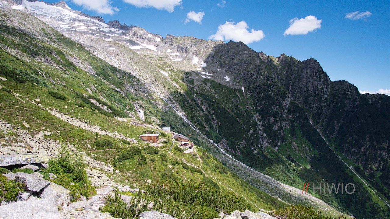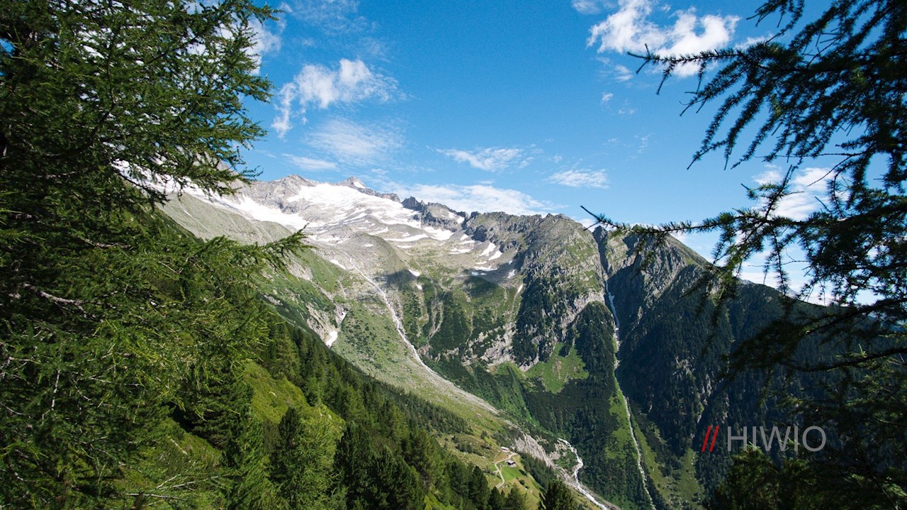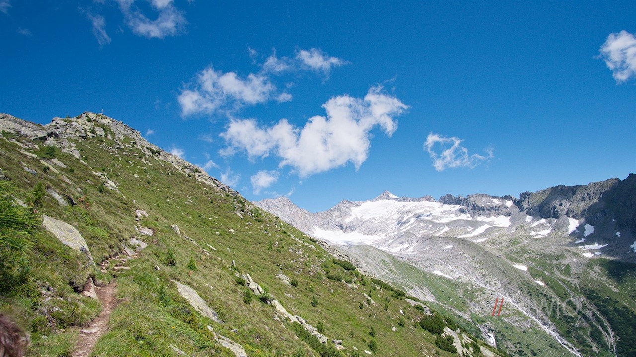 Auf der kleinen Steinbank zu Füßen des gekreuzigten Jesus eröffnet sich schließlich ein weitreichendes Panorama: Während sich hinter uns eine schneeweiße Gletscherwelt mit dem imposanten Schwarzenstein, der Floitenspitze und der Trippachspitze erhebt, ragen vor uns die Durreck- und die Rieserfernergruppe auf. Zu unseren Füßen liegen indes das Ahrntal und das Pustertal.