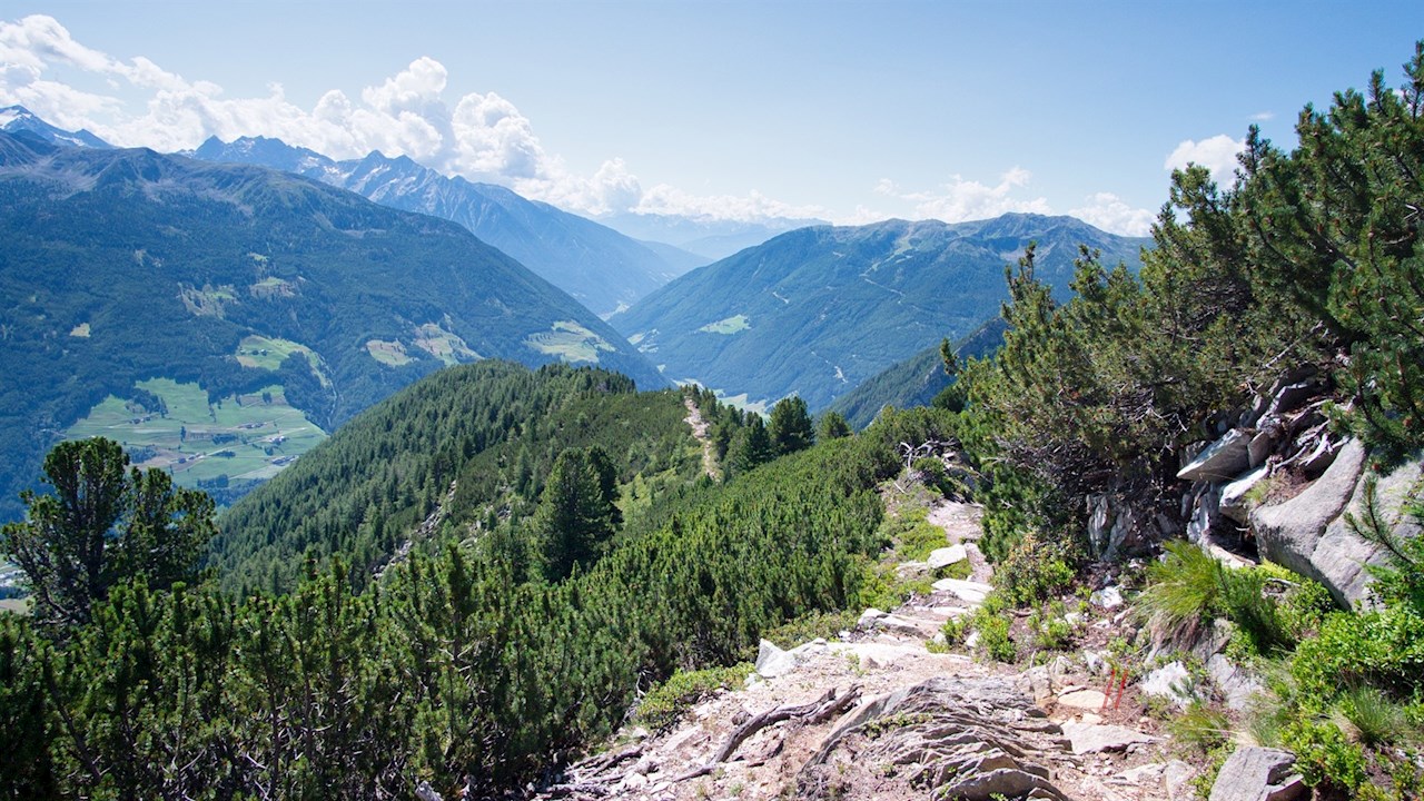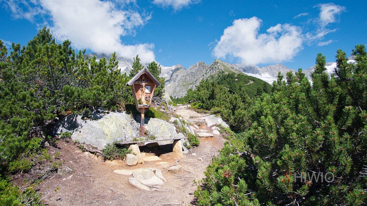 Nahe der Waldgrenze führt er teils eben, teils sanft ansteigend zu einem Wegkreuz samt Sitzbank, bei dem man erstmals einen Blick auf den spitz zulaufenden Kreuzkofel und die dahinter liegende Gletscherwelt erhascht.