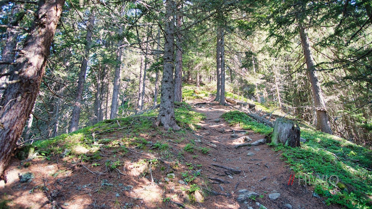 Hier zweigt der Wanderweg Nr. 21 in Richtung Kreuzkofel (Höhenweg) ab, der zunächst steil durch den dichten, wurzelbeschlagenen Nadelwald ansteigt.