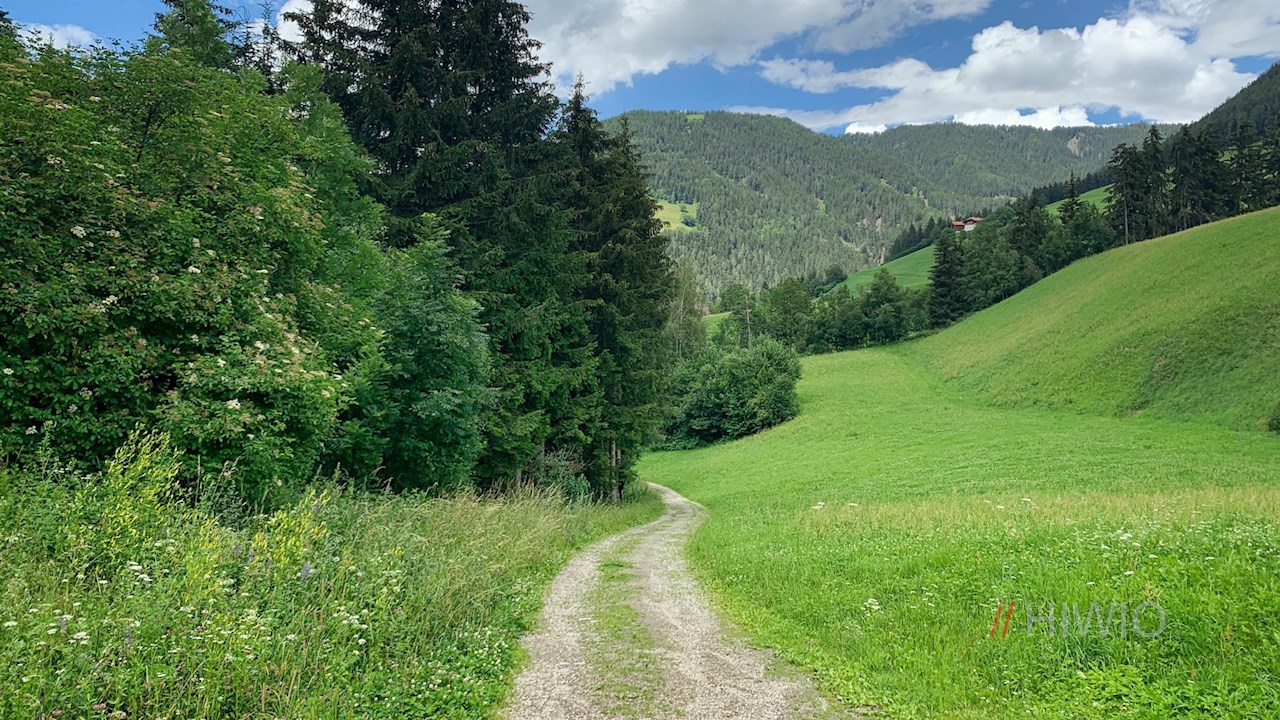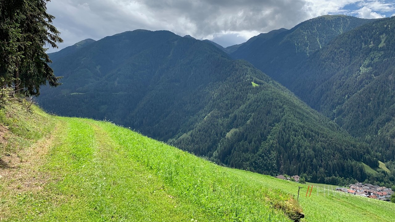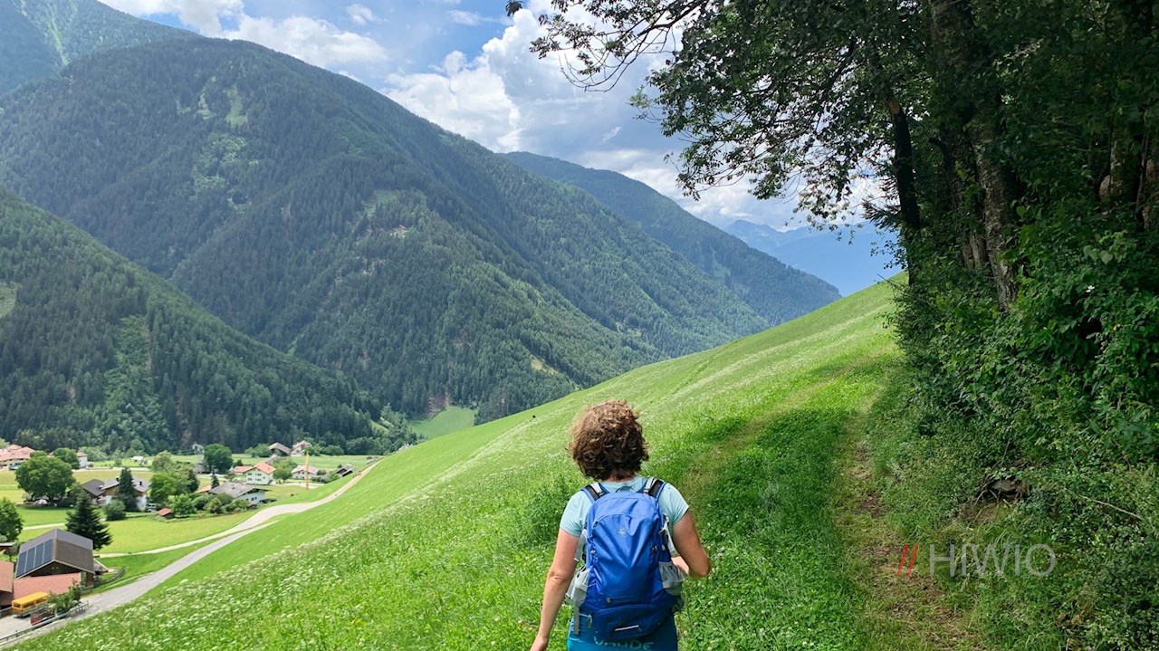 Vom Sorgenhof führt der Panoramaweg am Kinderhotel Sonnwies und einigen Höfen vorbei und taucht wenig später in einen Wald ein, der ab und an schöne Ausblicke auf Lüsen und seine Bergwelt eröffnet.
