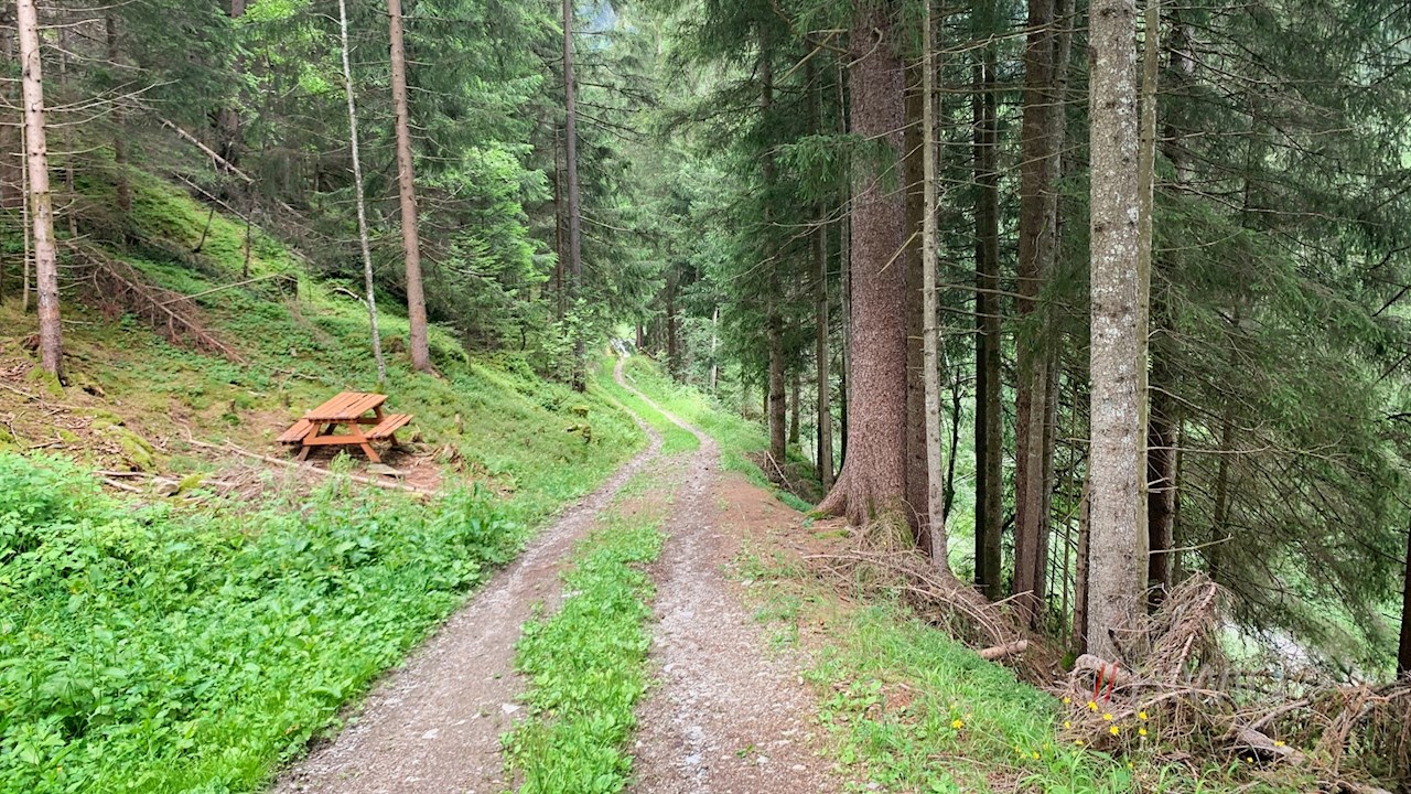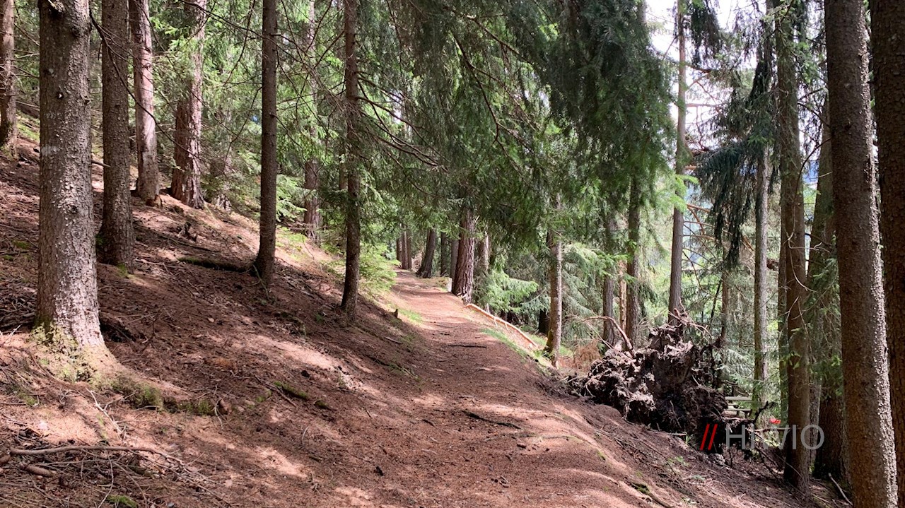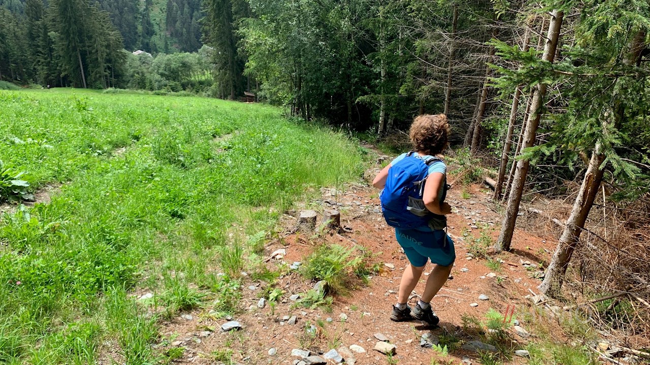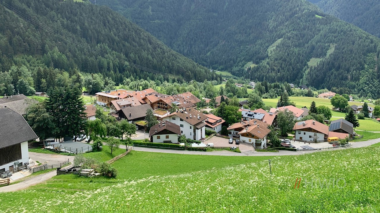 Vom Sorgenhof führt der Panoramaweg am Kinderhotel Sonnwies und einigen Höfen vorbei und taucht wenig später in einen Wald ein, der ab und an schöne Ausblicke auf Lüsen und seine Bergwelt eröffnet.