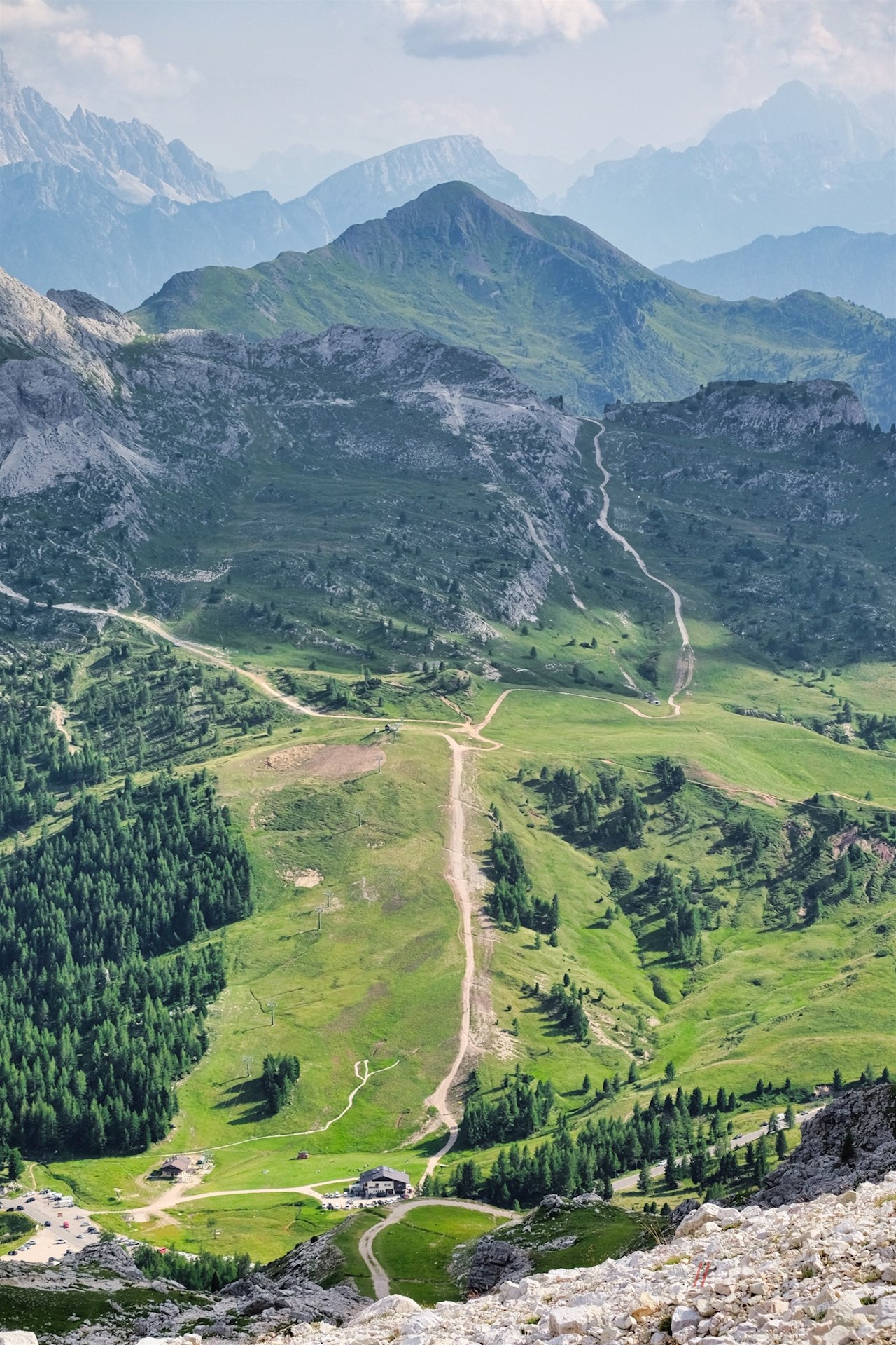 Der Wegnummer 402 in Richtung Lagazuoi folgend, steigt der großenteils breite Schotterweg zunächst im steten Anstieg über die verwaiste Schipiste auf die Forcella Travenanzes an. Während des Anstiegs öffnen sich bereits schöne Ausblicke auf die ringsum aufragenden Dolomiten.