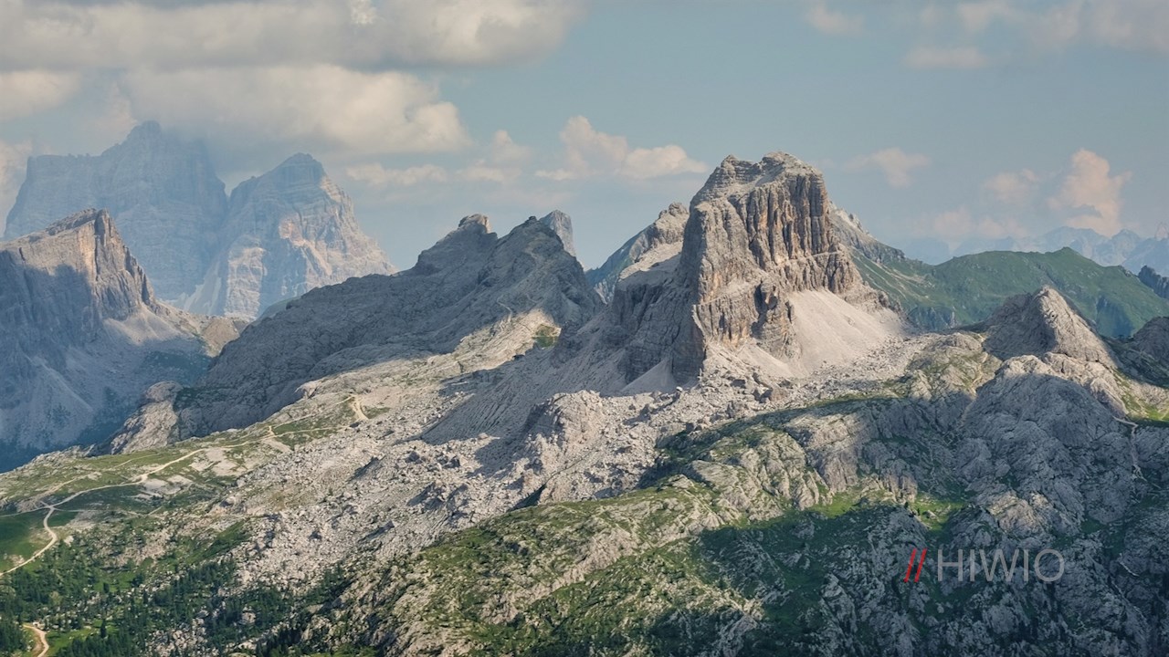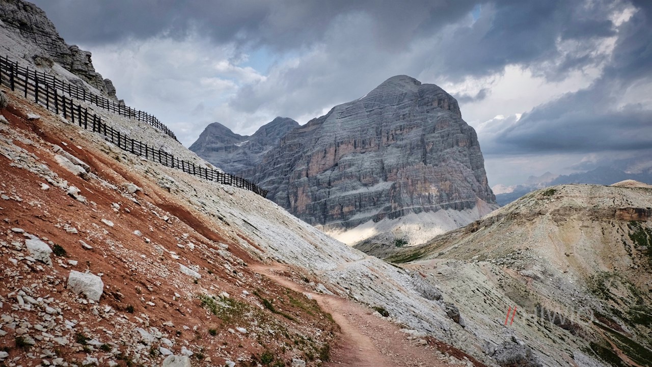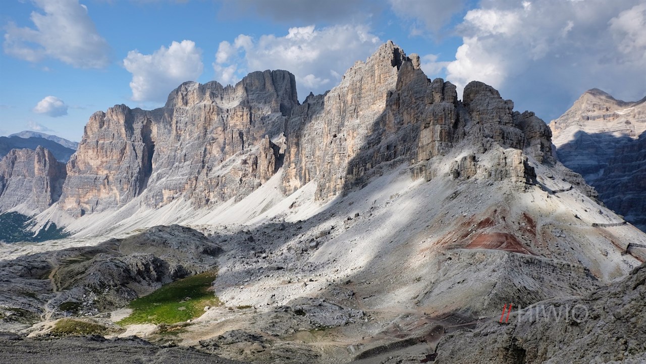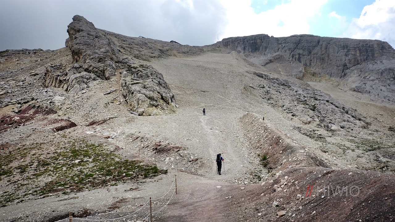 Auf der 2.507 m hohen Scharte zweigt links der Wanderweg Nr. 401 ab. Mit der imposanten Tofana di Rozes im Rücken quert er zunächst im sanften Anstieg die geröll- und schotterbeladenen Hänge und steigt dann in zahlreichen Serpentinen zur Lagazuoi Hütte an. Unterwegs kommt man an einer ehemaligen Offiziersbaracke und mehreren Wachtposten der Kaiserjäger vorbei, die an den grausamen Gebirgskrieg im Ersten Weltkrieg erinnern.
