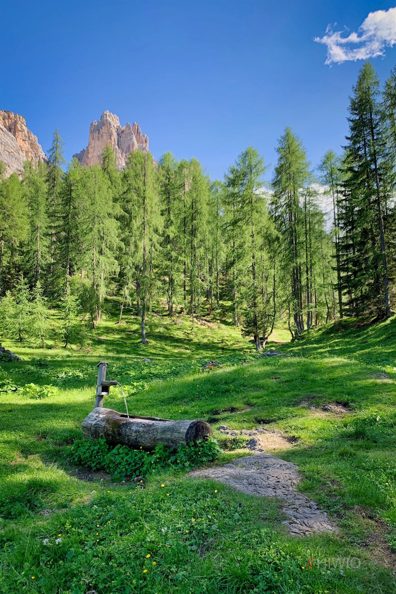 Nach etwa 350 bewältigten Höhenmetern gelangt man zu einer kleinen, von den zerklüfteten Felswänden des Ciadenes umrahmten Lichtung, in der ein Brunnen erfrischende Abkühlung verheißt. Hier geht die Wanderung in einen schmaleren Steig über.
