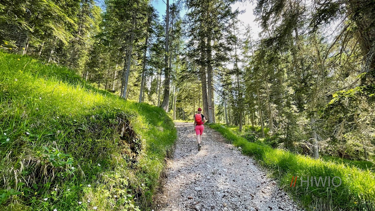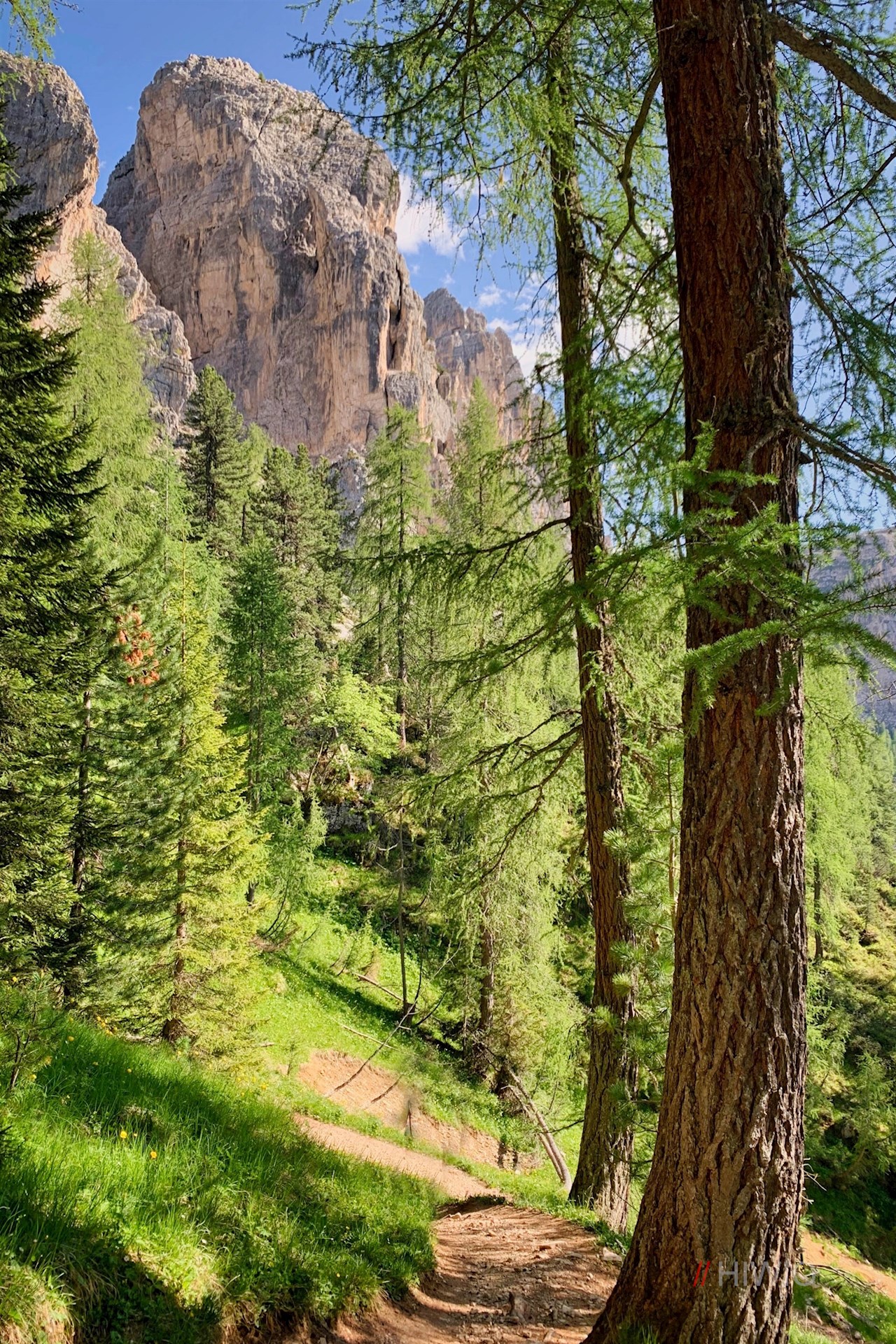 Stets der Wegnummer 434 in Richtung Rif. Croda da Lago/G. Palmieri folgend, führt die Wanderung zunächst nahezu eben den rauschenden Ra Costeana entlang. Alsbald steiler werdend, steigt der breite Schotterweg schließlich steil durch den lichten Wald an, der hie und da schöne Ausblicke auf die majestätische Tofana freigibt.