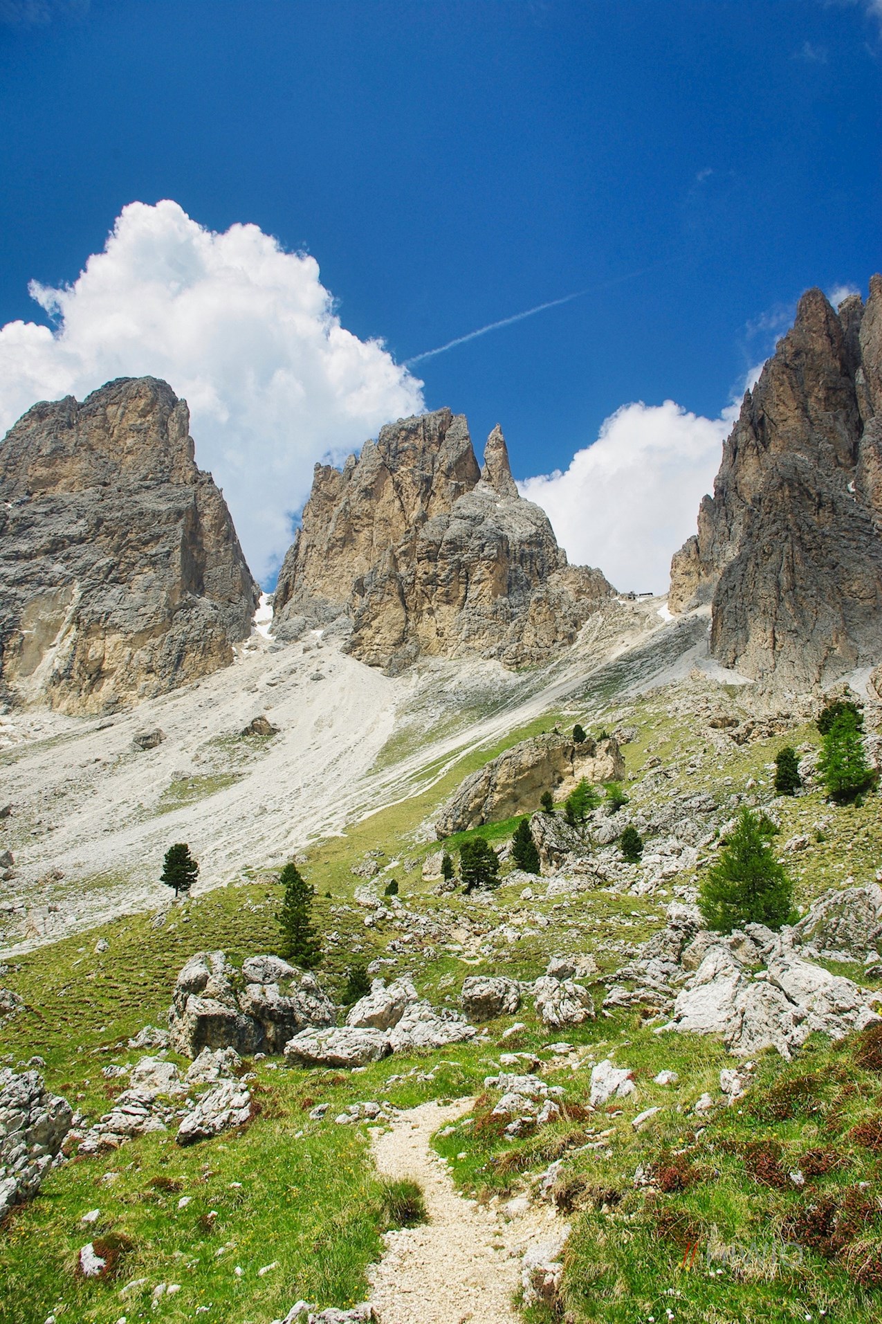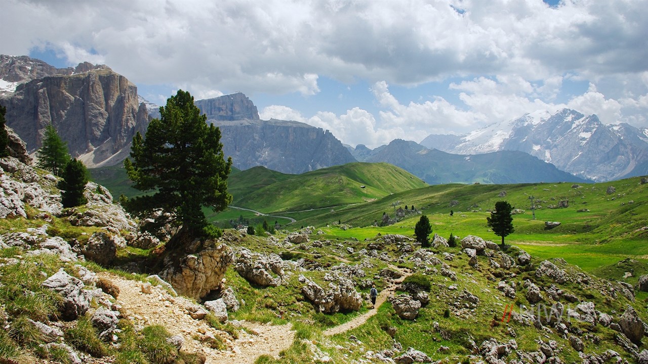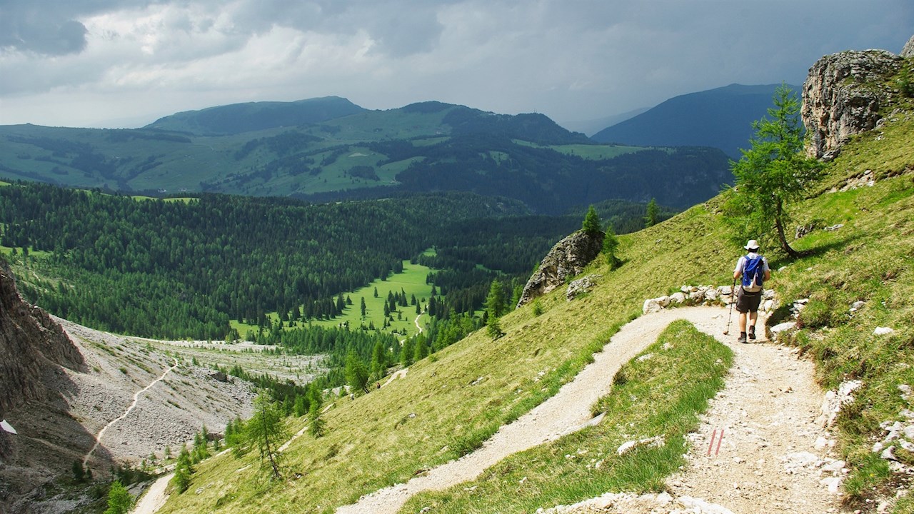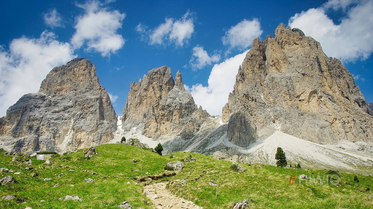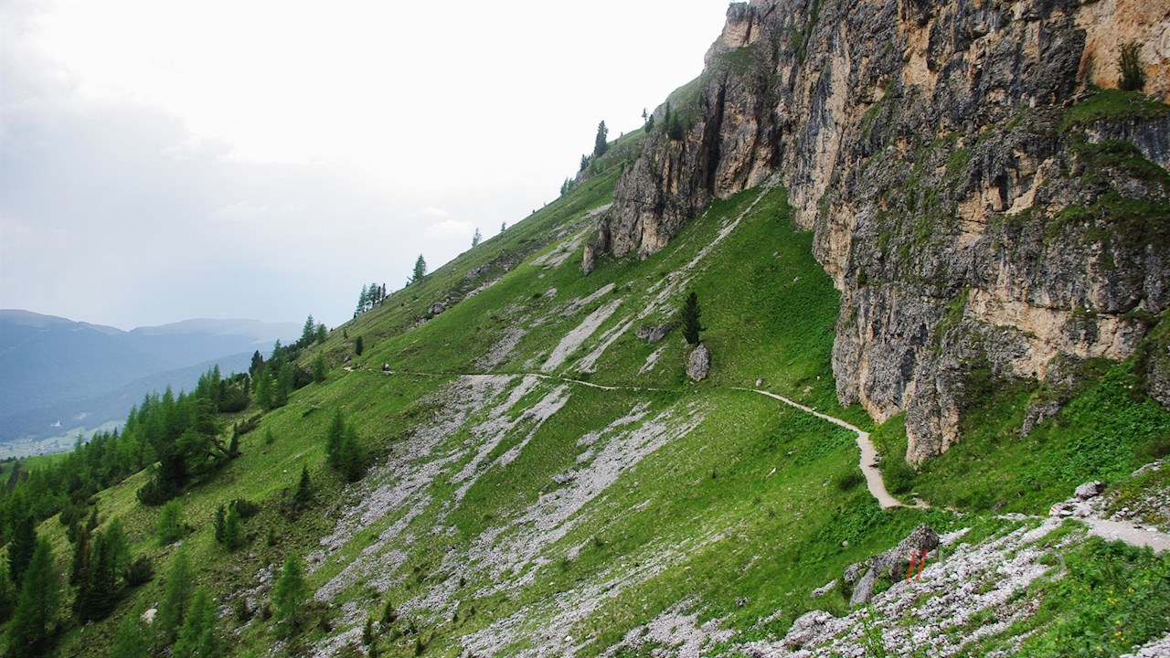 Hier folgt man dem anfangs recht breiten Wanderweg Nr. 525, der zunächst im sanften Anstieg durch die grünen Wiesen unterhalb der hochaufragenden Felswände des Langkofelmassivs führt.