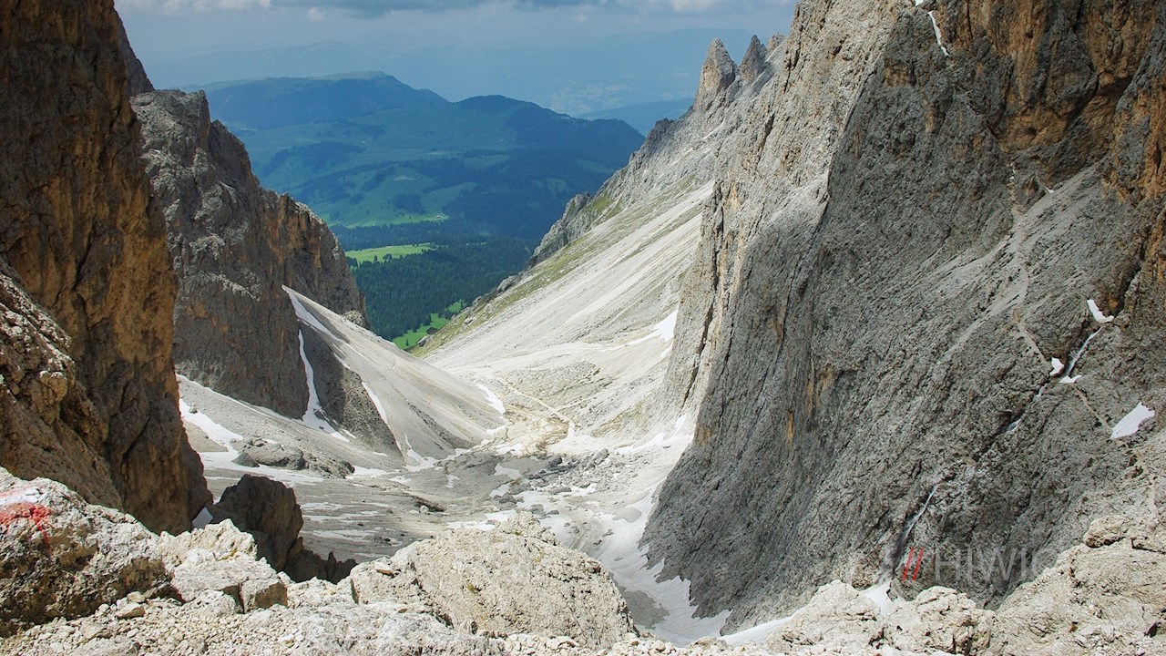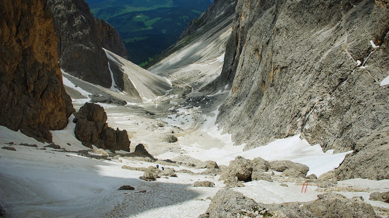 Weiterhin dem nunmehr geröll- und schotterbeladenen Weg Nr. 525 folgend, führt die Wanderung nun durch das von mächtigen Felswänden umschlossene Langkofelkar in Richtung Langkofelhütte hinab. Unterwegs trifft man zumeist auf einige Schnee- und Firnfelder. Nicht zuletzt auch deshalb erfordert dieser Abschnitt etwas Trittsicherheit.