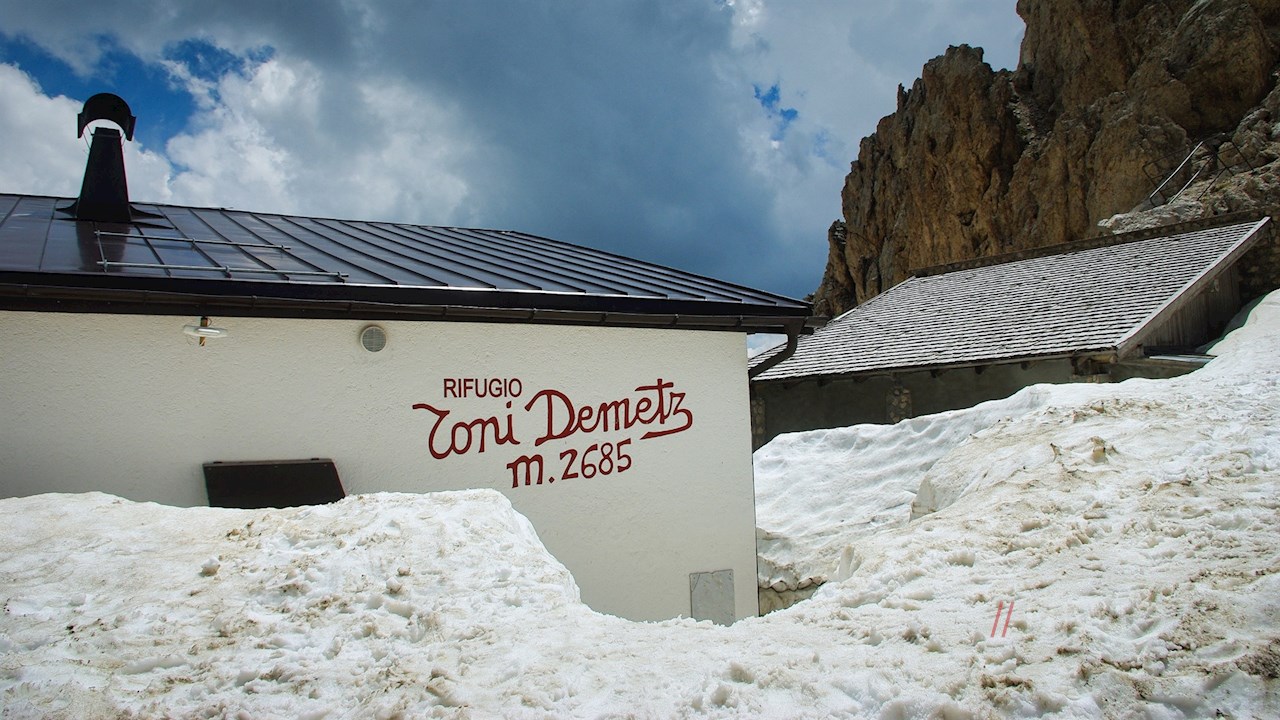 Allmählich gestalten sich die Hänge karger und steiler. Schließlich windet sich der serpentinenförmige Pfad ziemlich steil zur Toni-Demetz-Hütte hoch, die zwischen den Felswänden des Langkofel und der Fünffingerspitze auf der Langkofelscharte thront.