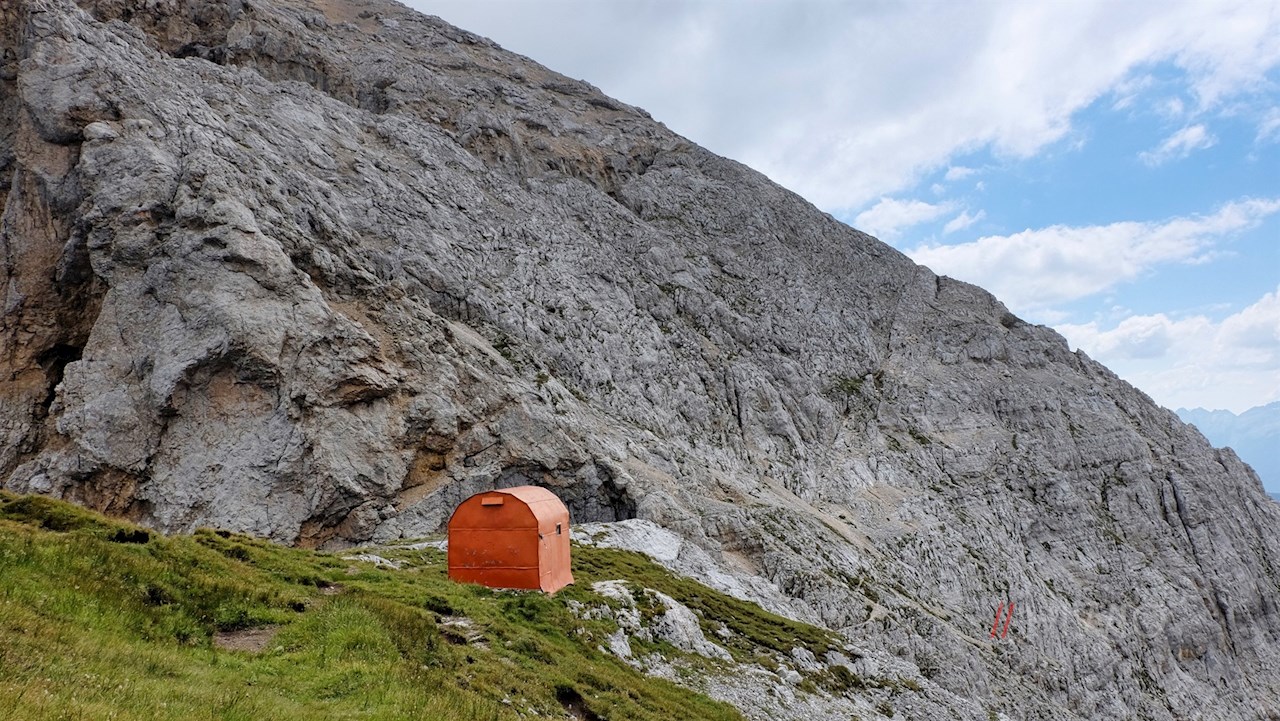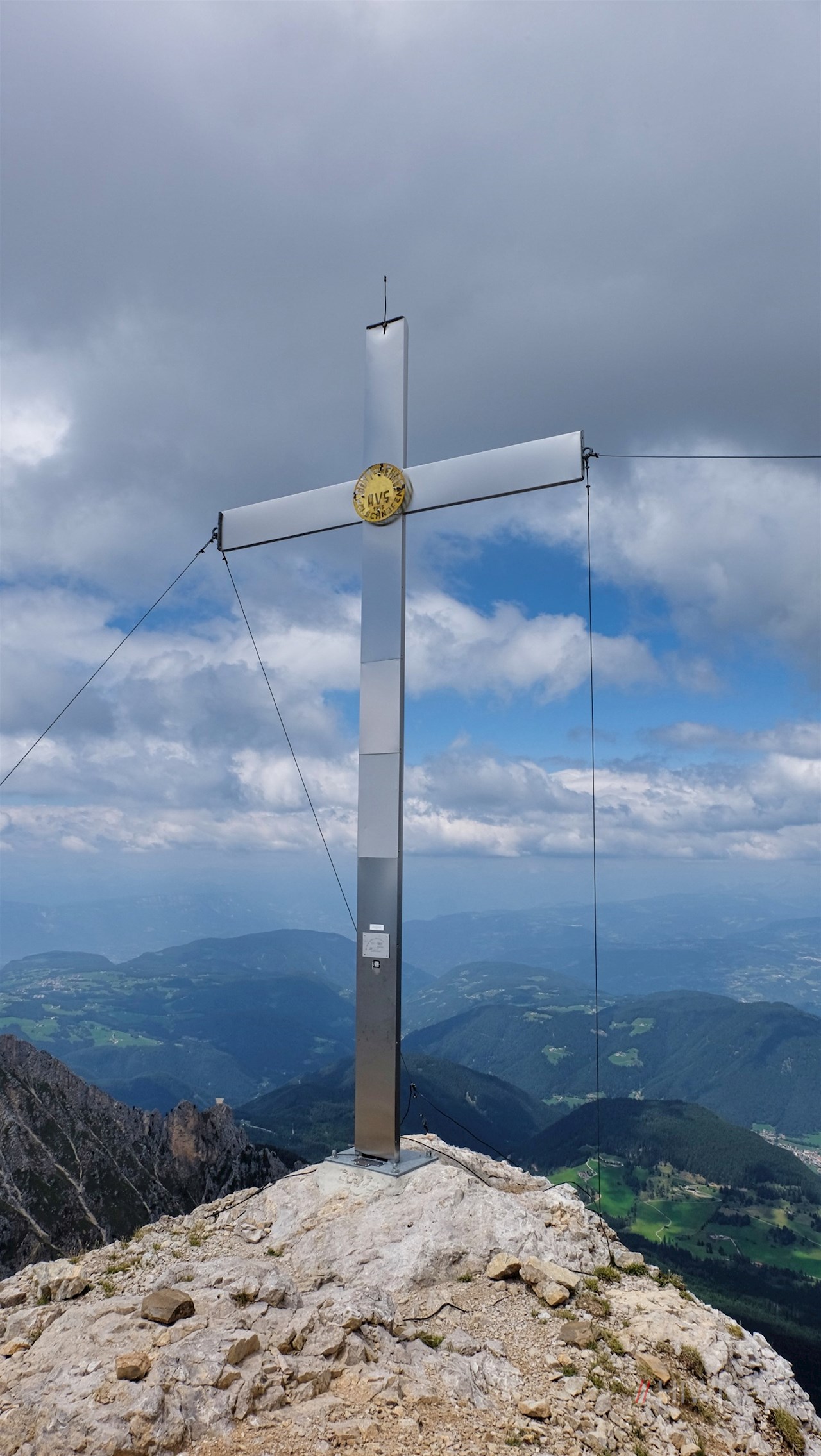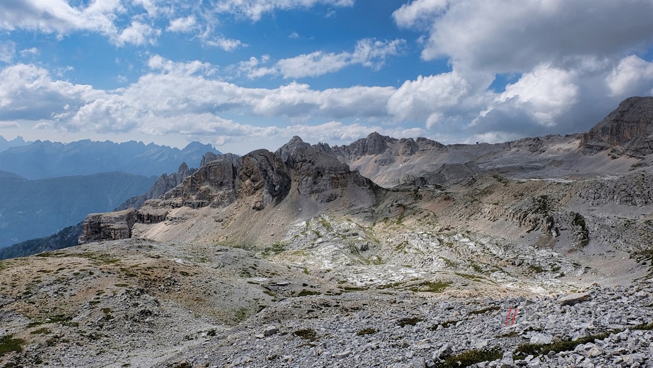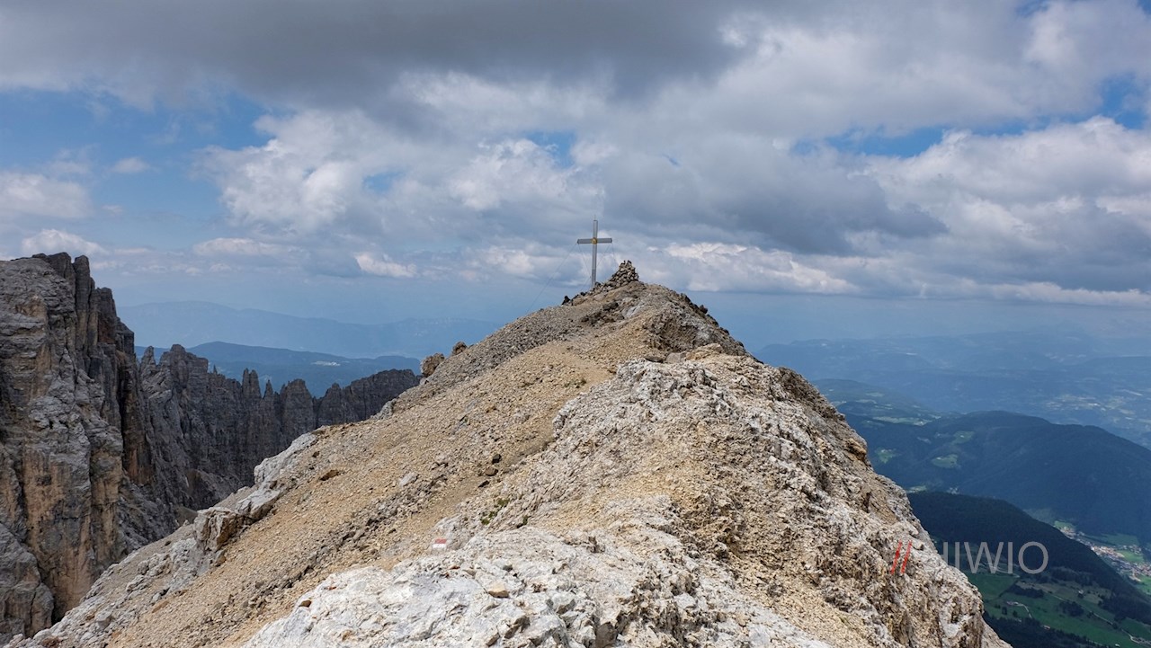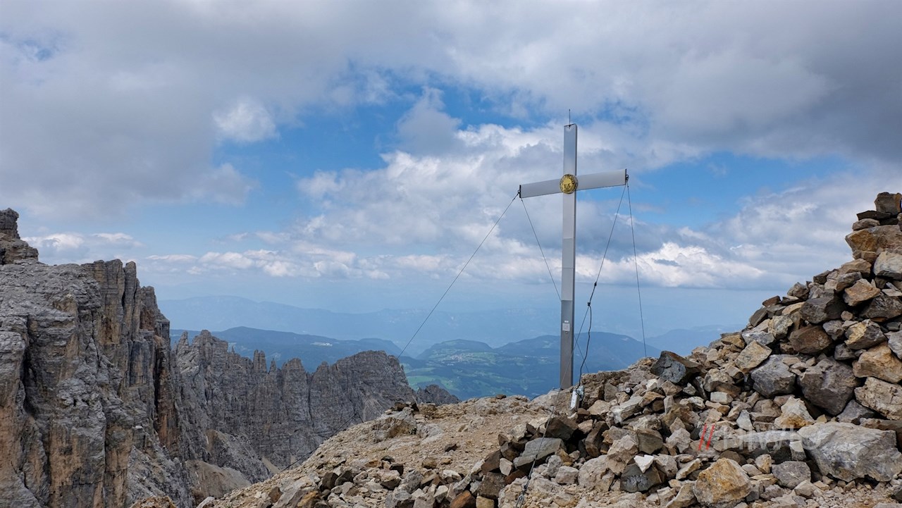 Schließlich steigt er zum orangefarbenen Rigatti-Biwak zu Füßen der Östlichen Latemarspitze an. Nun folgt der etwas mühsame Anstieg über die schrofige, geröllbeladene Gipfelflanke. Neben dem eleganten Gipfelkreuz werden die Mühen des Aufstiegs mit einem umwerfenden Panoramablick belohnt. Insbesondere der Rosengarten und die Trientner Dolomiten stechen ins Auge.