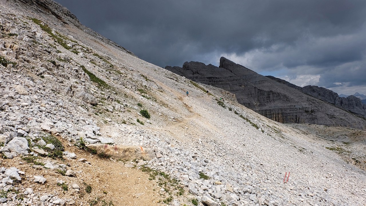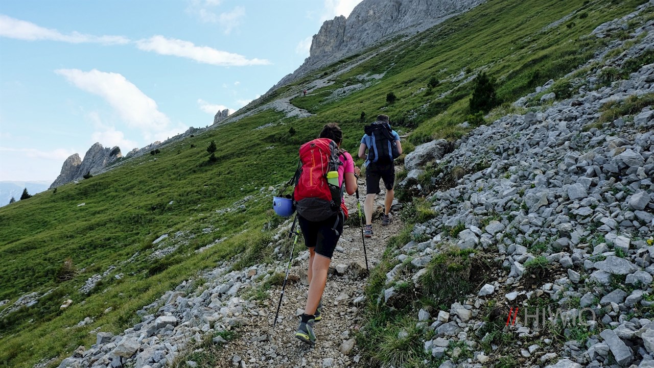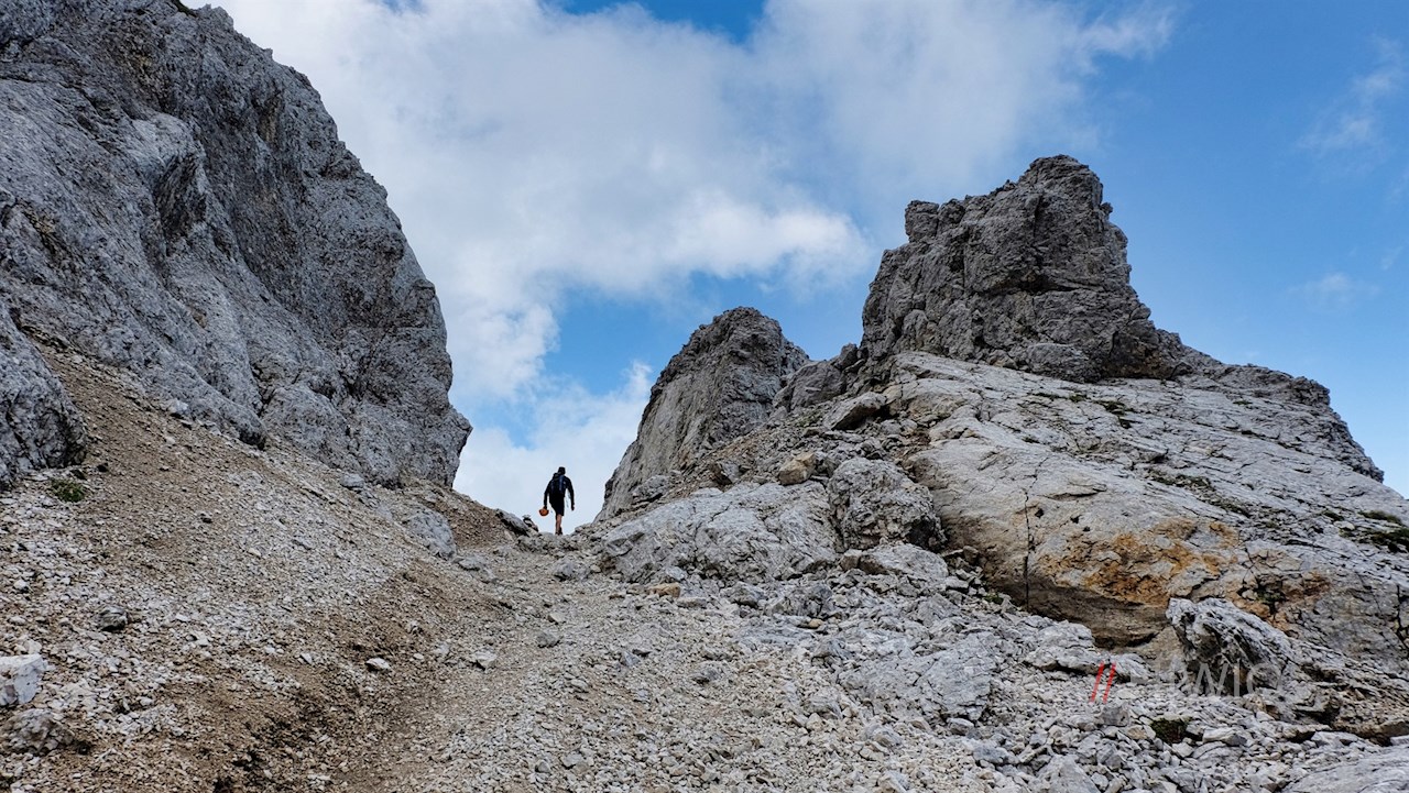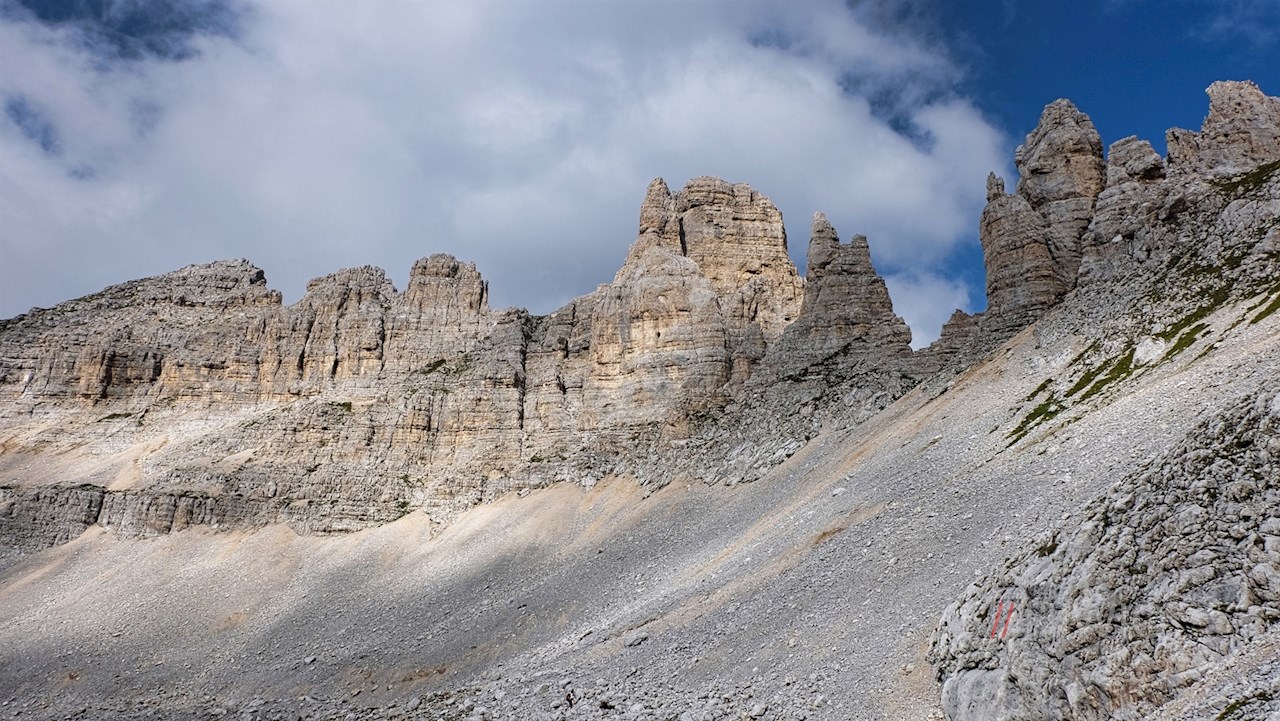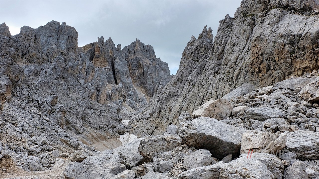 Nach einem kurzen Abstieg zweigt rechts der Weg Nr. 516 zur Latemarhütte / Rifugio Torre di Pisa ab. Wir aber folgen weiterhin dem nunmehr nahezu ebenen Weg Nr. 18, den wir auch an der nächsten Weggabelung beibehalten. Während der links abzweigende Klettersteig „Via Ferrata Campanili del Latemar“ eine entsprechende Ausrüstung voraussetzt, quert dieser schmale Panoramaweg zunächst den schottrigen Hang unterhalb der zerklüfteten Spitzen der Latemartürme.
