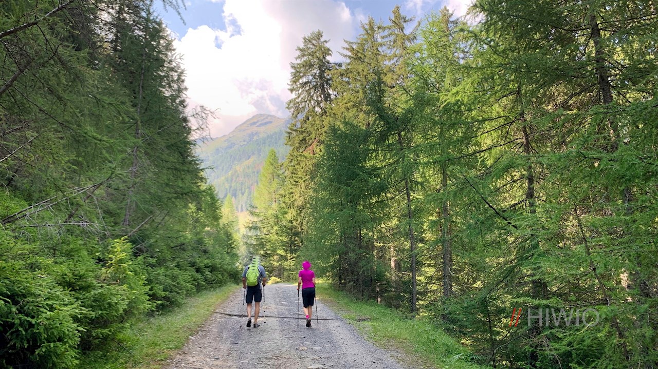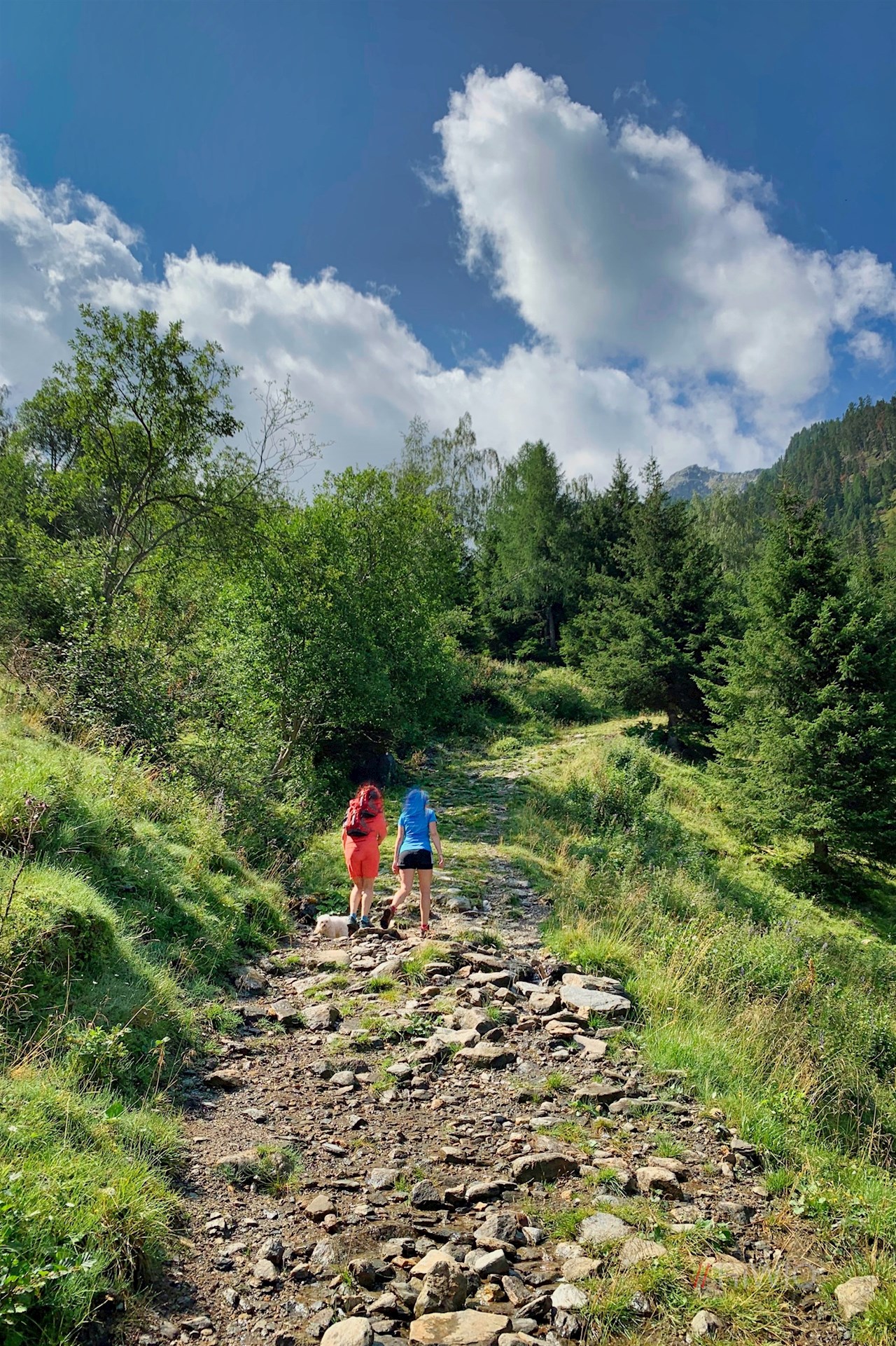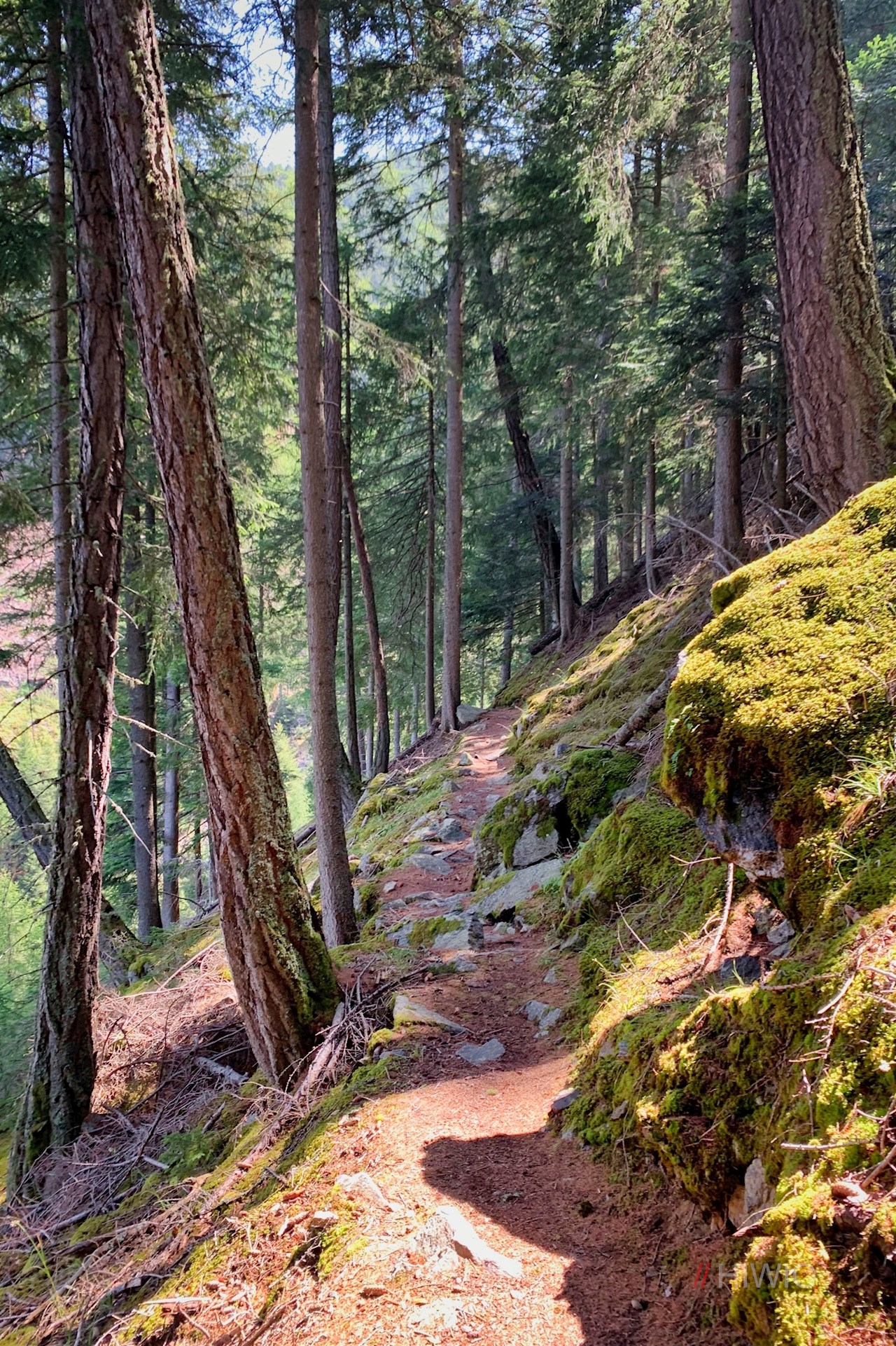 Er zieht sich durch teils lichten, teils dichten Nadelwald, mündet wenig später in den breiten Wanderweg Nr. 2 und geht hinter dem rauschenden Falzeibach in einen schönen Almsteig über.