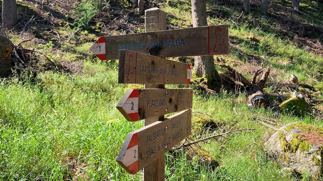 Nach einer halben Stunde steten Wanderns gelangt man an eine Weggabelung. Während sich links der Weg zur Tarscher Alm fortsetzt, führt der rechts abzweigende Waldsteig 2B zur Latscher Alm.