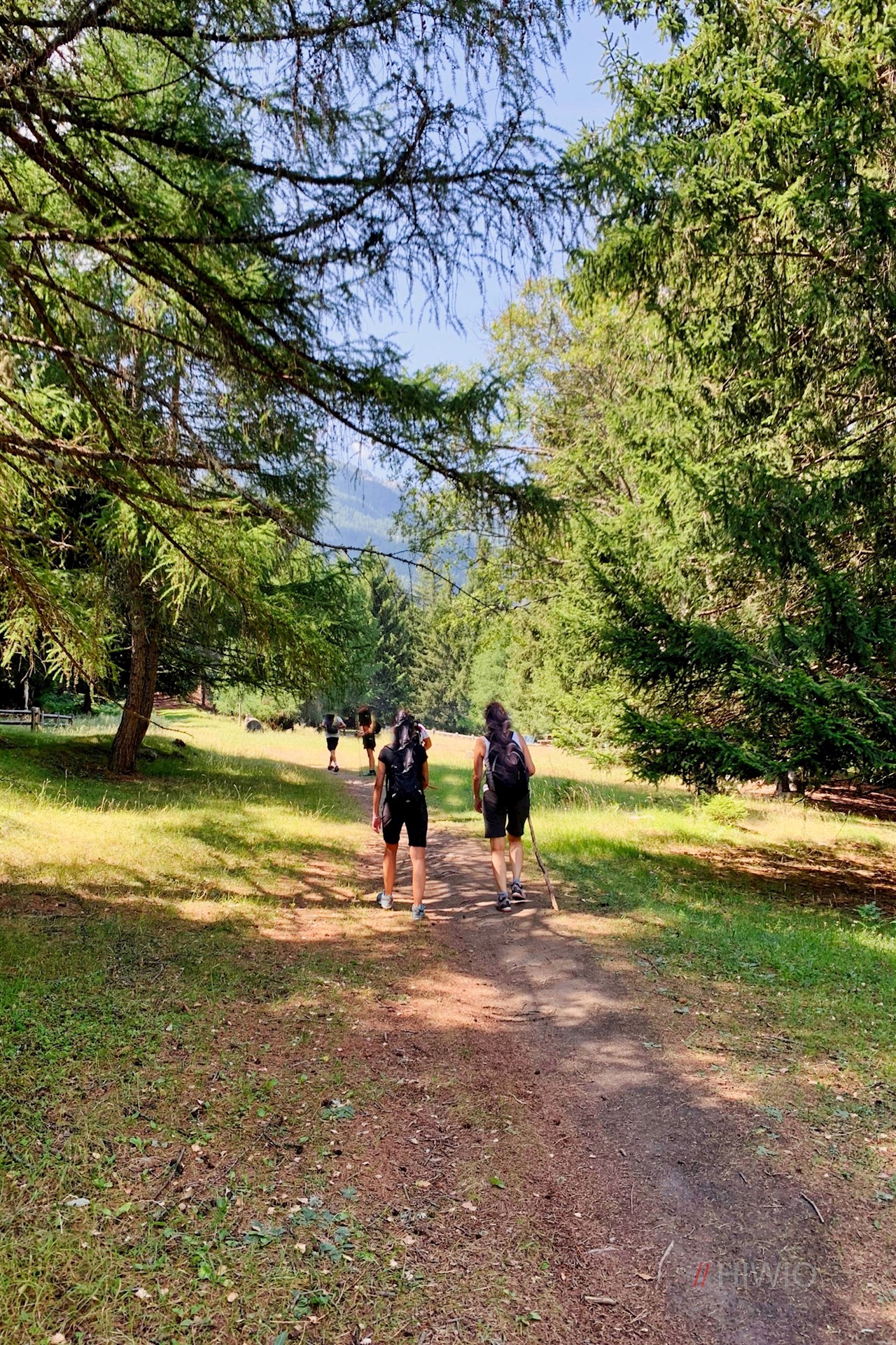 Der Wegnummer 2 in Richtung Latscher Alm folgend, taucht der anfangs noch breite Wanderweg sogleich in einen schattenverheißenden Wald ein, durch den er sich im angenehmen Anstieg seinen Weg bahnt.