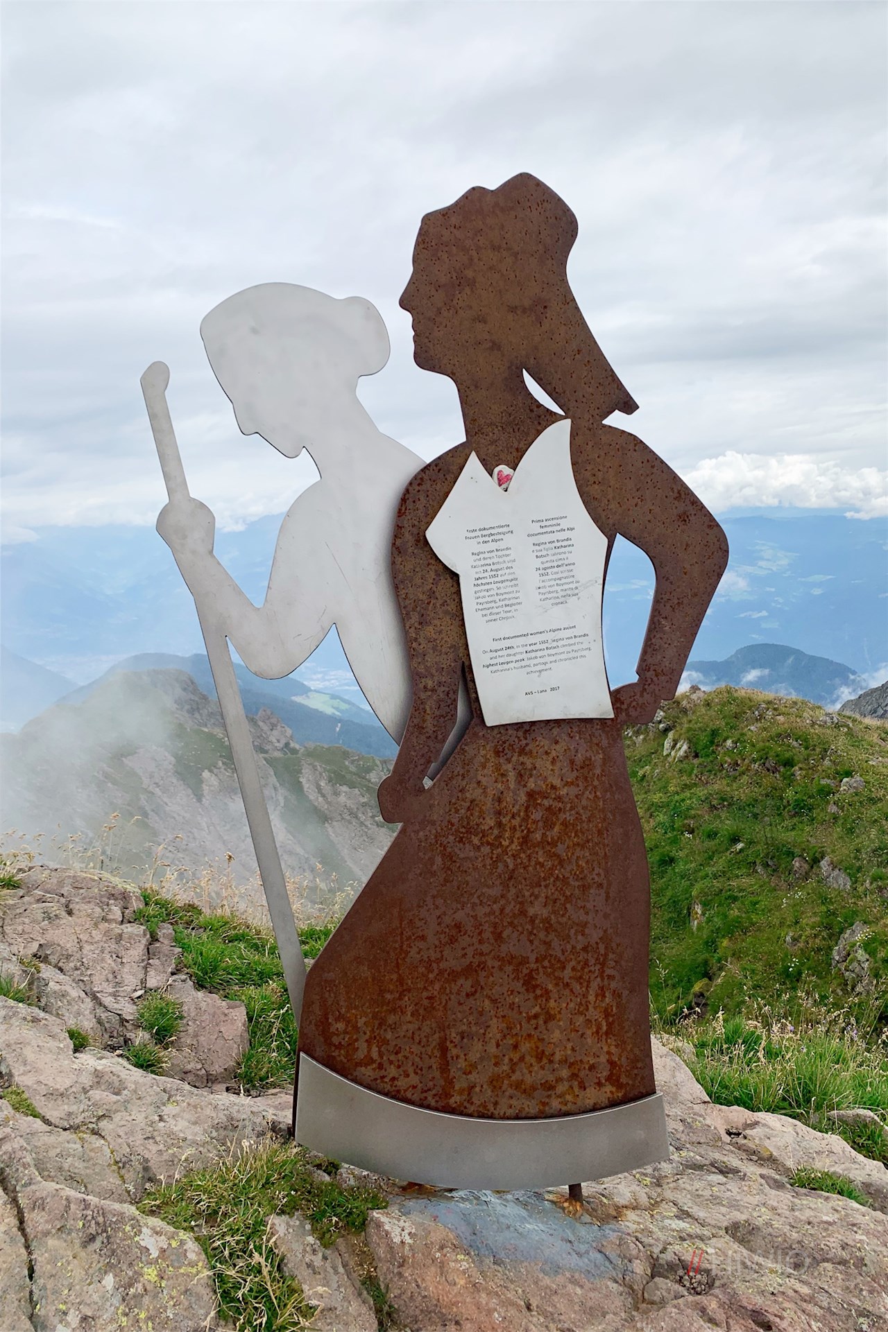 Unter dem Gipfelkreuz des Laugen erinnert eine Metallfigur an die erste dokumentierte Frauen-Bergbesteigung in den Alpen: Regina von Brandis und ihre Tochter Katharina Botsch unternahmen im August des Jahres 1552 eine Gipfeltour auf den aussichtsreichen Laugen.