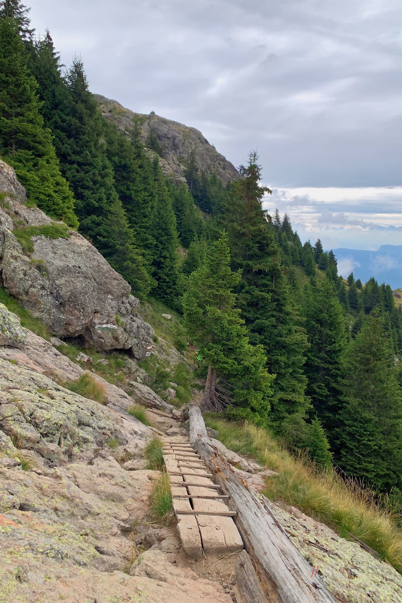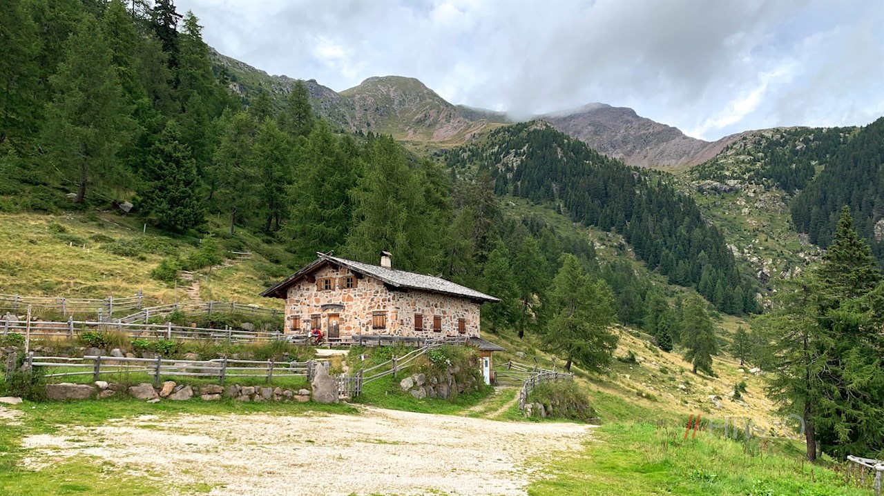 Für unseren Anstieg wählen wir den breiten Wanderweg Nr. 133, von dem gleich darauf ein steil ansteigender Waldweg rechts abzweigt. Er führt im steten Anstieg durch den teils stein- und wurzelbeschlagenen Wald, hinter dem sich schöne Almwiesenhänge ausdehnen. Hier öffnen sich bereits schöne Ausblicke auf St. Felix, Tret, Unsere Liebe Frau, Fondo und die dahinter aufragende Bergwelt.