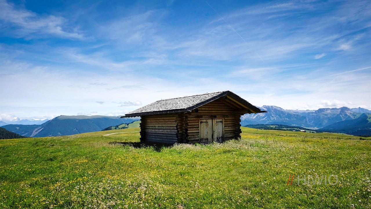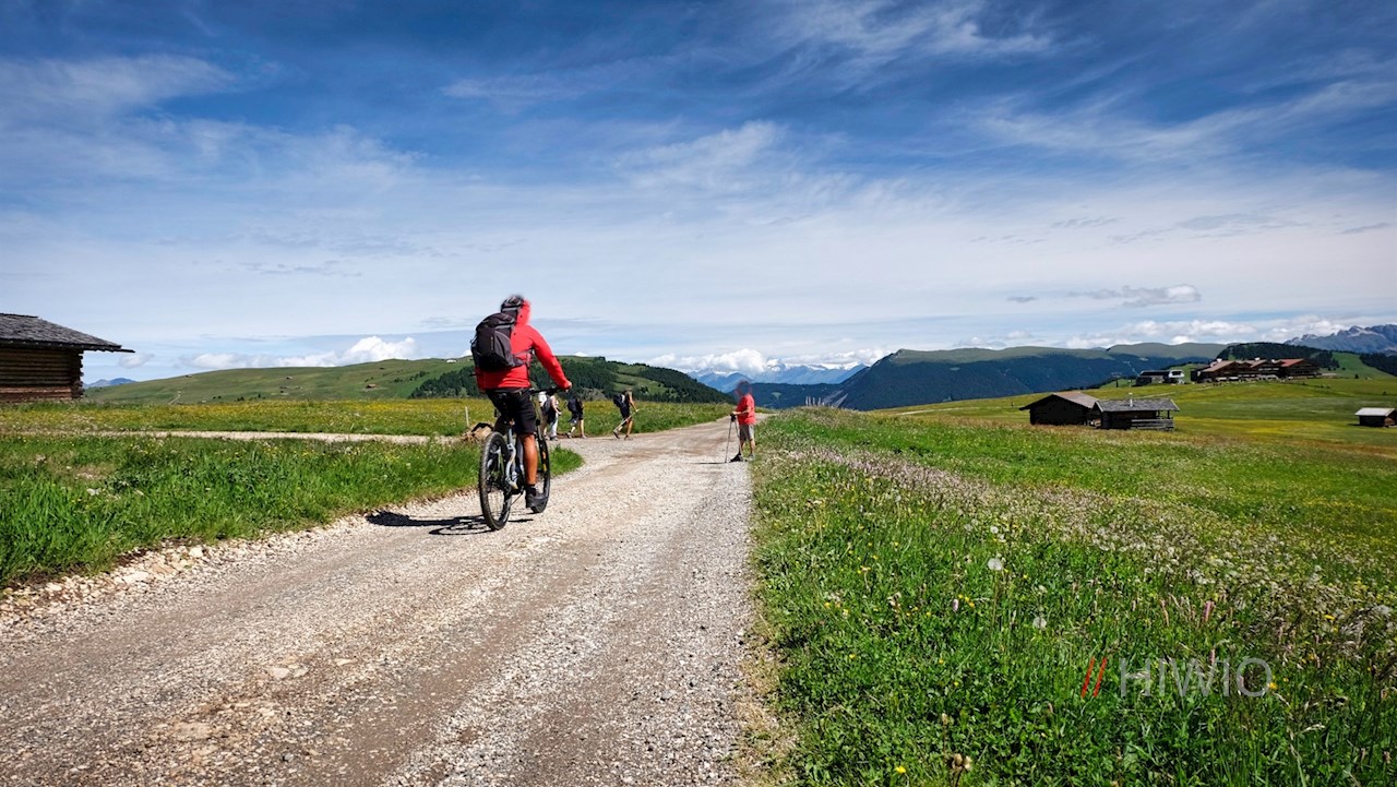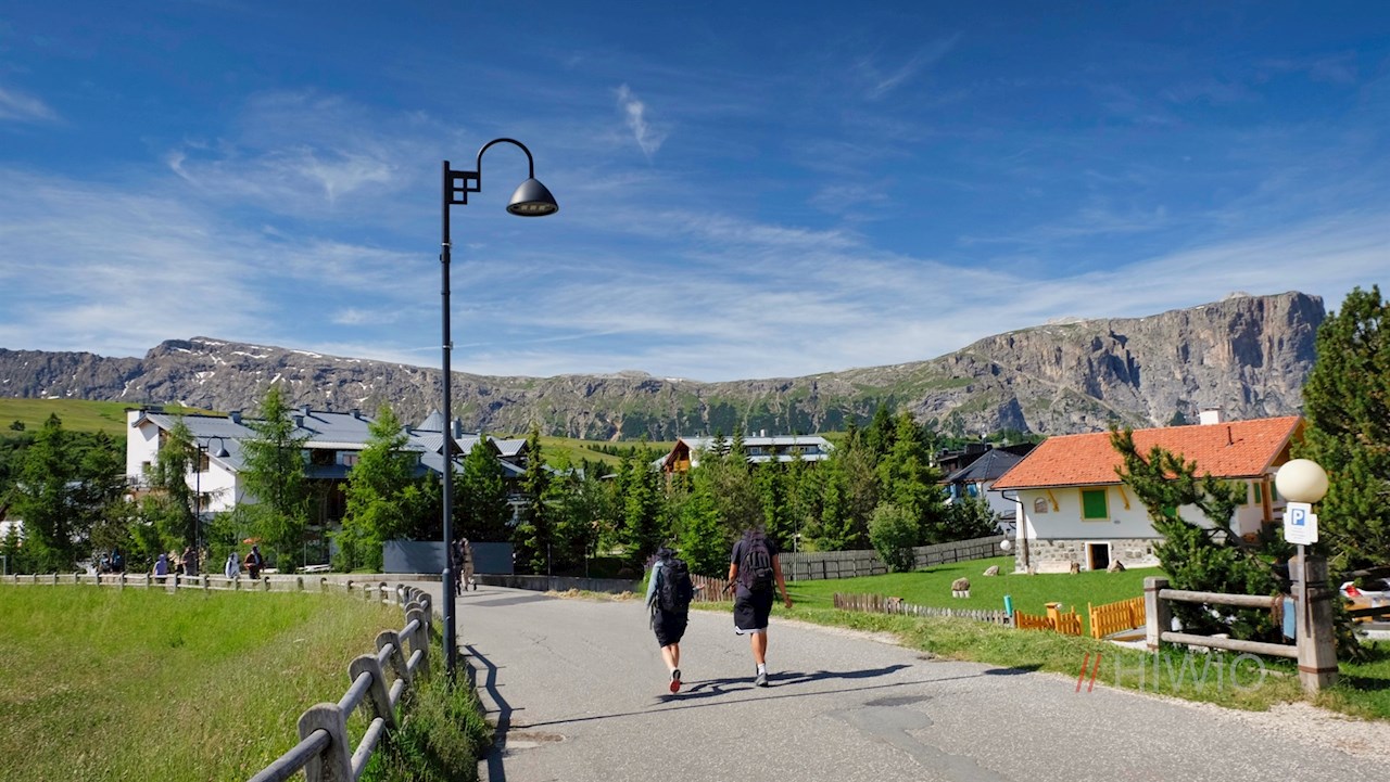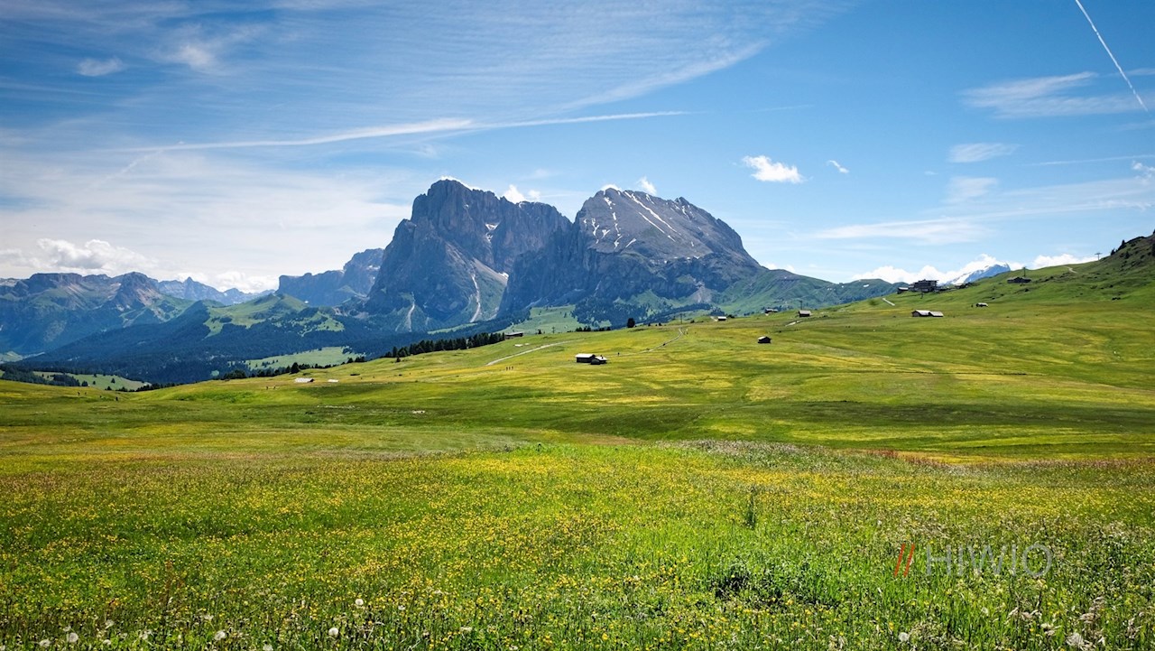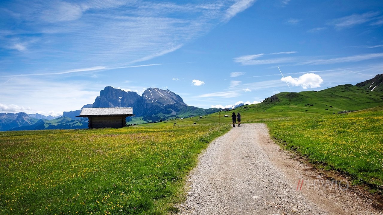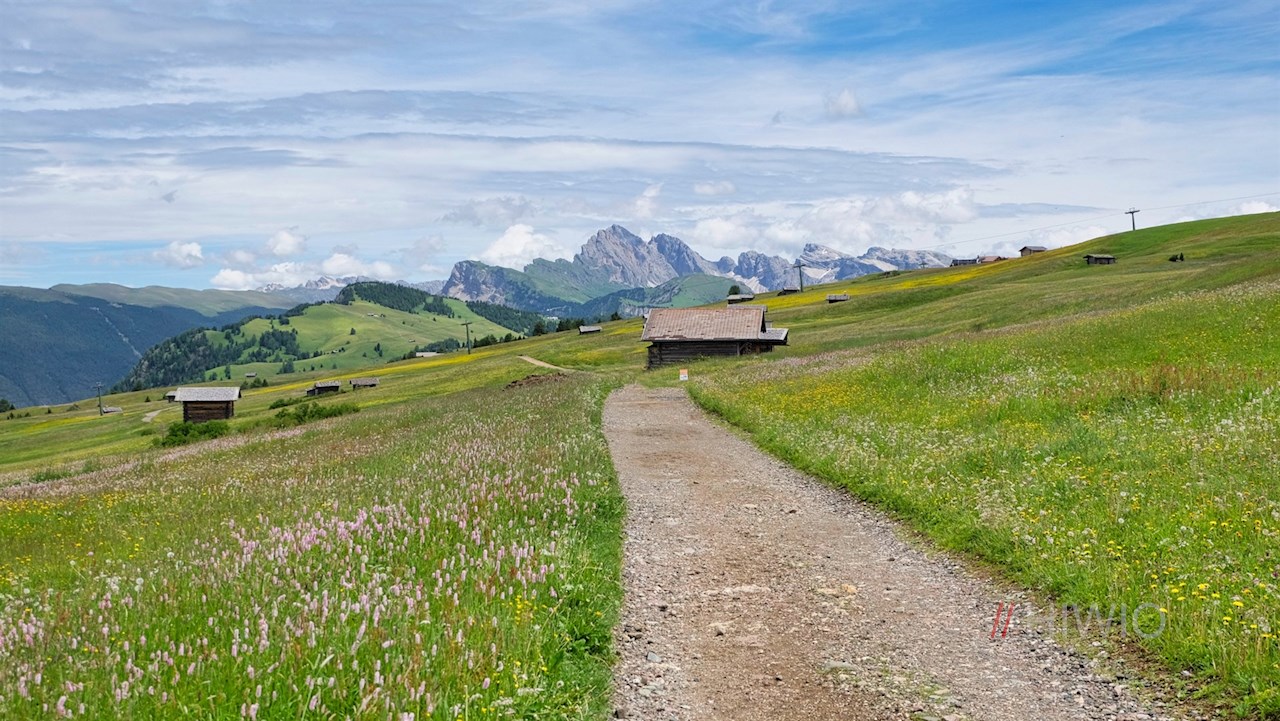 Unterhalb der Bergstation weist das Wanderschild Nr. 7 den Weg zur Laurinhütte. Er steigt sanft durch die gewellten, im Frühsommer von zahlreichen Blumen bestandenen Wiesen der Seiser Alm an und öffnet dabei verträumte Ausblicke auf die majestätischen Felswände des Schlern.