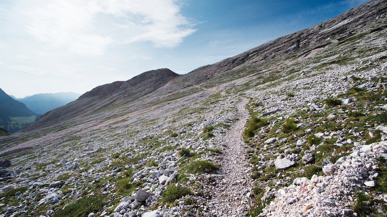 Wenngleich er hinfort nicht mehr beschildert ist, ist der gut ausgetretene, mit zahlreichen Steinmännchen markierte Weg dennoch leicht zu finden. Er quert zunächst im sanften Anstieg die grasbewachsenen, geröll- und steinbeschlagenen Hänge zu Füßen des Lavinores.