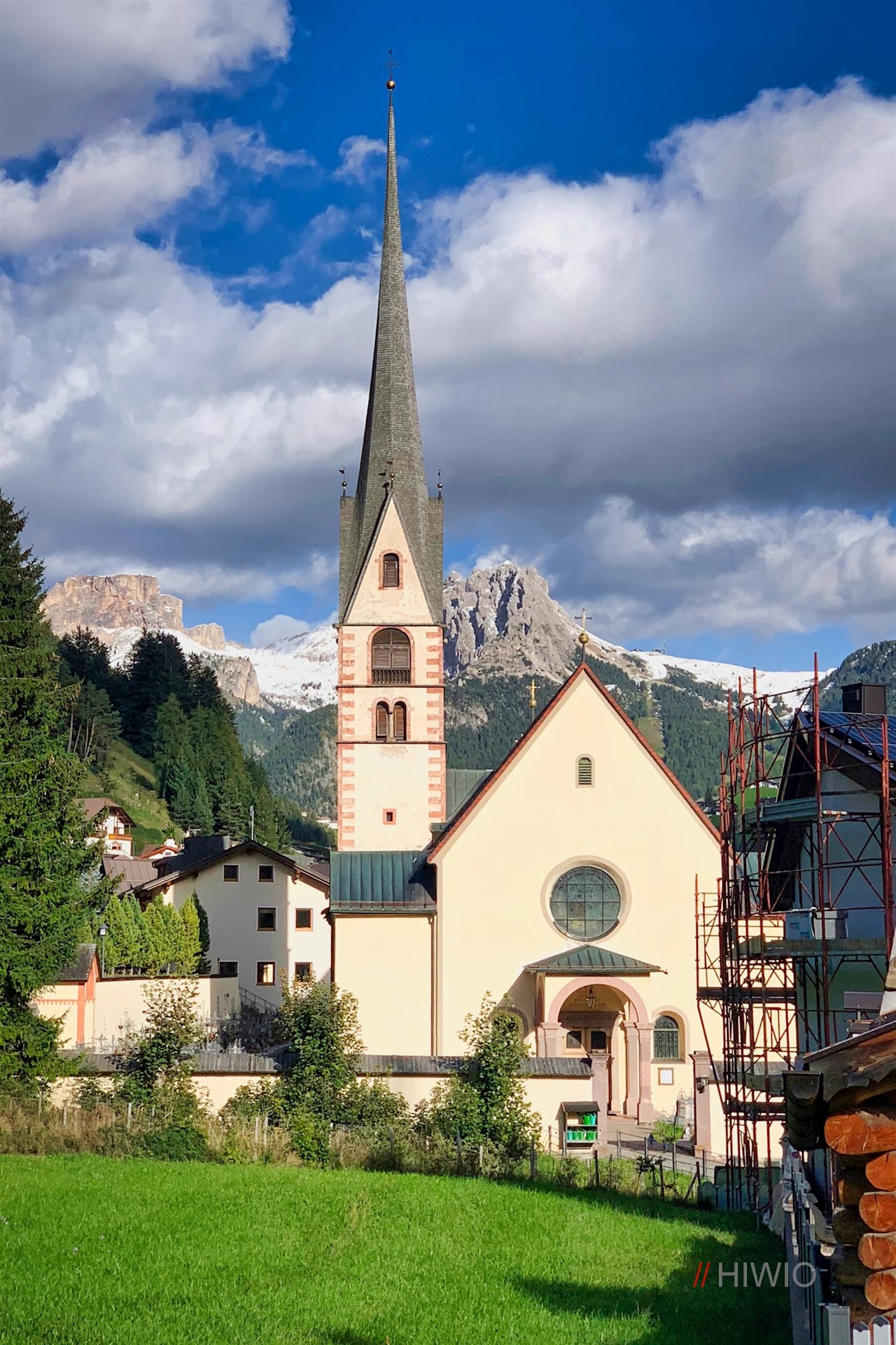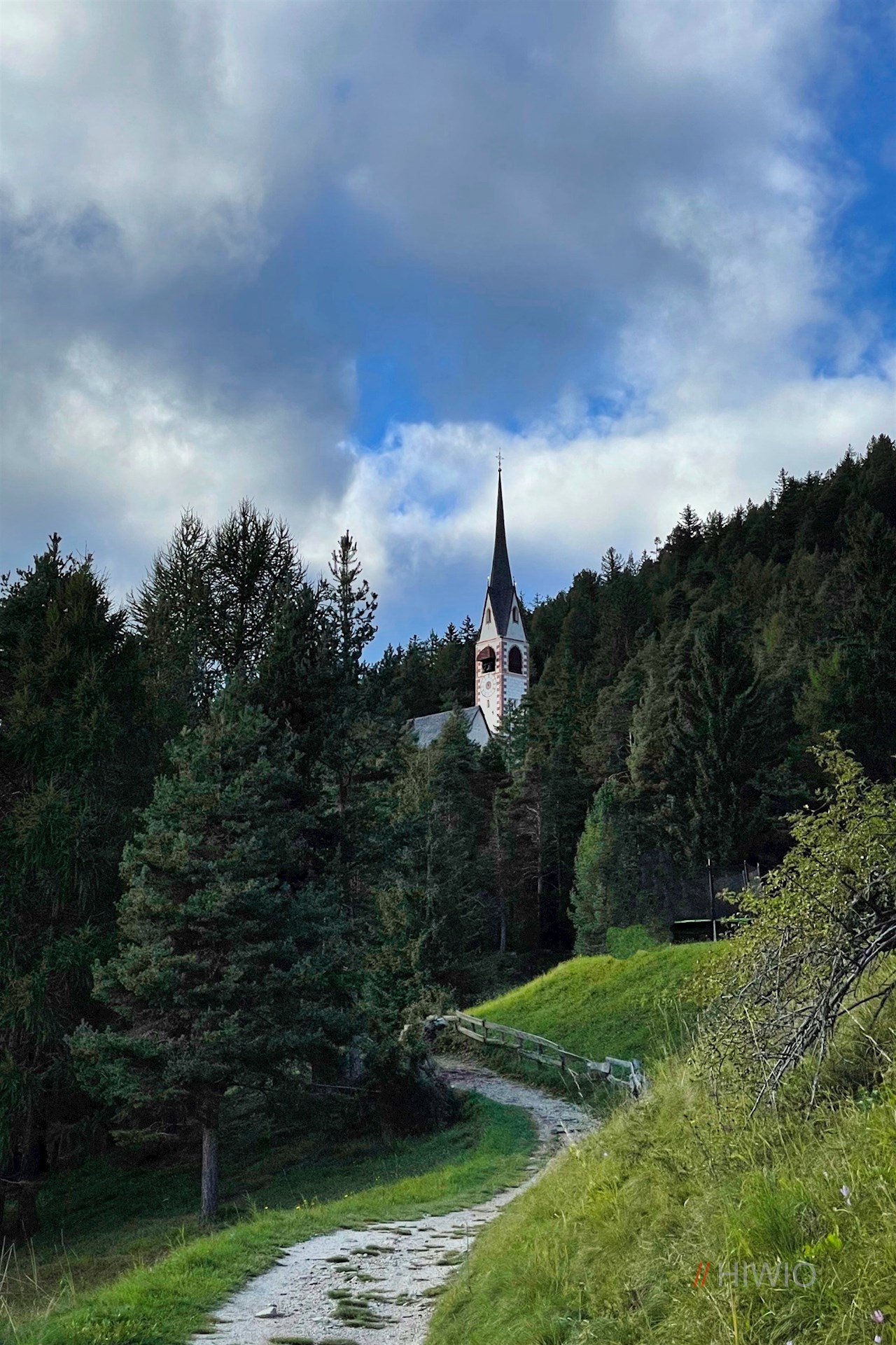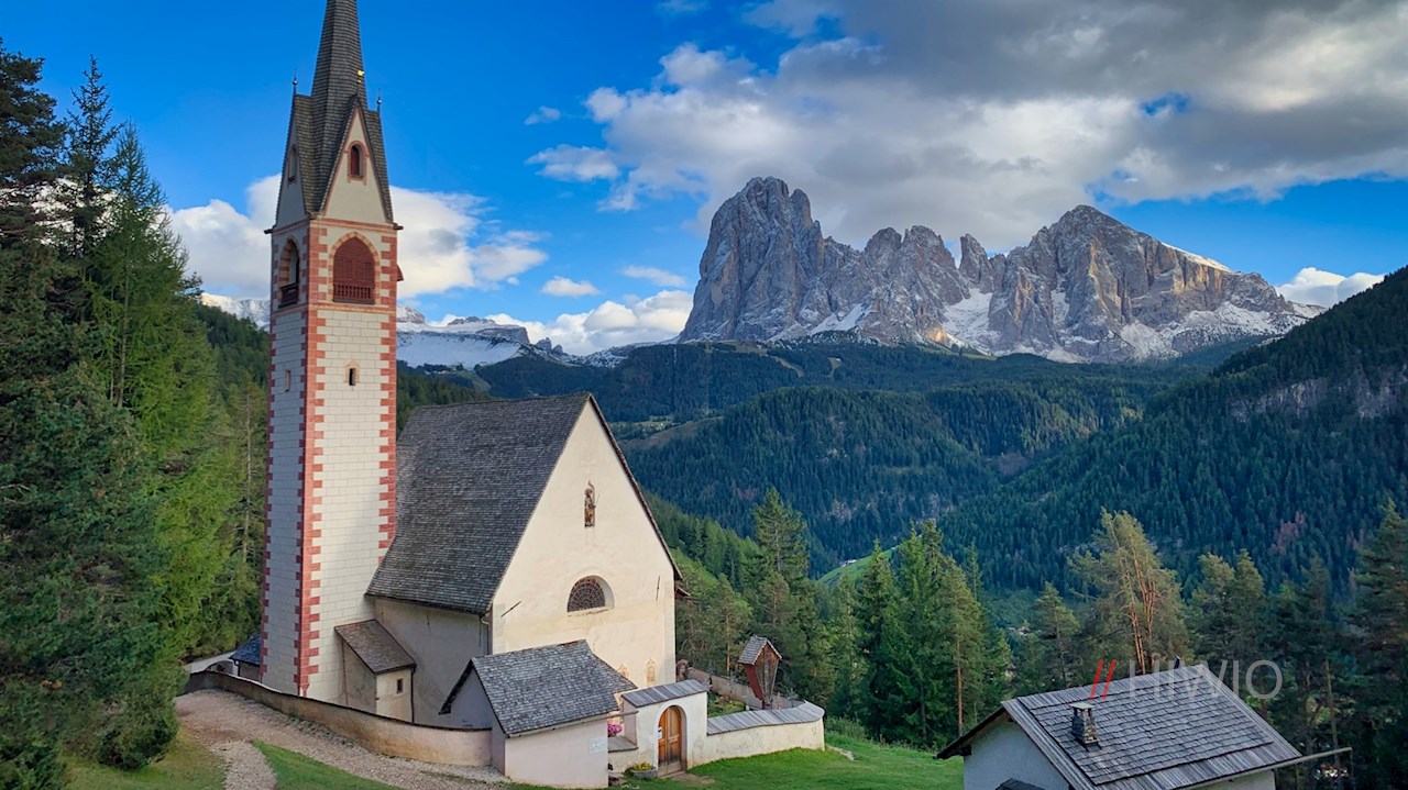 Der Legendenweg selbst endet bei einem Bauernhof. Weiterhin der Wegnummer 32A und wenig später 4 folgend, führt die Wanderung im nunmehr steileren Anstieg zu jener idyllischen, von der Kulisse des Sellastocks, des Lang- und Plattkofels umrahmten Lichtung, in der die pittoreske, dem Patron der Wanderer und Reisenden geweihte Kirche thront. Sie ist noch heute Ziel von Bittgängen.