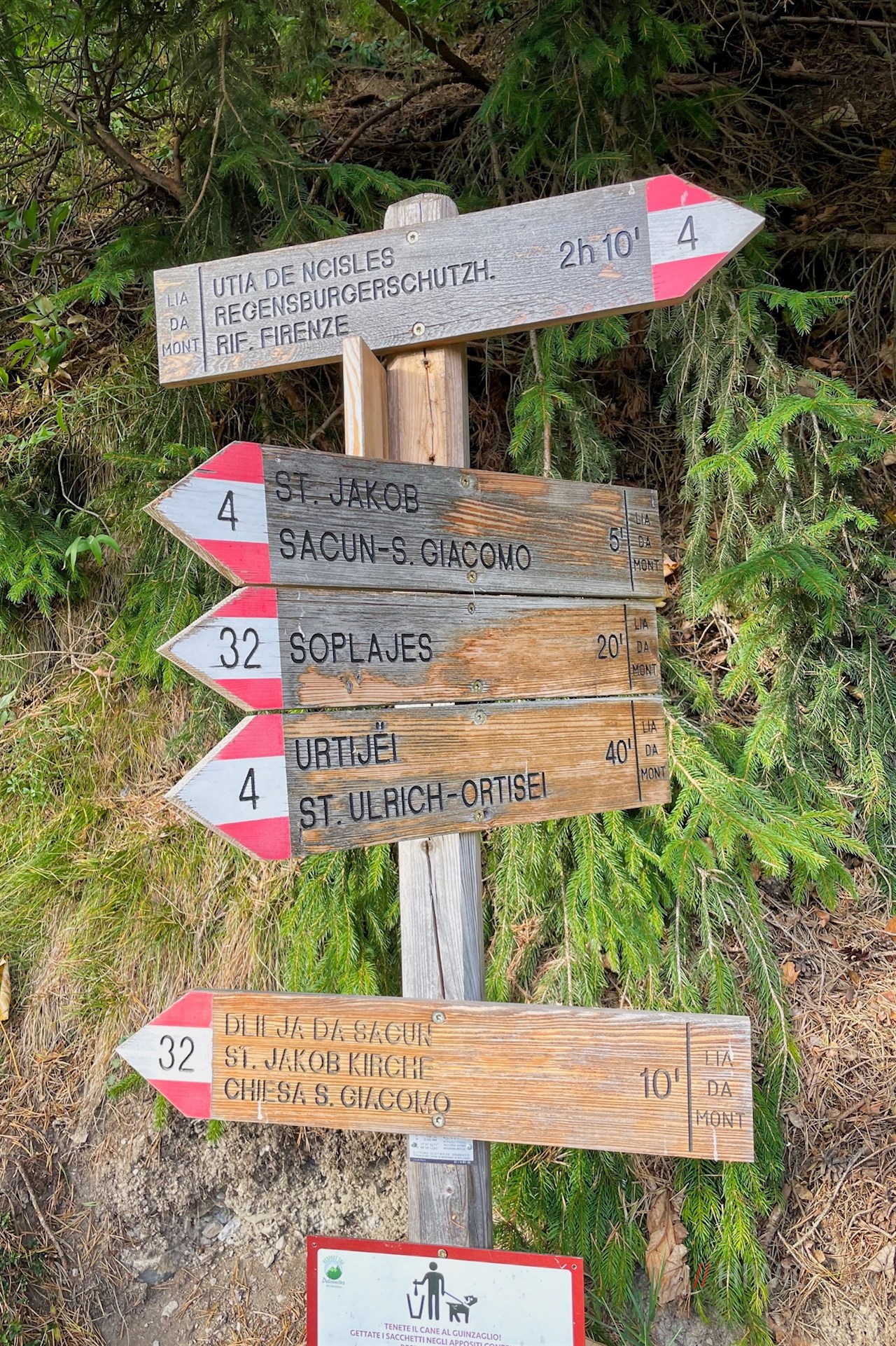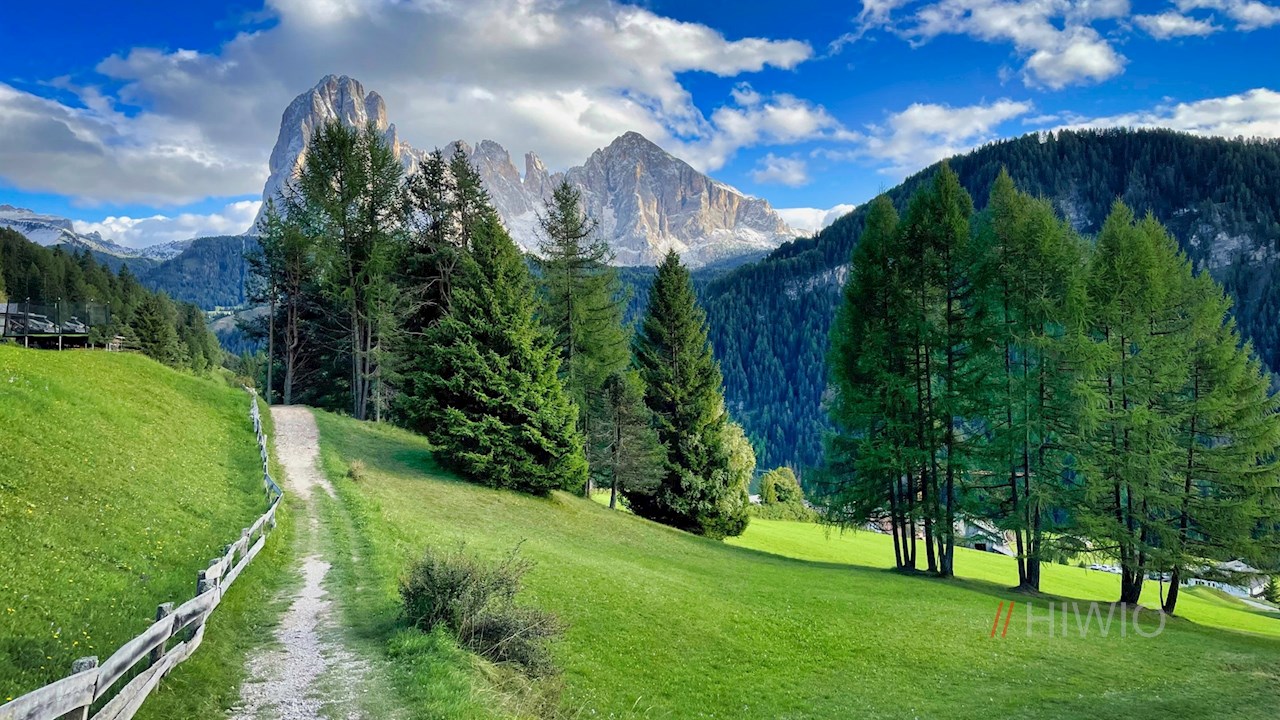 Nahe der Kirche zweigt der anfangs asphaltierte Legendenweg Nr. 32A nach St. Jakob ab. Er taucht wenig später in einen schattenverheißenden Wald ein, durch den er sich teils eben, teils im sanften Auf und Ab seinen Weg bahnt und dabei schöne Ausblicke auf den majestätischen Langkofel öffnet.