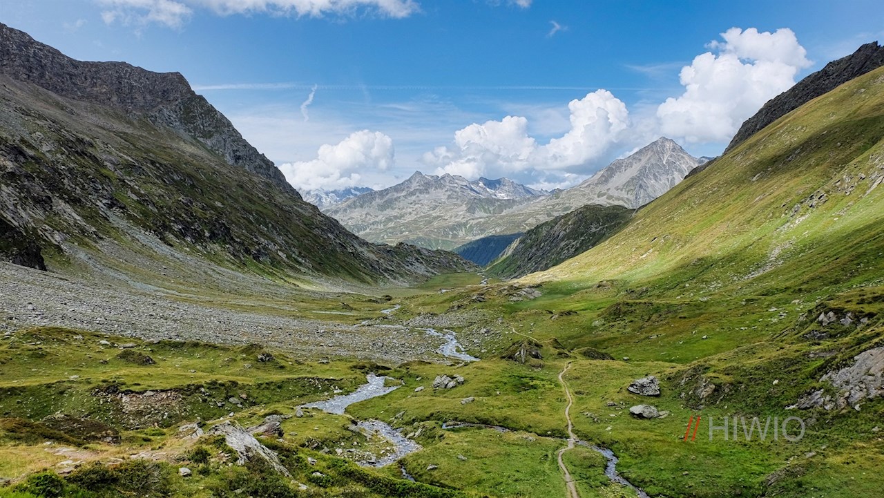 Dahinter schlängelt er sich durch das teilweise flache, von hohen Felsen umrahmte Windtal.