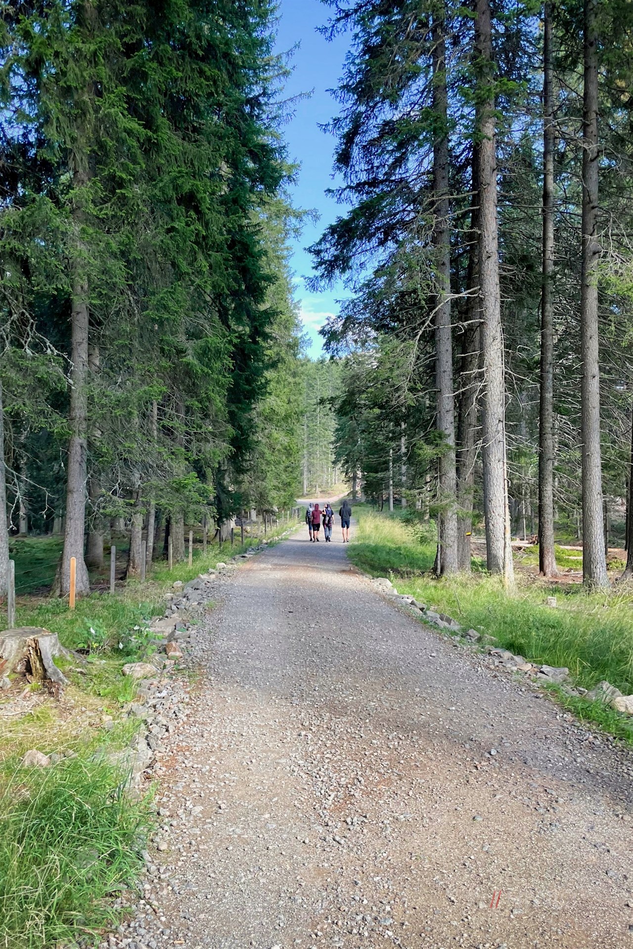 Hinter dem lauschigen See weist das Wanderschild Nr. 7 den Weg in Richtung Liegalm. Er geht kurz darauf in den breiten Wanderweg Nr. 9 über, der sich nahezu eben und zuletzt sanft abfallend durch Wald und idyllische Weidewiesen zur einladenden Liegalm zieht.