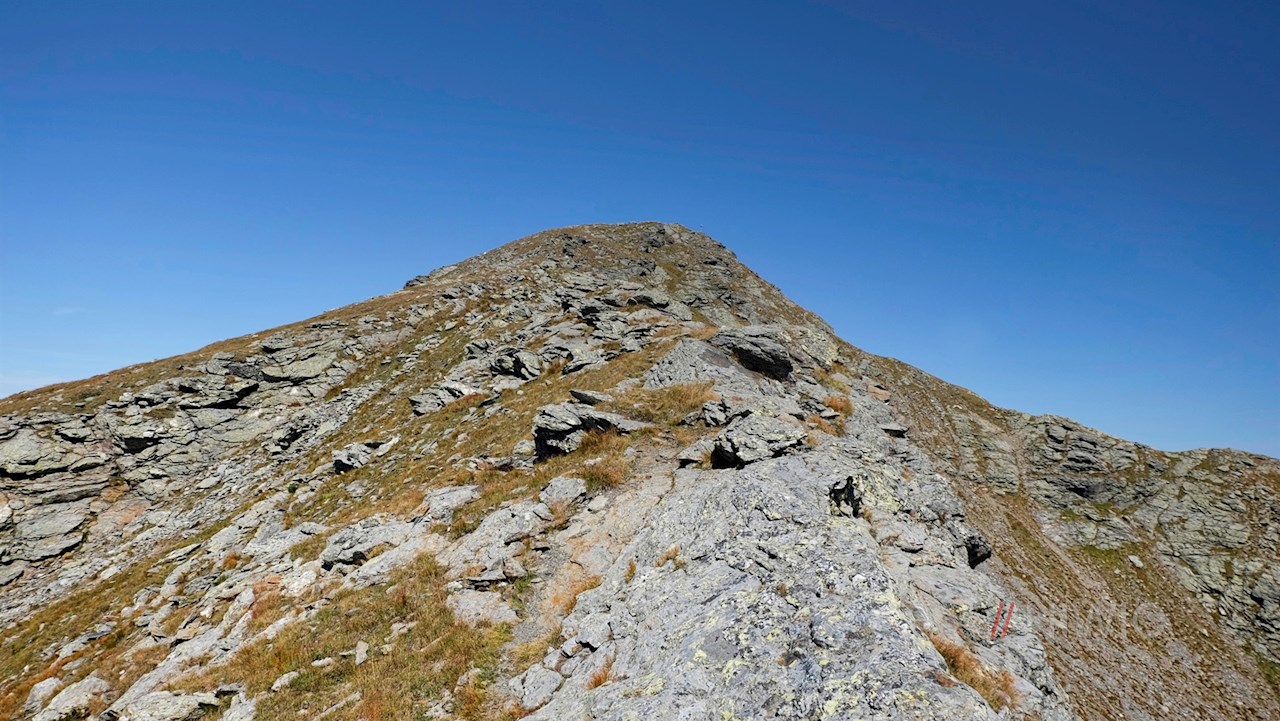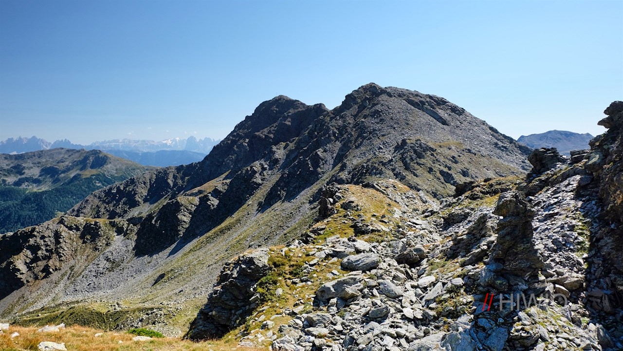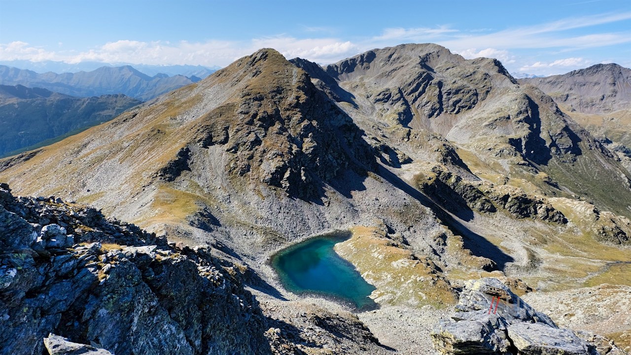 Nun folgt der ziemlich steile, teils weglose, aber gut markierte Anstieg über die teils grasbewachsene, teils schrofige und steinbeschlagene Gipfelflanke der Liffelspitze. Neben deren formschönem Gipfelkreuz werden die Mühen des Anstiegs mit einem atemberaubend schönen Panorama belohnt: Während sich im Norden die nahe Pfannspitze, die Jakobsspitze und die dahinter aufragenden Gletscher des Alpenhauptkamms mit dem Hochfeiler oder dem Hohen Weißzint erheben, ragen im Süden das benachbarte Schrotthorn und namhafte Dolomitenberge wie der Peitlerkofel, die Villnösser Geisler, der Sellastock oder der Lang- und Plattkofel in die Höhe. Zu unseren Füßen schimmert indes der kleine Schwarzsee.