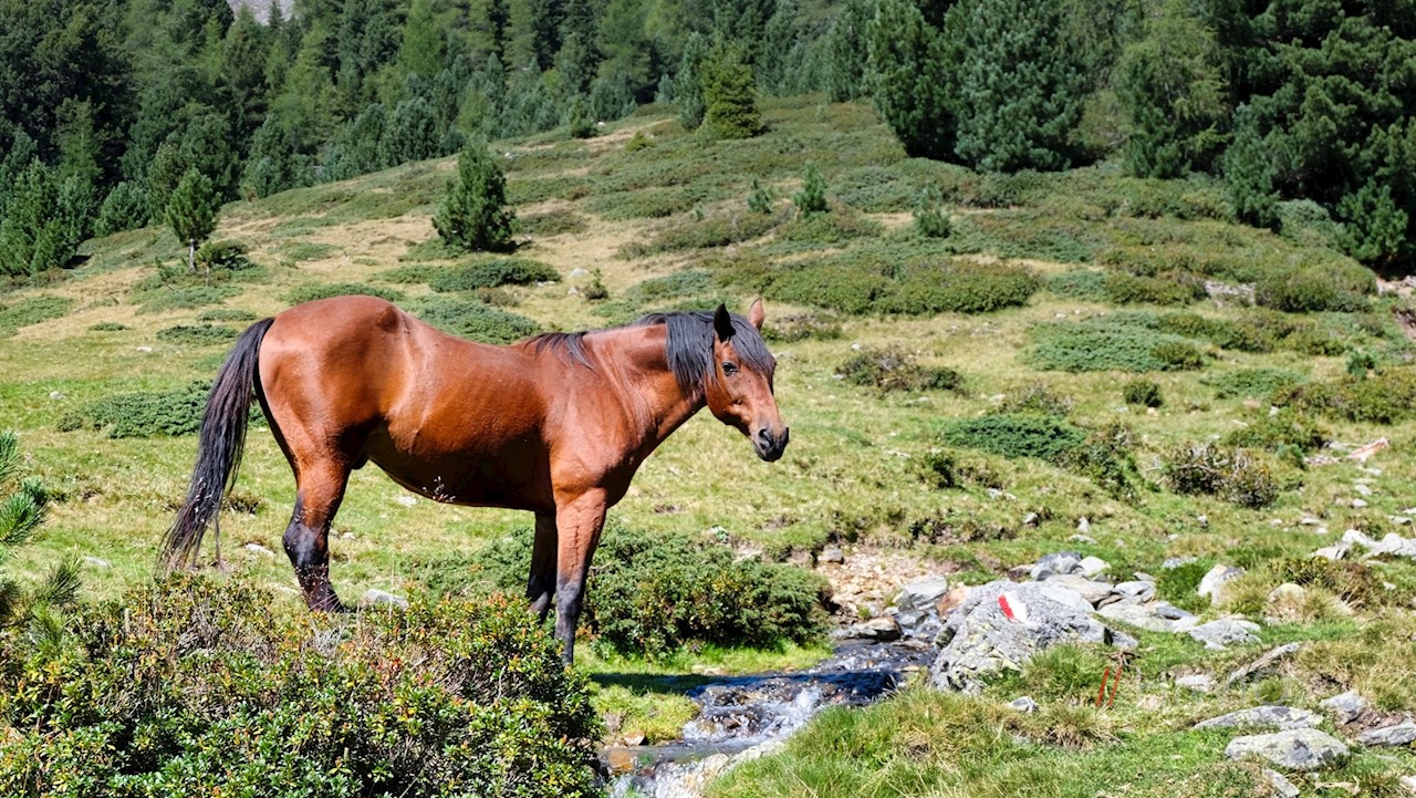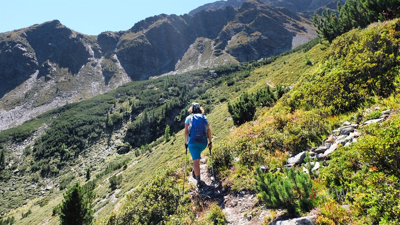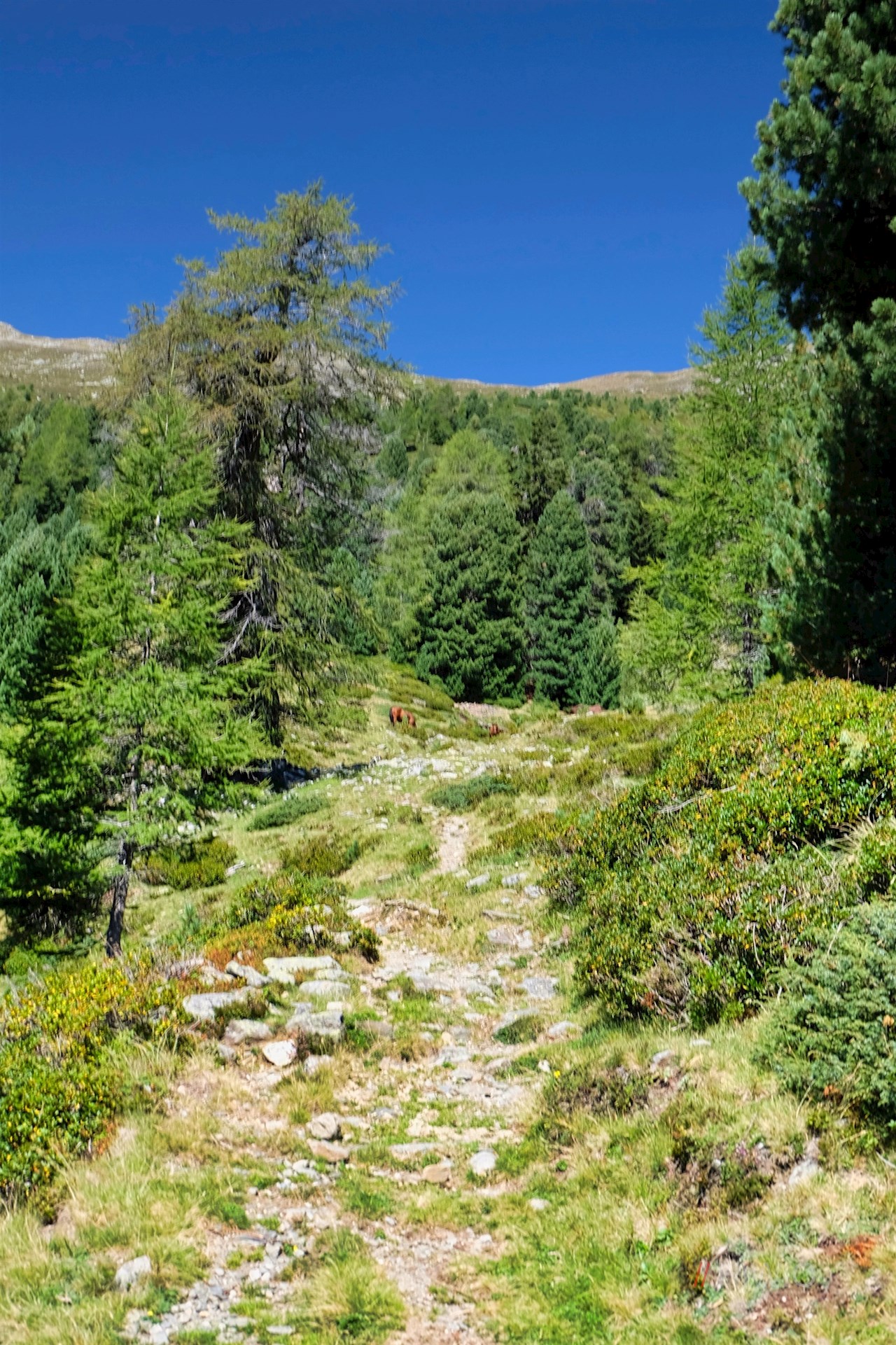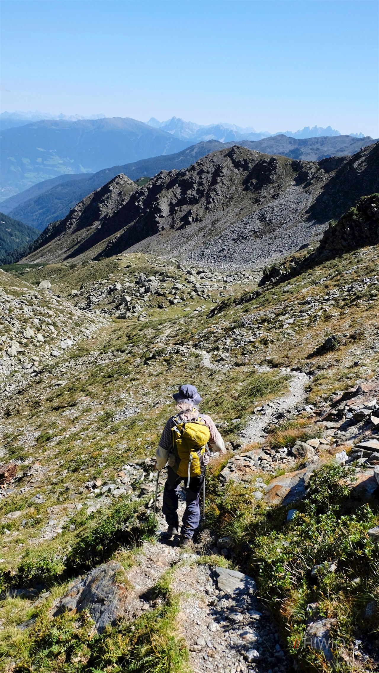 Nunmehr der Wegnummer 4B folgend, steigt der links abzweigende Wanderweg über die freien, von Latschen und Alpenrosen bewachsenen Hänge der Inneren Kaseralm auf die Pfannscharte an. Auf diesem 2.381 m hohen Übergang öffnet sich ein schöner Ausblick auf Schalders und Brixen auf der einen und das Sarntal auf der anderen Seite.