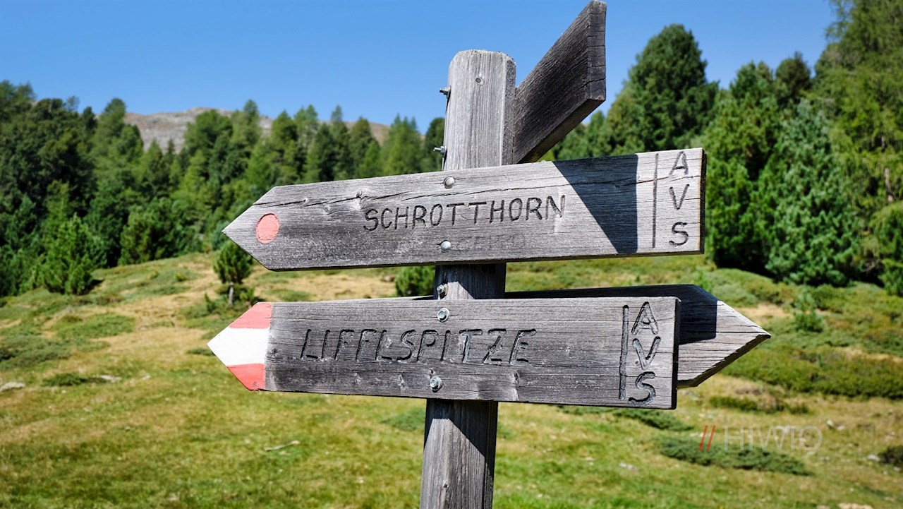 Hinter der Schafhütte überquert man ein kleines Bächlein. Wenig später gelangt man an eine Weggabelung, an der die Liffelspitze erstmals ausgeschildert ist.