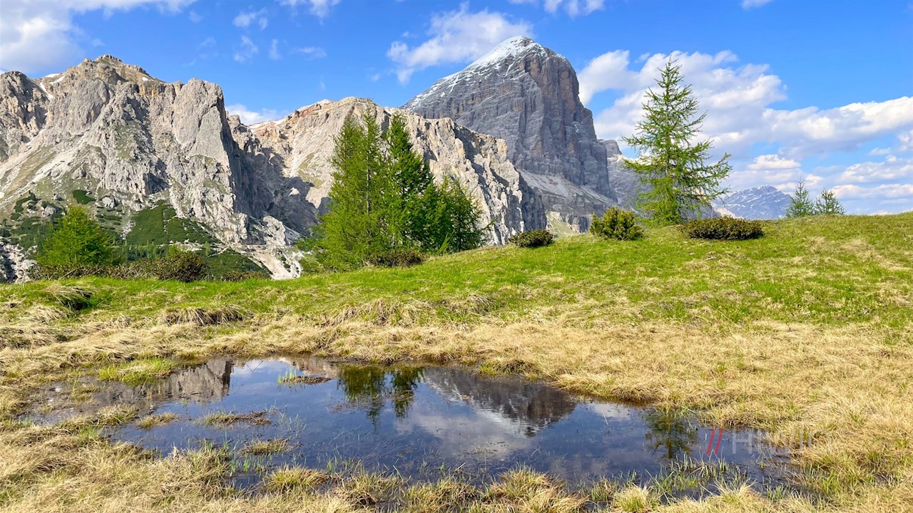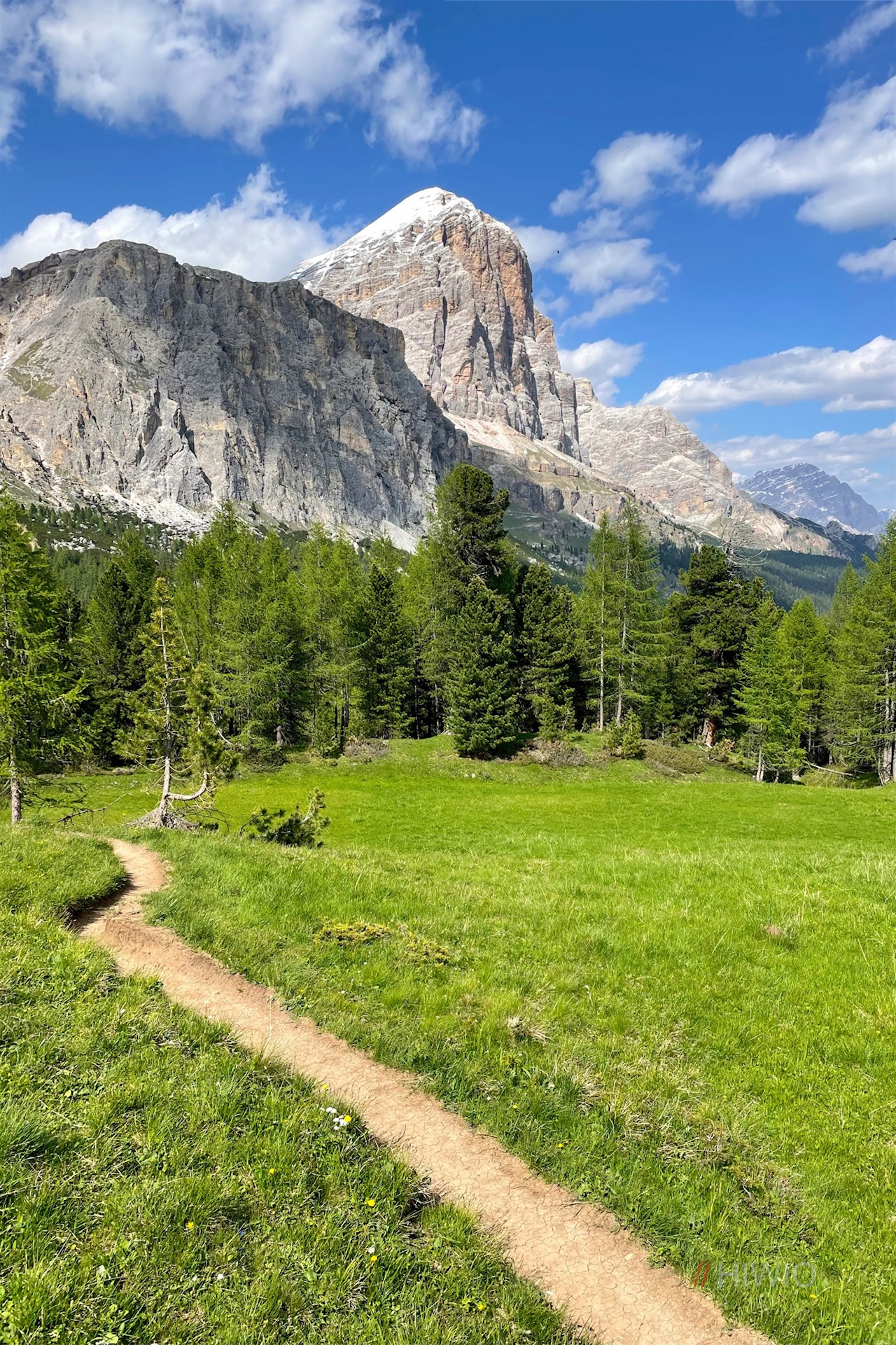 Nach der idyllischen Uferrast wandert man zu seinem Ostufer zurück, an dem ein kleiner (anfangs noch nicht ausgeschilderter) Steig in Richtung Falzaregopass abzweigt. Mit Blick auf den spitz zulaufenden Sas de Stria und den wuchtigen Lagazuoi führt er durch weite Bergwiesen und geht wenig später in den breiten, zum Falzaregopass abfallenden Weg Nr. 441 über.