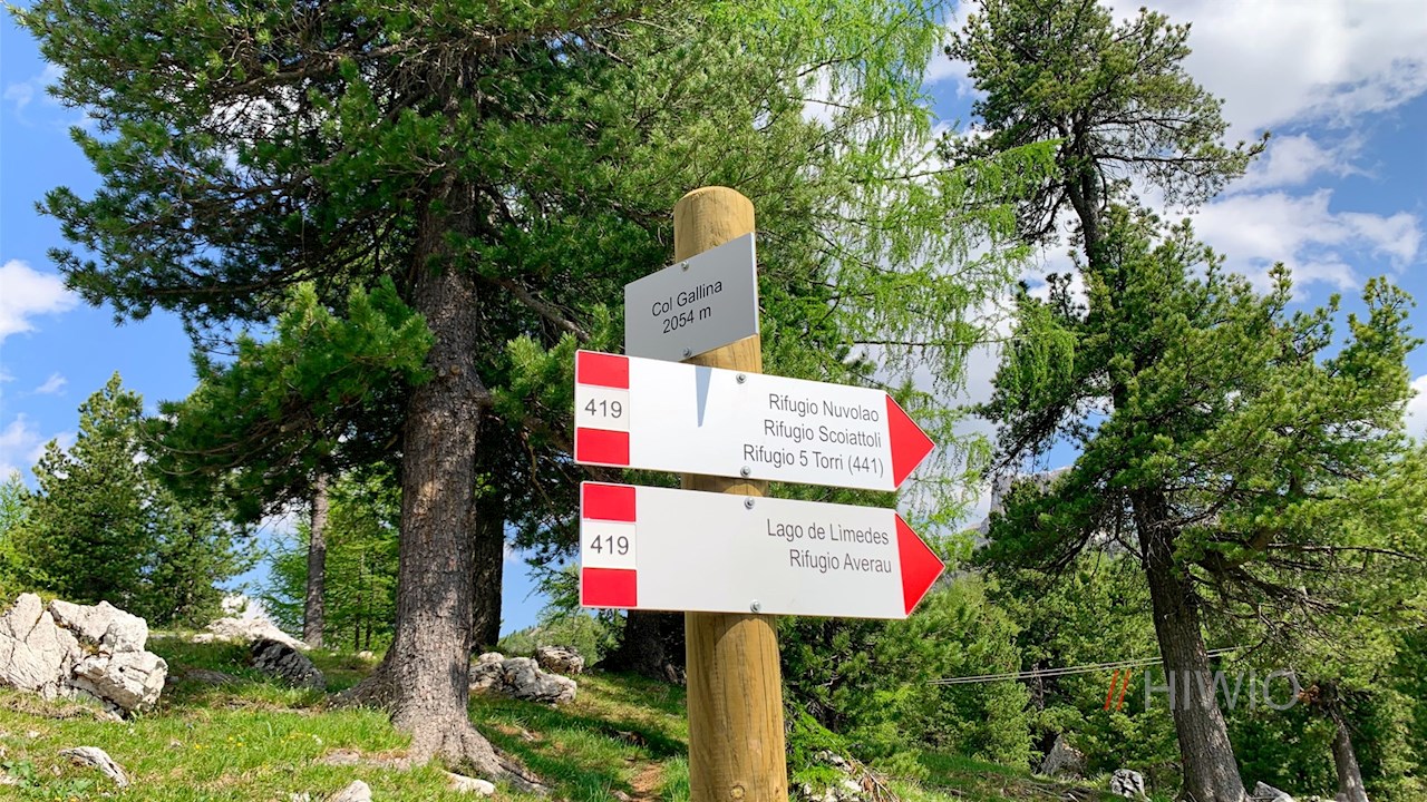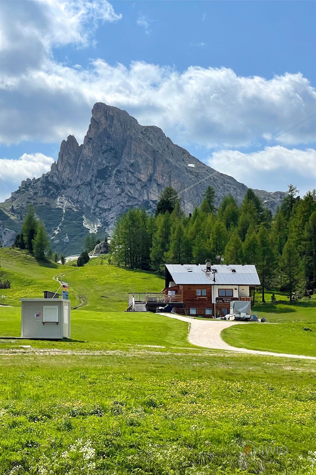 Vom Falzaregopass folgt man kurz der Straße nach unten, von der gleich darauf ein (nicht ausgeschilderter) Wiesensteig entlang eines kleinen Bächleins zum Col Gallina und dem darauf thronenden Rifugio Col Gallina abfällt.