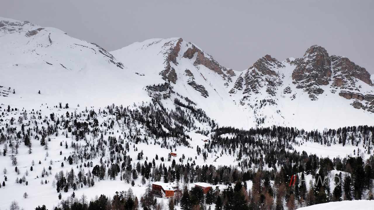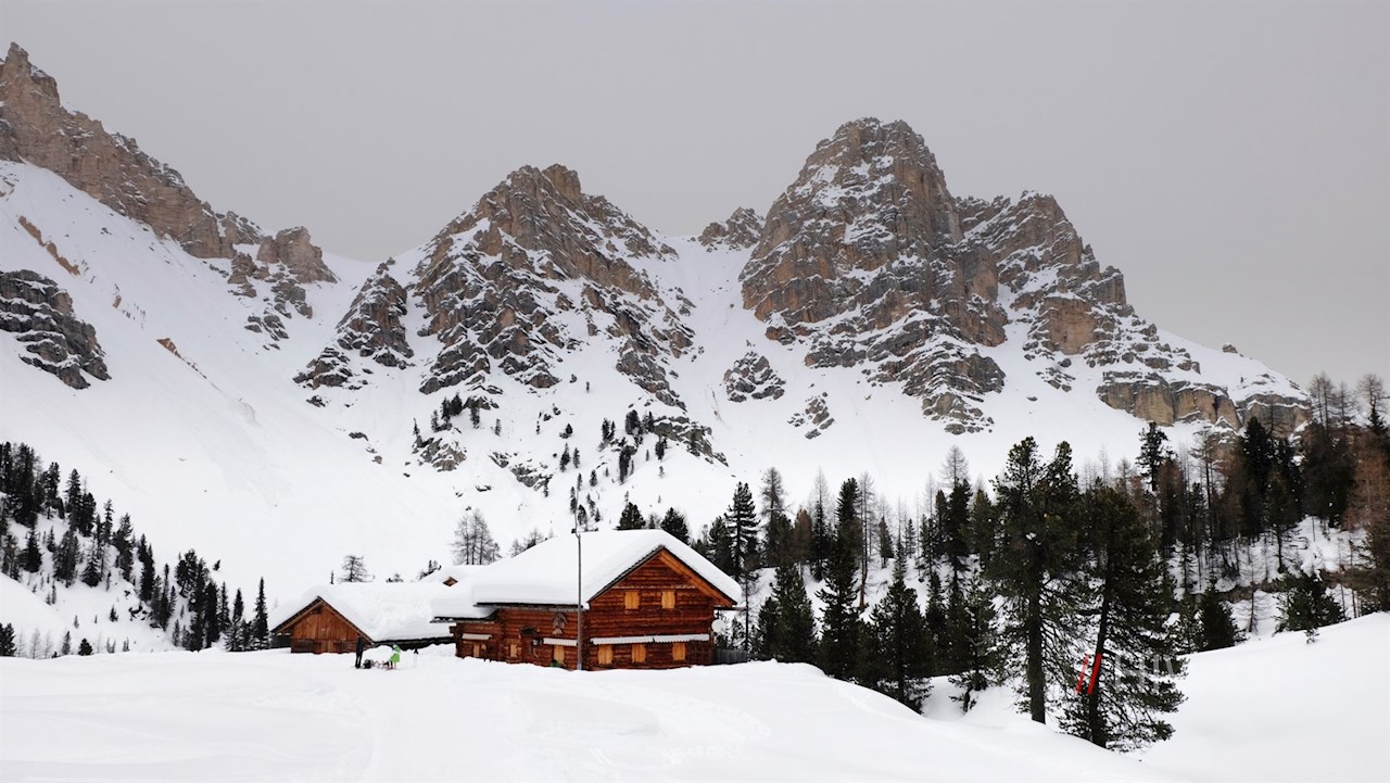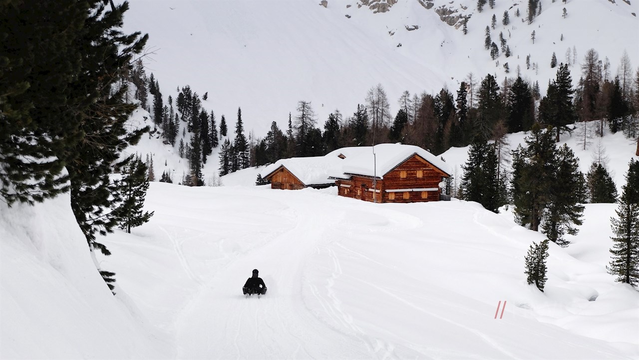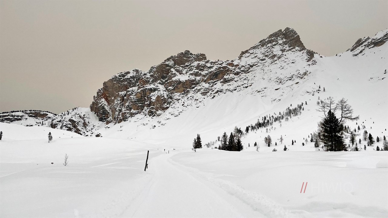 Nach einem nahezu ebenen Wegstück zieht sich die Wanderung vor der bezaubernden Kulisse der ringsum aufragenden Dolomiten im sanften Anstieg zu den sagenumwobenen Almwiesen der Kleinfanes, die im Winter in eine glitzernde Schneedecke gehüllt sind.