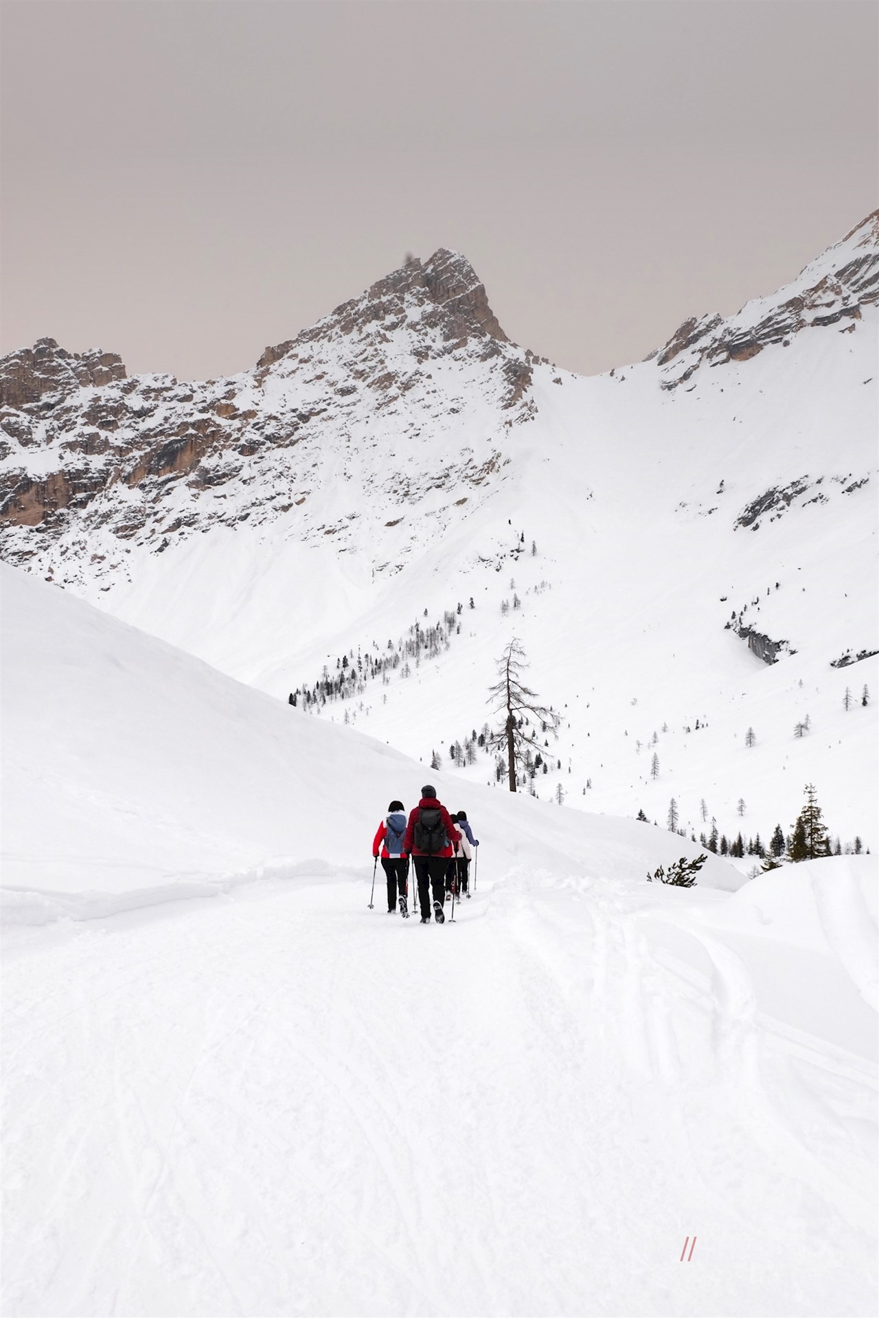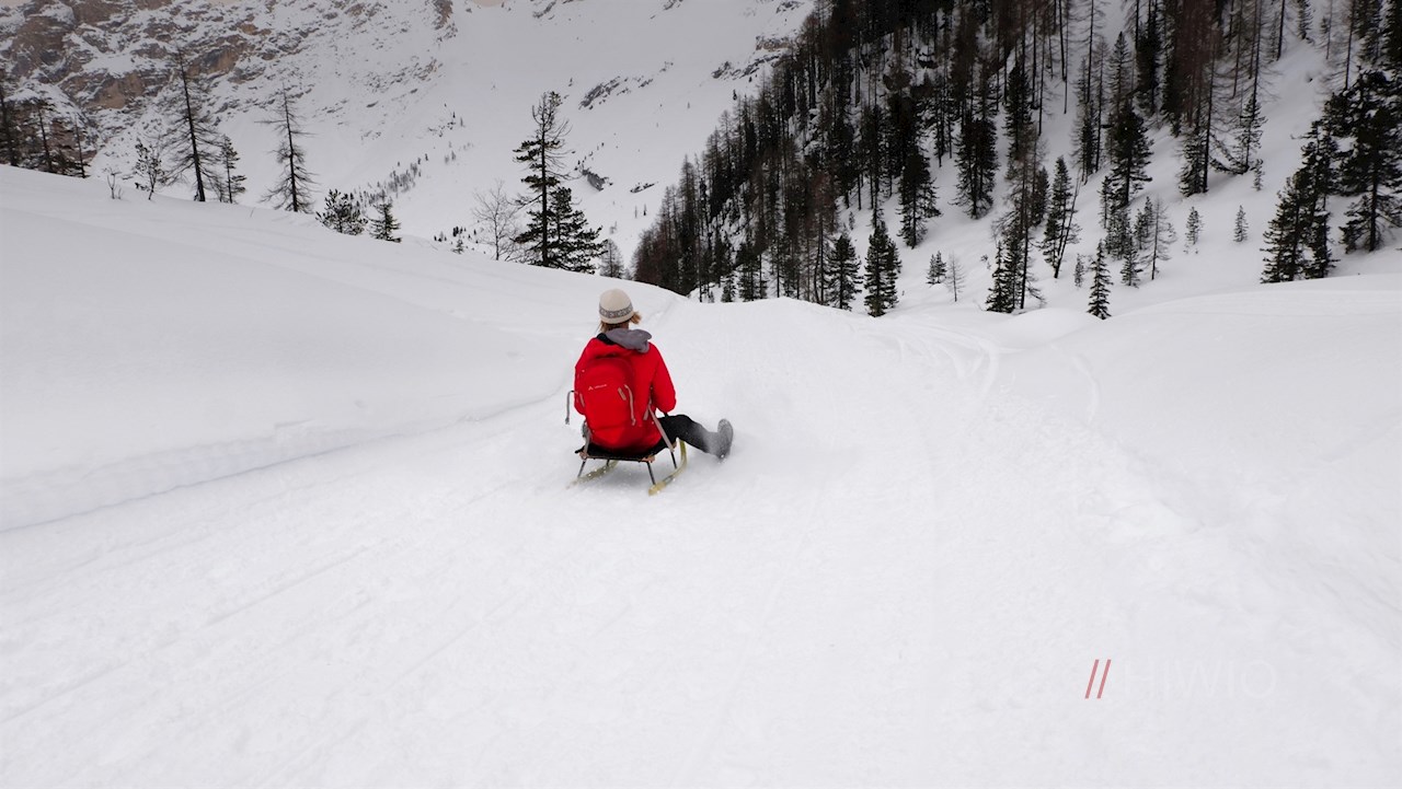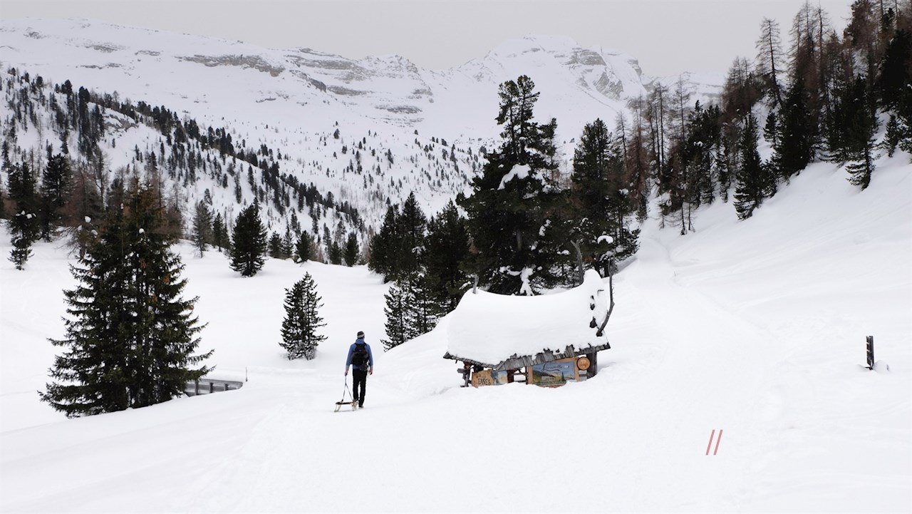 Hinter dem einladenden Berggasthaus Pederü steigt der gebahnte Wanderweg Nr. 7 in zahlreichen Serpentinen durch die schneefunkelnde Winterlandschaft auf den oberen Talboden an.