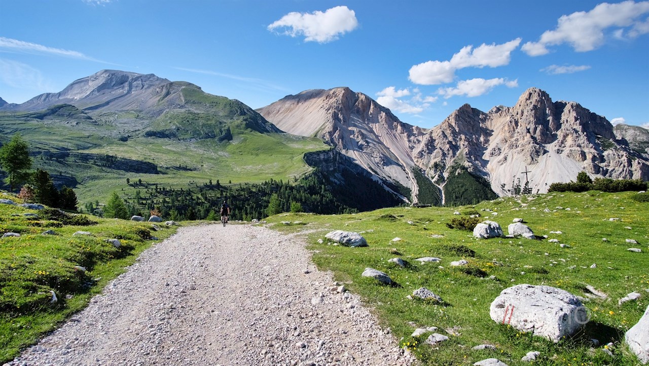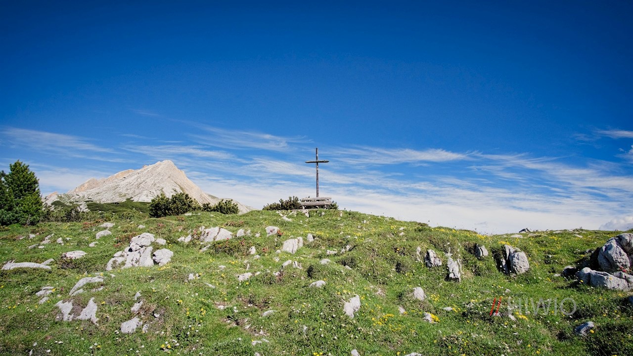 Hinter der gastlichen Almhütte folgt man weiterhin dem breiten Wanderweg Nr. 11. Er steigt auf das kreuzgeschmückte Limojoch an, auf dem sich wenig später ein atemberaubend schönes Panorama entfaltet: Unser Blick schweift vom nahen Col Bechei über weitere bekannte Dolomitengipfel wie die Lavarella, den Heiligkreuzkofel oder die Antoniusspitze und die nunmehr zu unseren Füßen liegende Fanes- und Lavarellahütte.