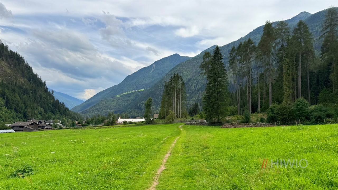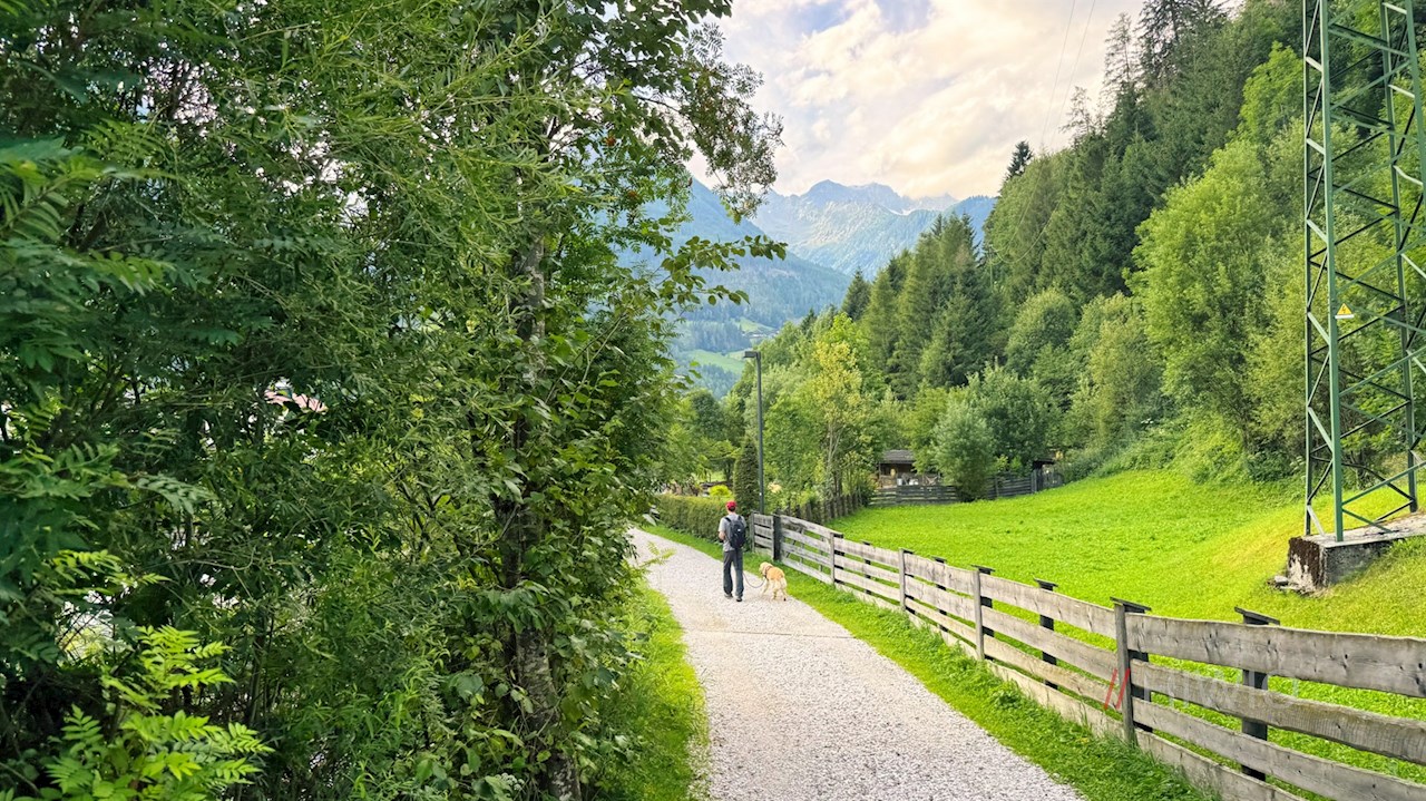 Dem „Ahrntaler Talweg“ folgend, überquert man zunächst die kleine Holzbrücke auf der gegenüberliegenden Straßenseite und wandert vor der Kulisse des nahen Wolfskofel, des benachbarten Schönberg und der dahinter aufragenden Bergwelt mit der markanten Schwarzensteinhütte taleinwärts.
