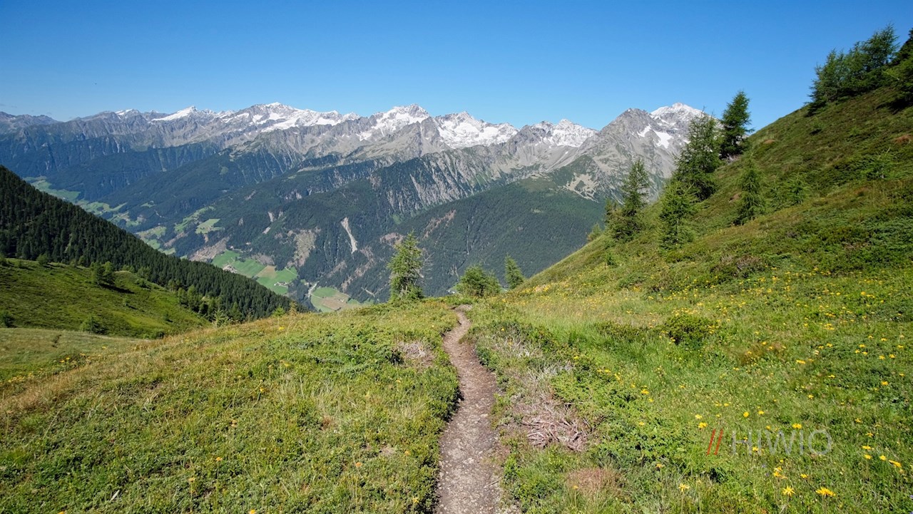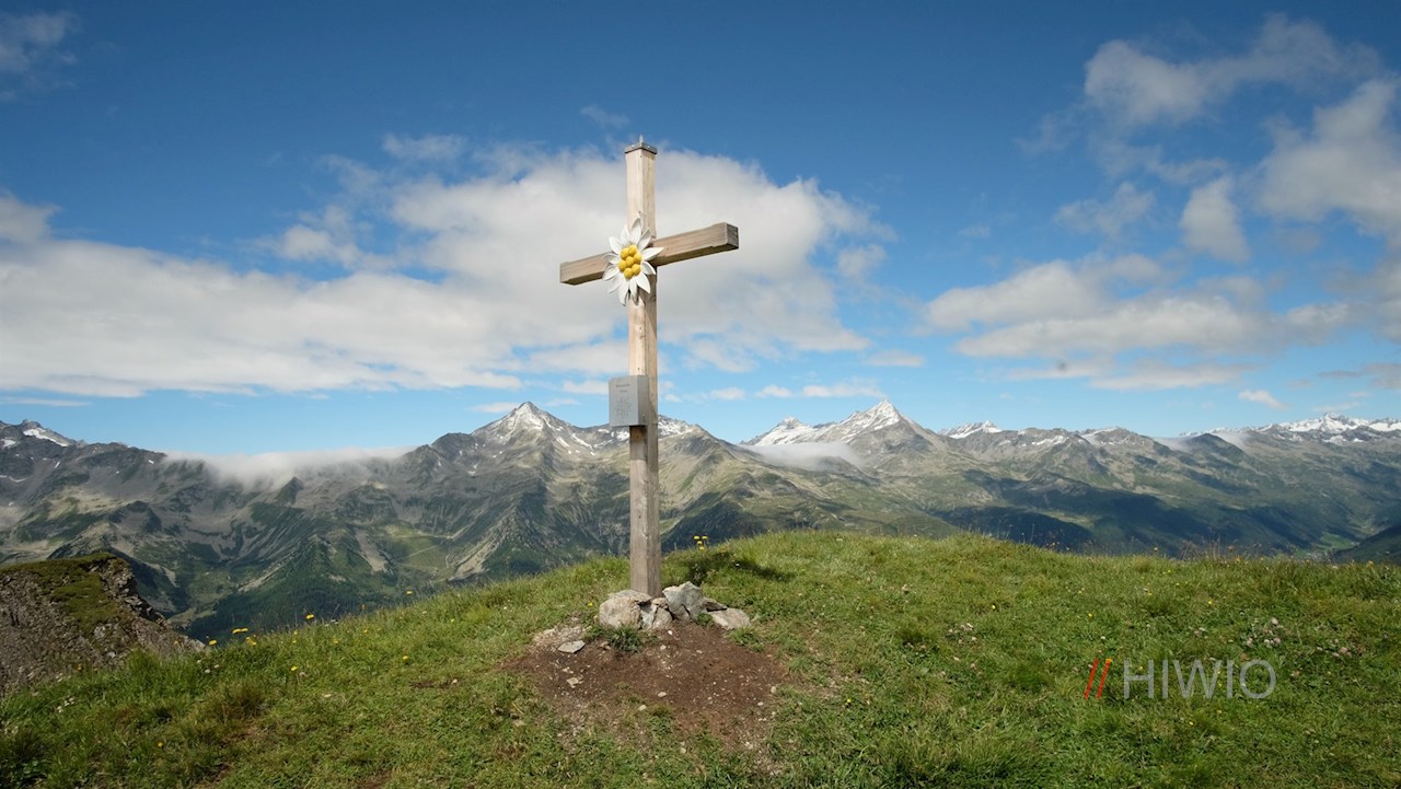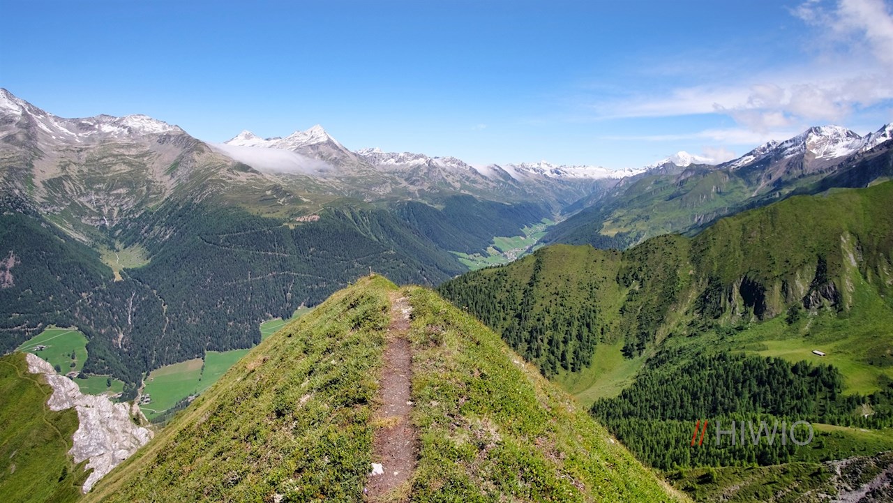 Hinter der Waldgrenze schlängelt er sich durch blumenreiche, recht steil abfallende Bergwiesen zum schlichten Gipfelkreuz des Lutterkopf hoch. Da er bis zum Gipfel mit Gras bewachsen ist, wird er im Volksmund auch „Graskopf“ genannt. Trotz seiner vergleichsweise recht geringen Höhe öffnet er einen atemberaubend schönen Ausblick auf das langgezogene Ahrntal und seine hochaufragende Bergwelt. Selbst die Birnlücke an der Grenze zu Salzburg und die daneben aufstrebende vergletscherte Dreiherrenspitze sind zu sehen. Vor uns erhebt sich indes die bläulich schimmernde Blauspitze.