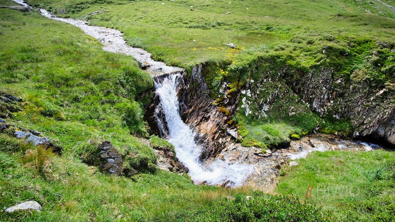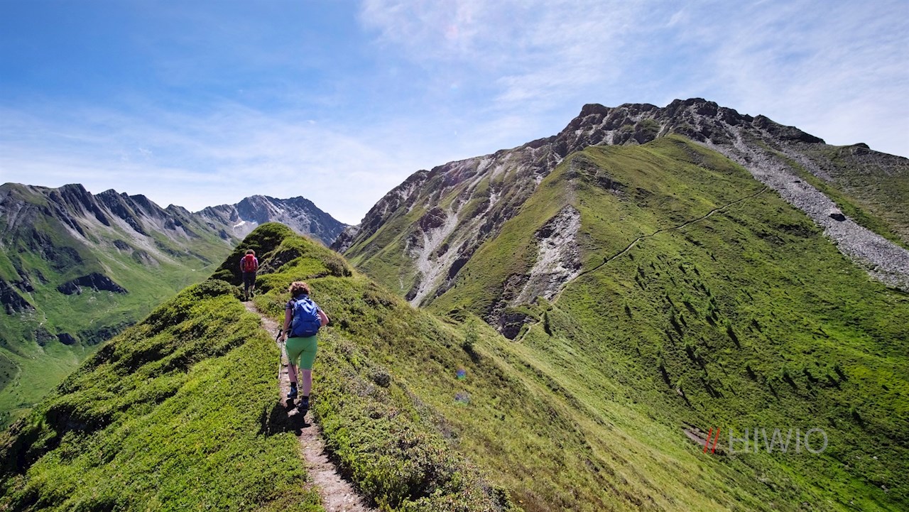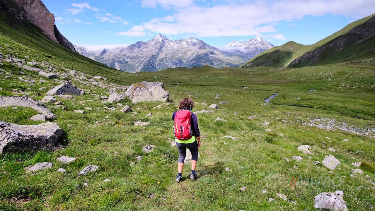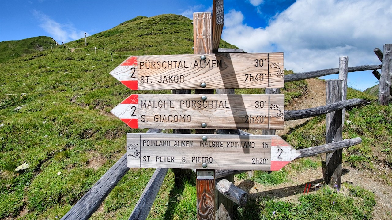 Nach der wohlverdienten Gipfelrast setzt man die Wanderung auf dem schmalen Steig bis zu einem Joch fort. Hier folgt man dem links abzweigenden Weg Nr. 2. Er steigt durch die weiten, vom Poinlandbach durchflossenen Weiden des Poinlandtales ab, in denen eine bunte Vielfalt zarter Bergblumen gedeiht.