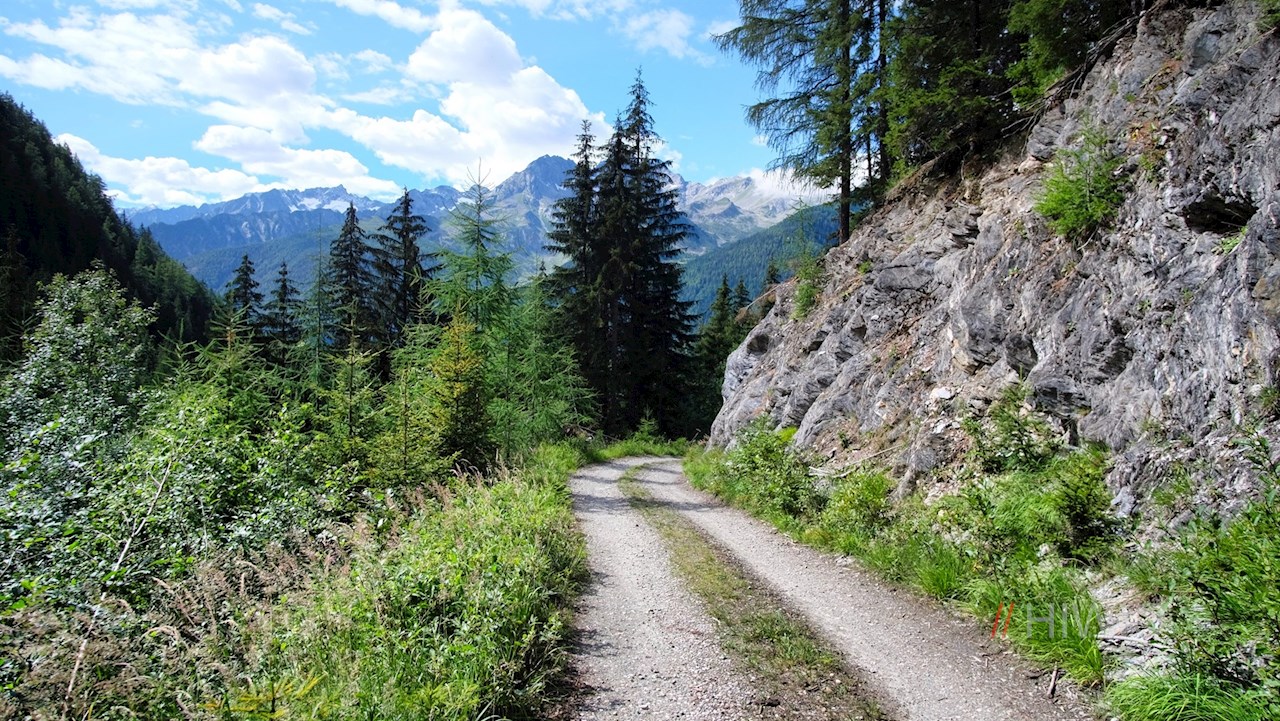 Hier folgt man dem zunächst breiten Forstweg, in den alsbald der von St. Peter heraufführende Wanderweg Nr. 18 mündet. Weiterhin der Wegnummer 18 folgend, steigt der alsbald schmaler werdende Steig über steile Waldhänge an, auf denen sich bereits schöne Ausblicke auf die gegenüberliegende Bergwelt mit dem markanten Rauchkofel öffnen.