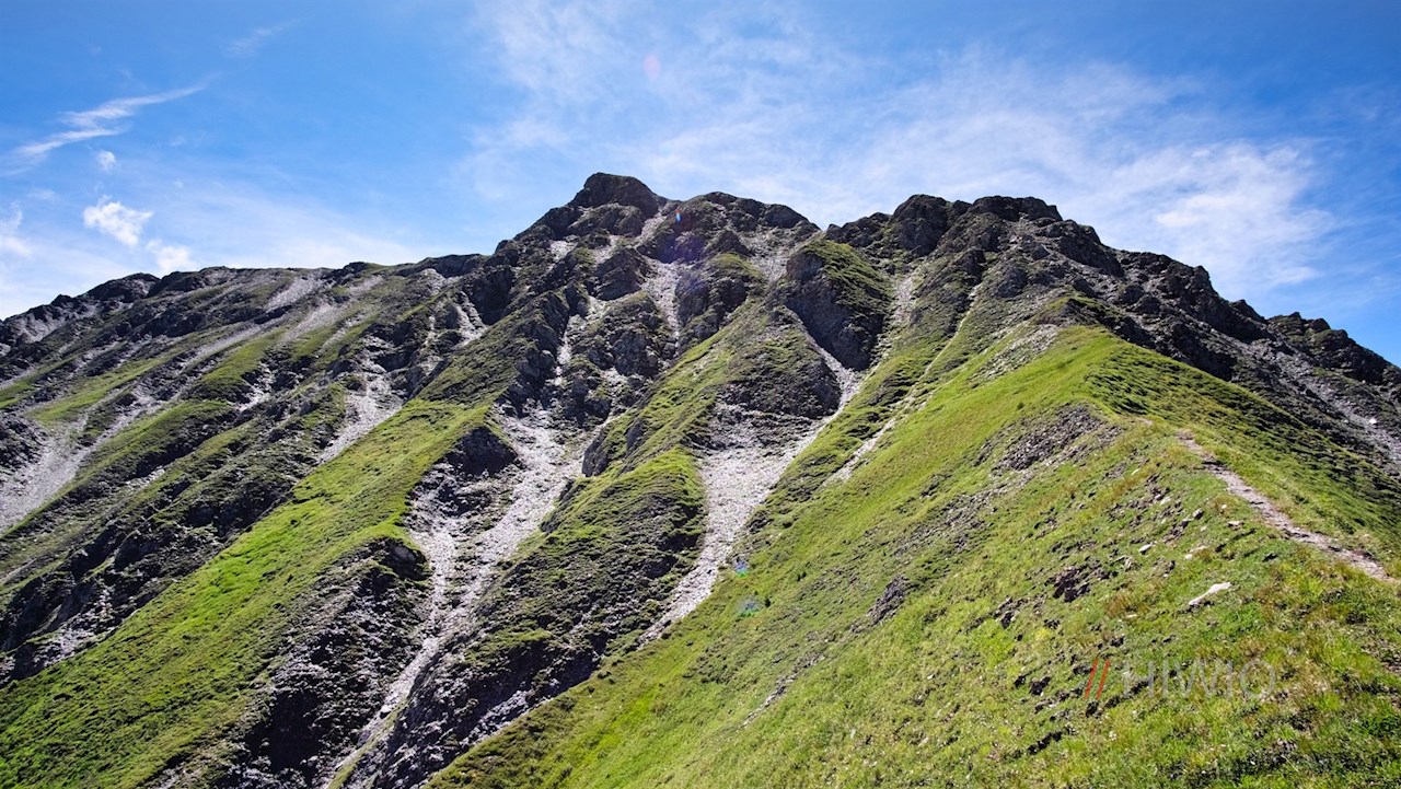 Vor dieser malerischen Kulisse steigt der schmale Pfad über einen Graskamm und den teils felsigen Gipfelaufbau auf den Gipfel der Blauspitze an. Unterwegs gilt es, einige leicht ausgesetzte Passagen zu überwinden, die dank der angebrachten Seilsicherungen für berggewohnte Wanderer kein Problem darstellen dürften.