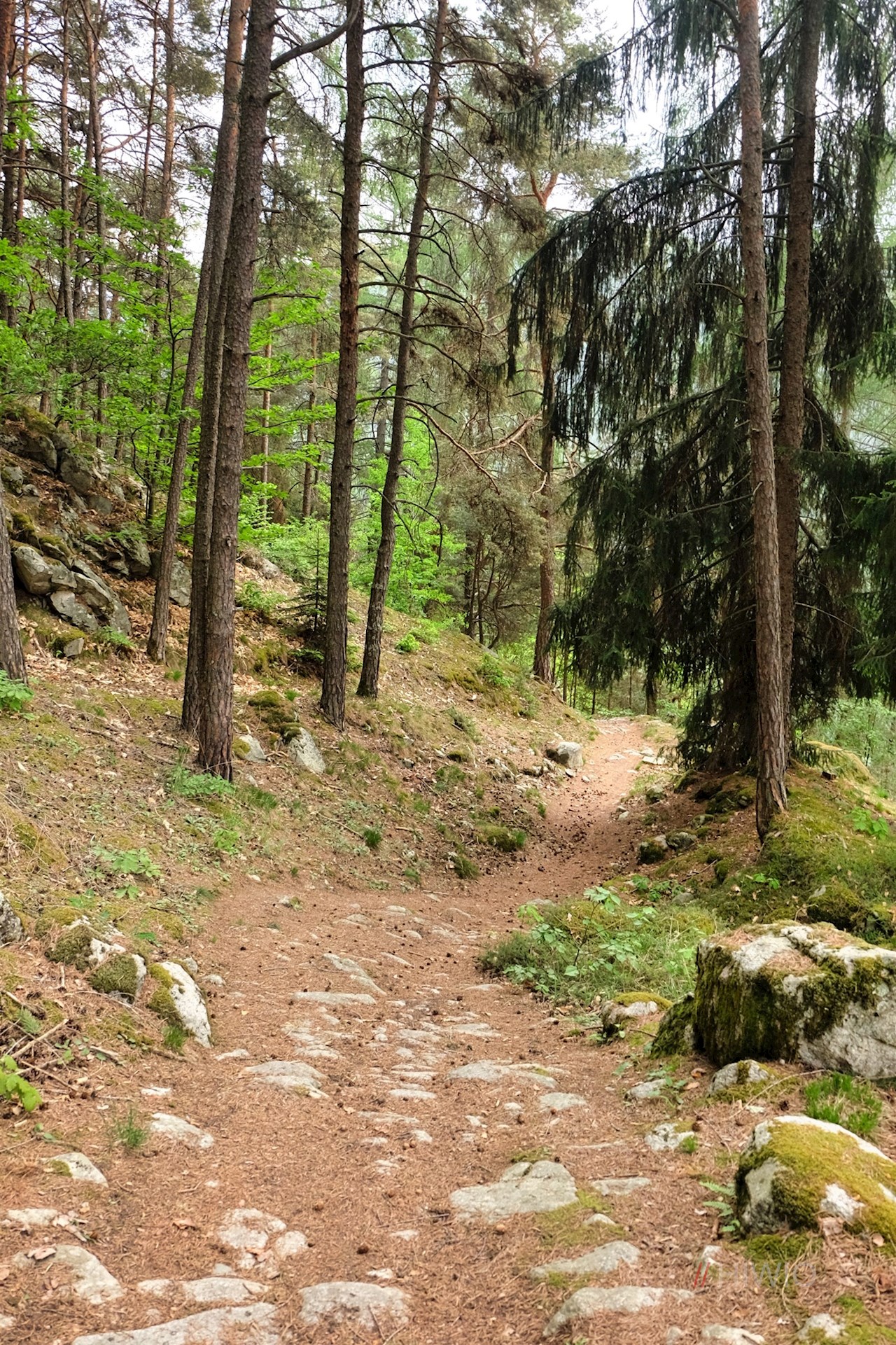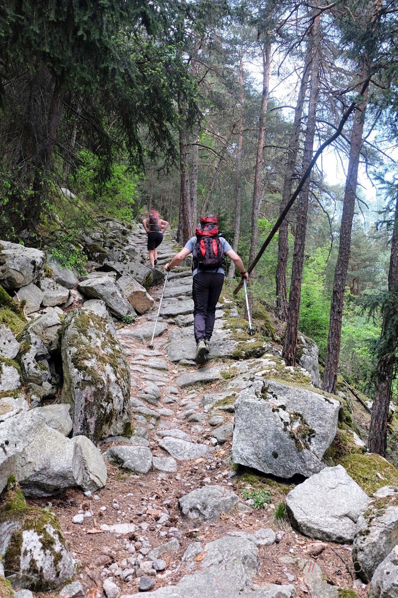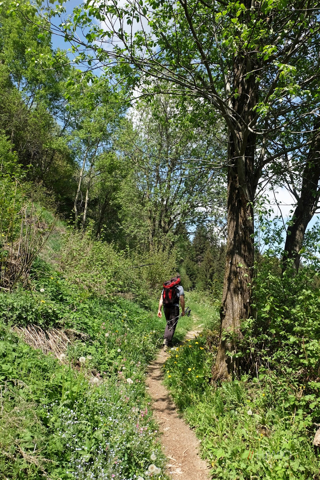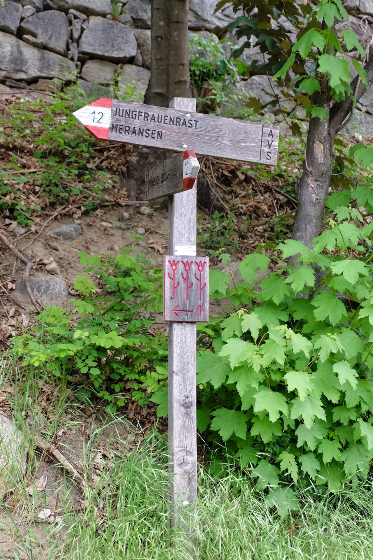 Der Beschilderung Nr. 12 in Richtung Jungfrauenrast / Meransen folgend, wandert man zunächst zum Dorfrand hoch. Hinter dem letzten Hof taucht der teils gepflasterte Wanderweg in einen lichten Mischwald ein, durch den er sich im steten, mitunter ziemlich steilen Anstieg windet. Unterwegs öffnen sich immer wieder schöne Ausblicke auf das nunmehr tiefer liegende Mühlbach und die gegenüberliegende Plose.